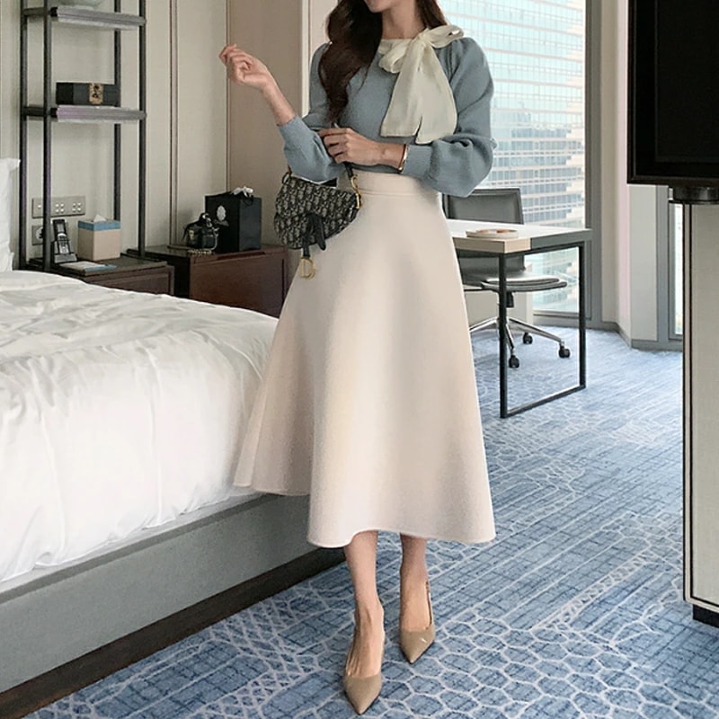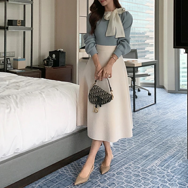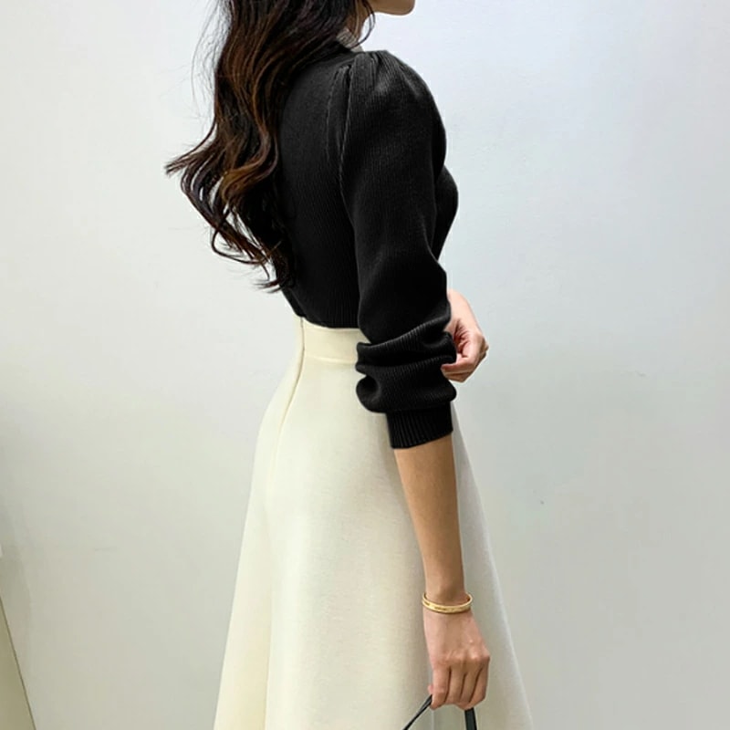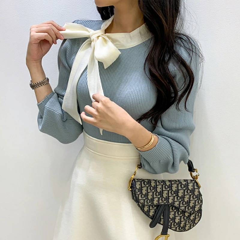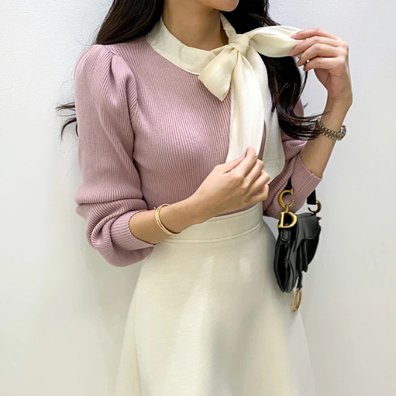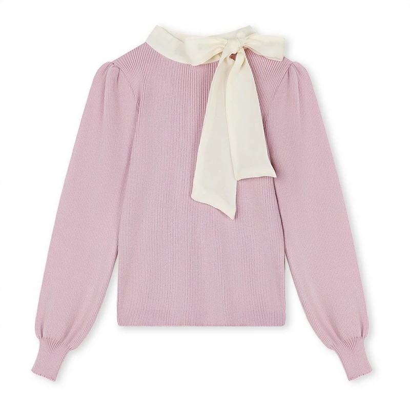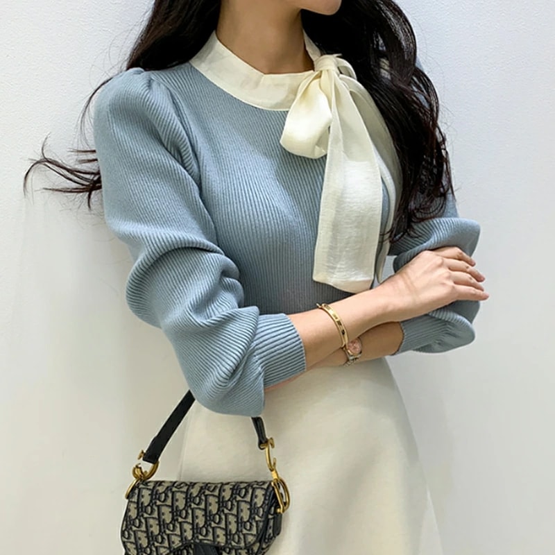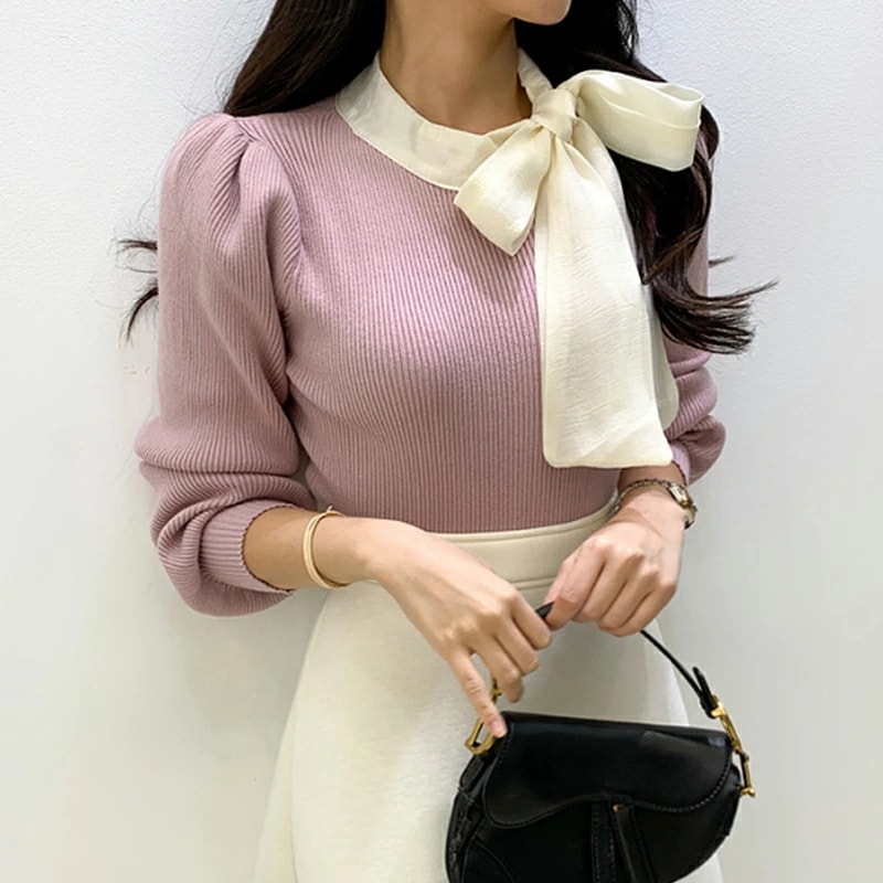パフスリーブニット リボンタイ リブニット ニット パフスリーブ 長袖 レディース リボン ボウタイ トップス ボリューム袖 パワショル きれいめ ハイネック バイカラー