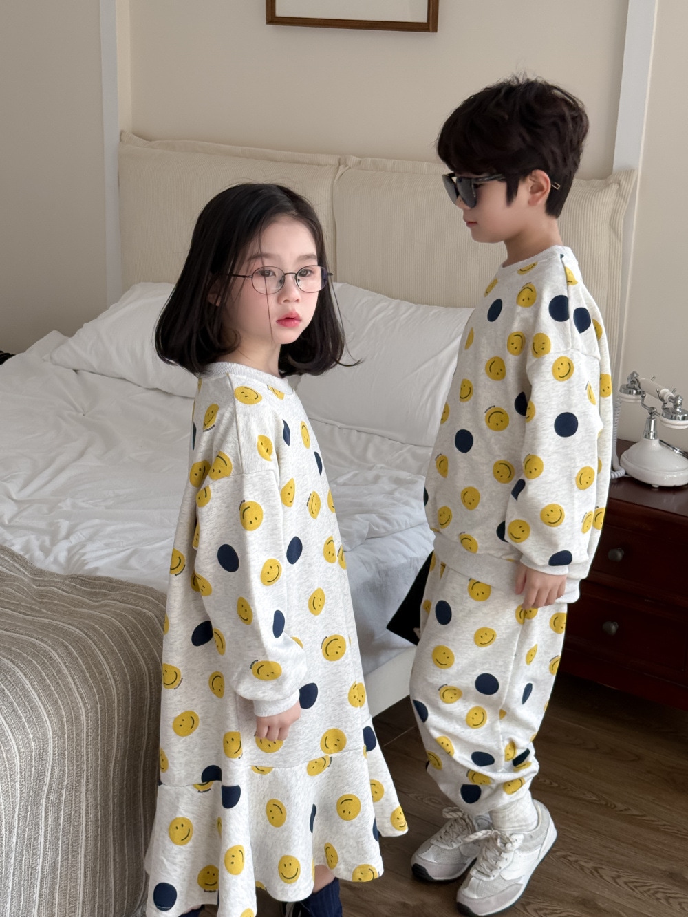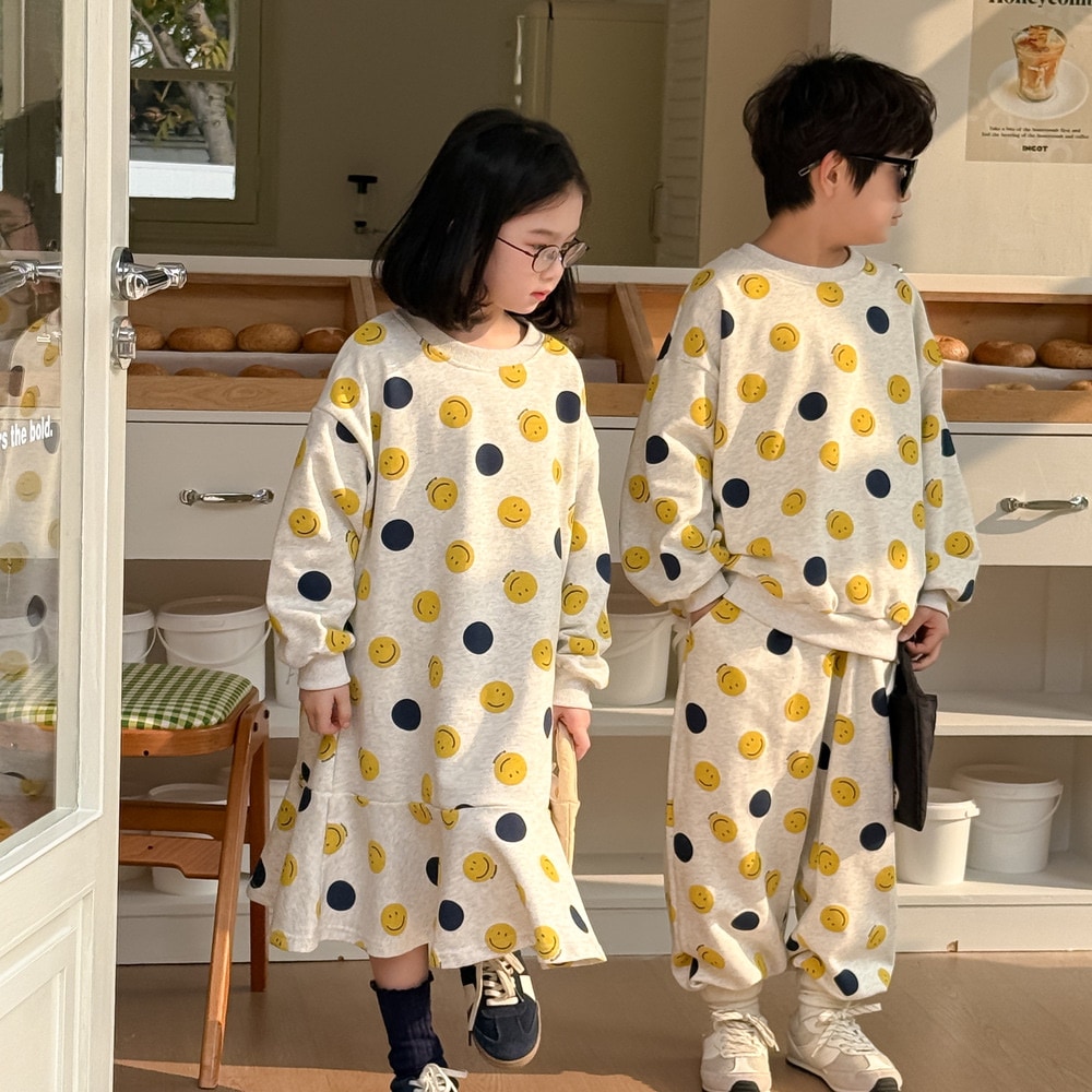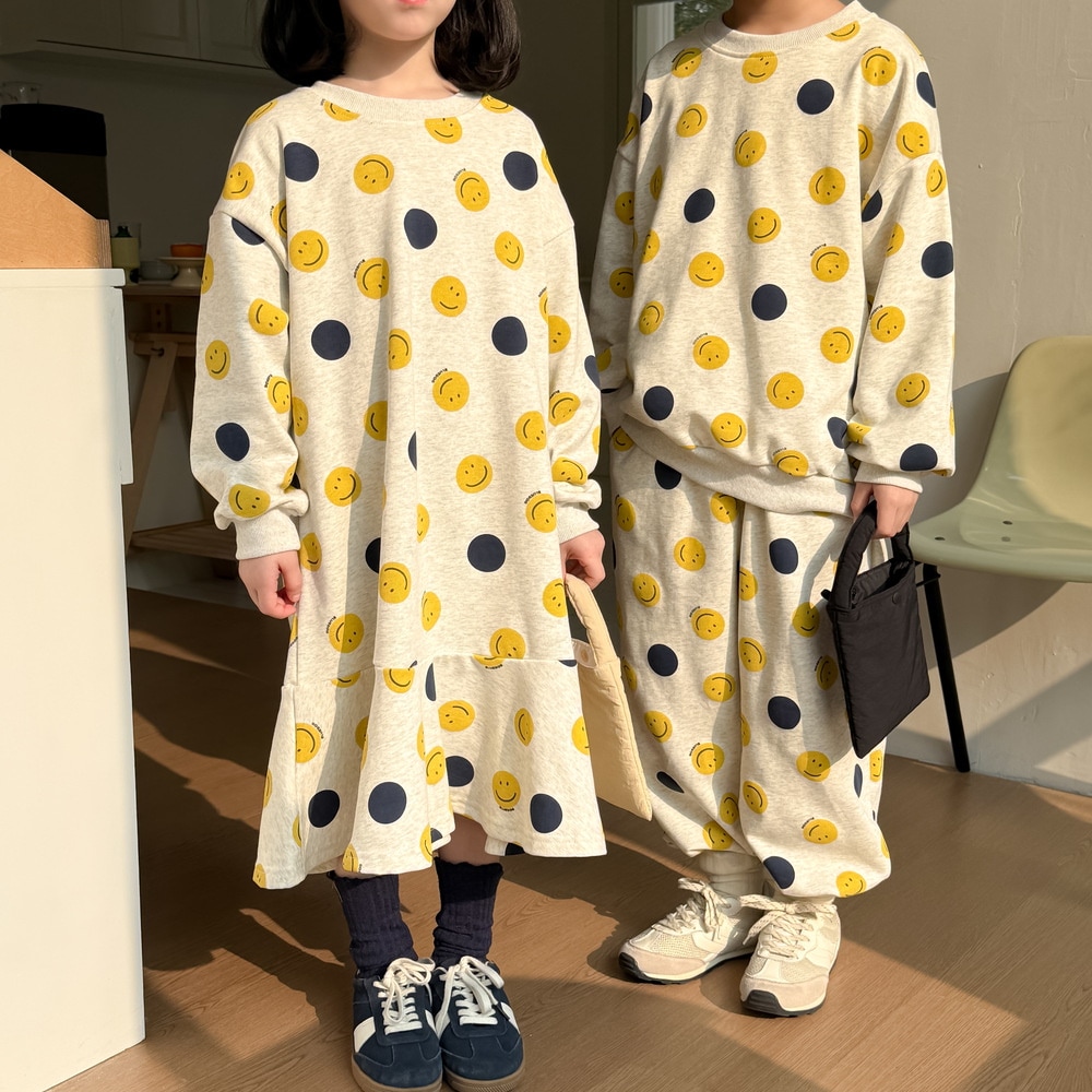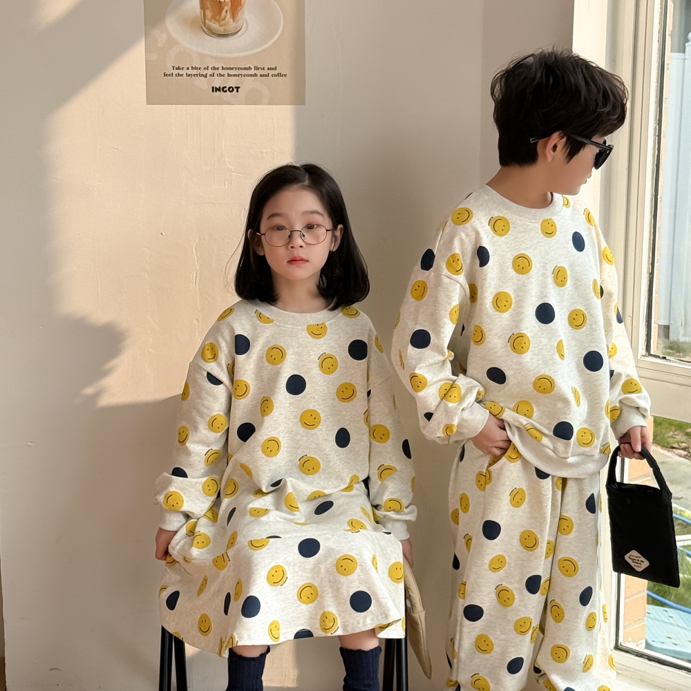 キッズスーツ2025春モデル男の子と女の子の韓国版満印笑顔のロンTセット子供丸首カジュアルロンTスカート 子供服 男の子 セットアップ 子供服 女の子 ワンピース