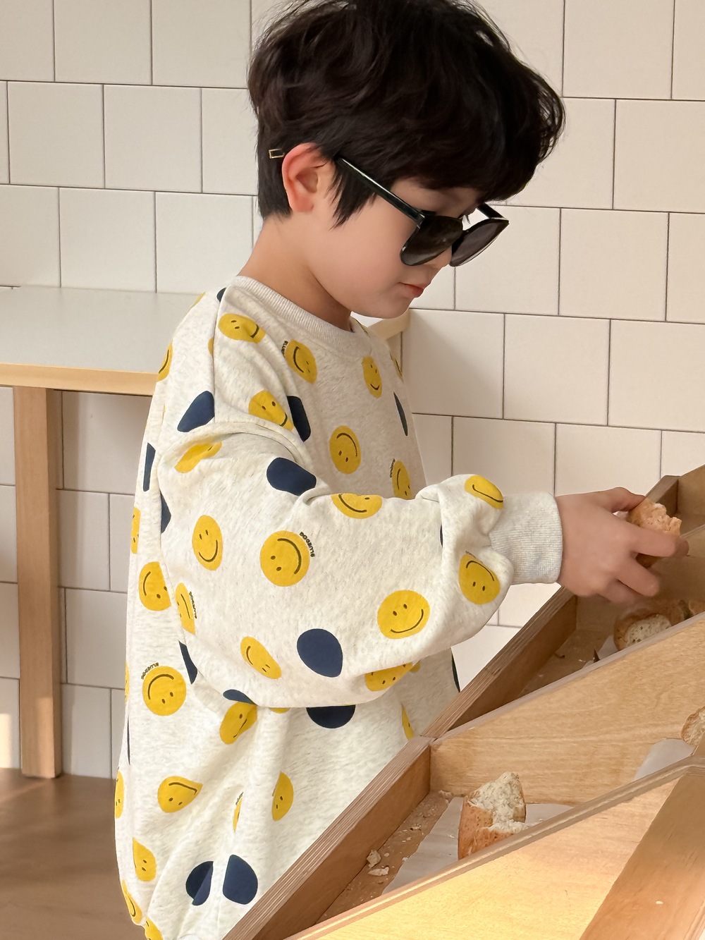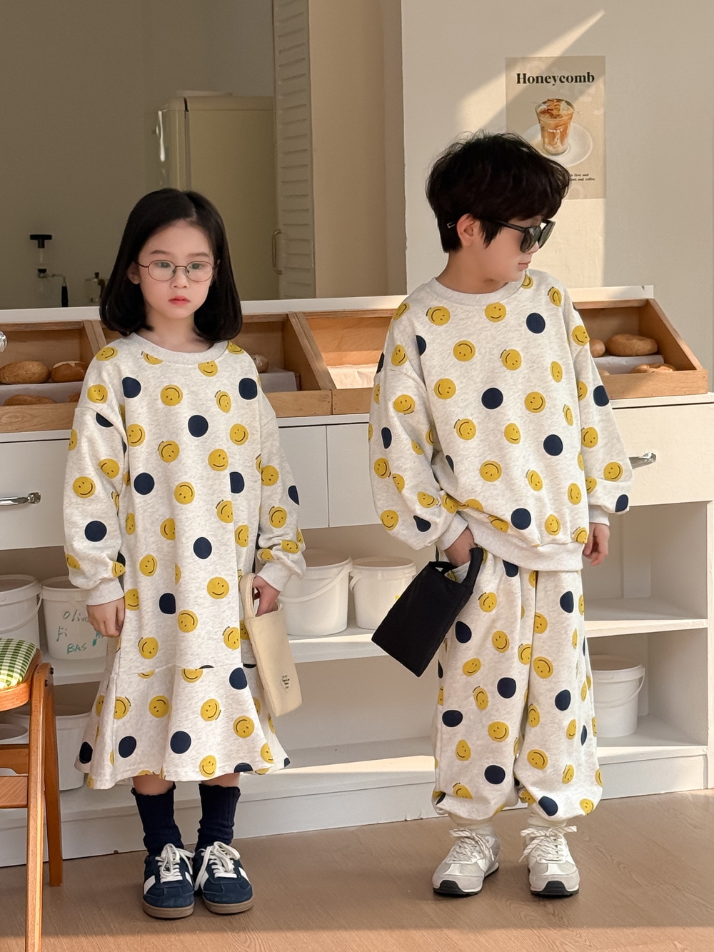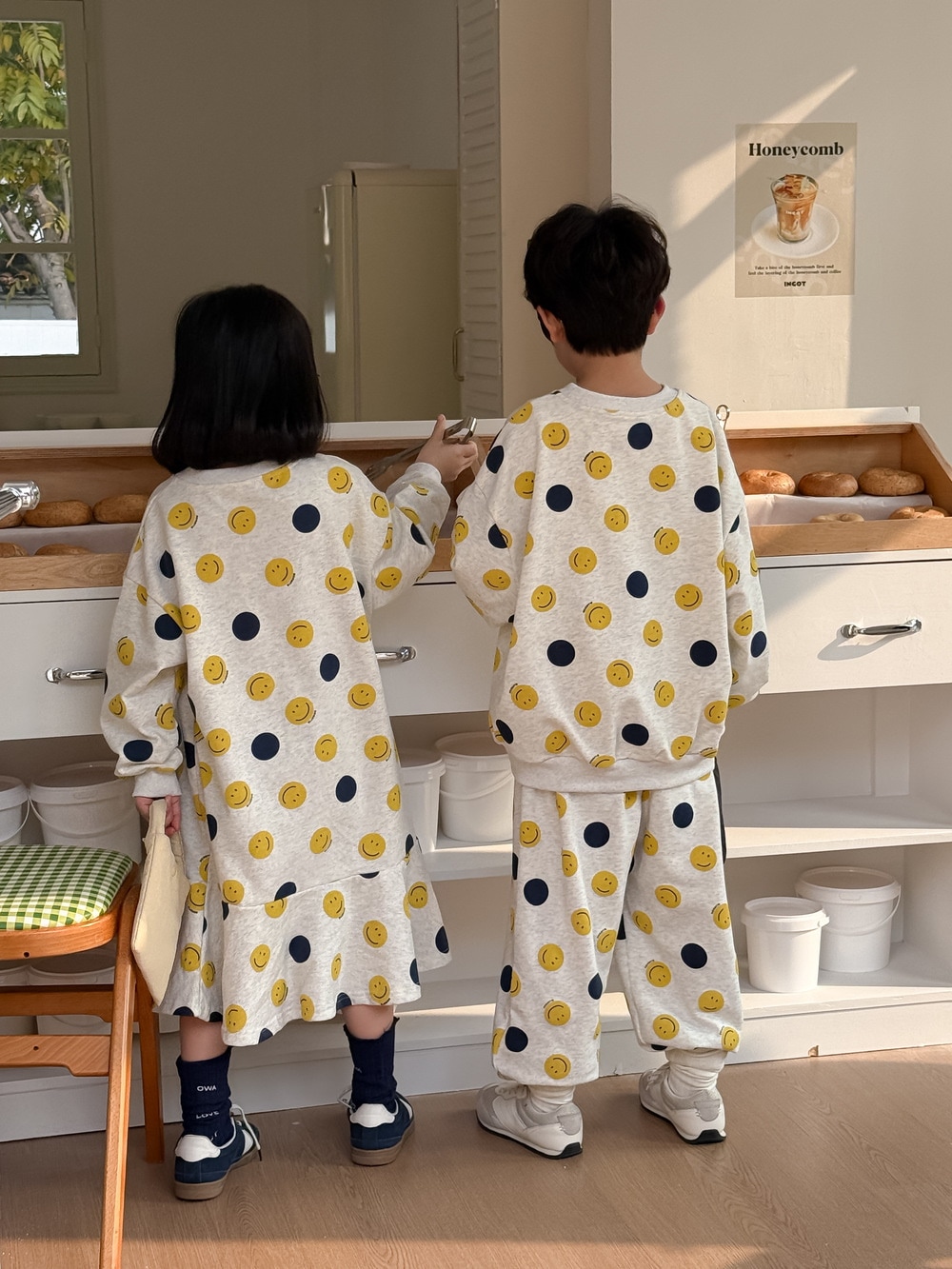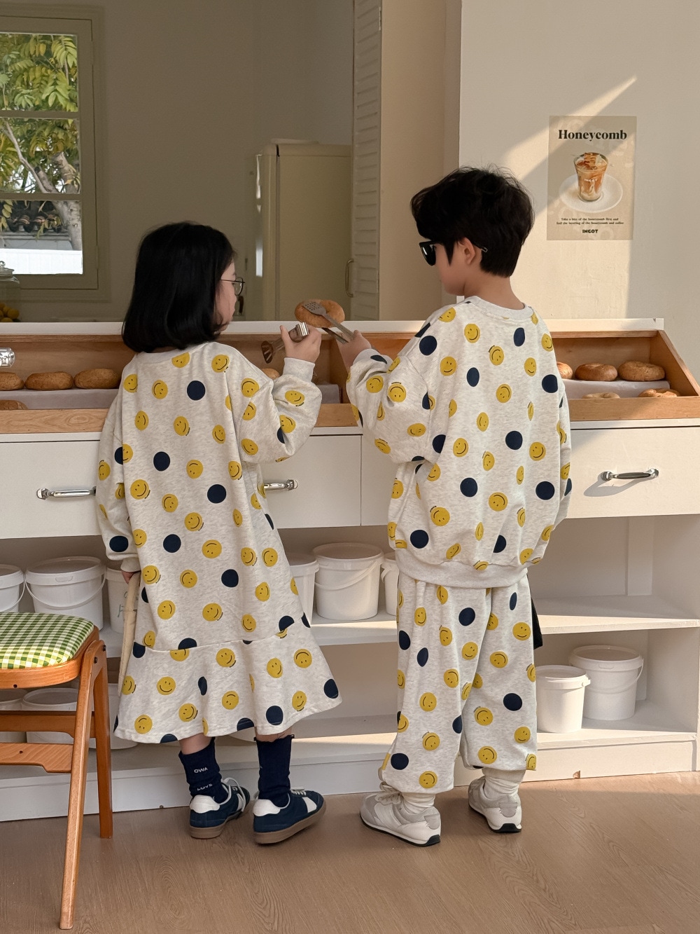 キッズスーツ2025春モデル男の子と女の子の韓国版満印笑顔のロンTセット子供丸首カジュアルロンTスカート 子供服 男の子 セットアップ 子供服 女の子 ワンピース