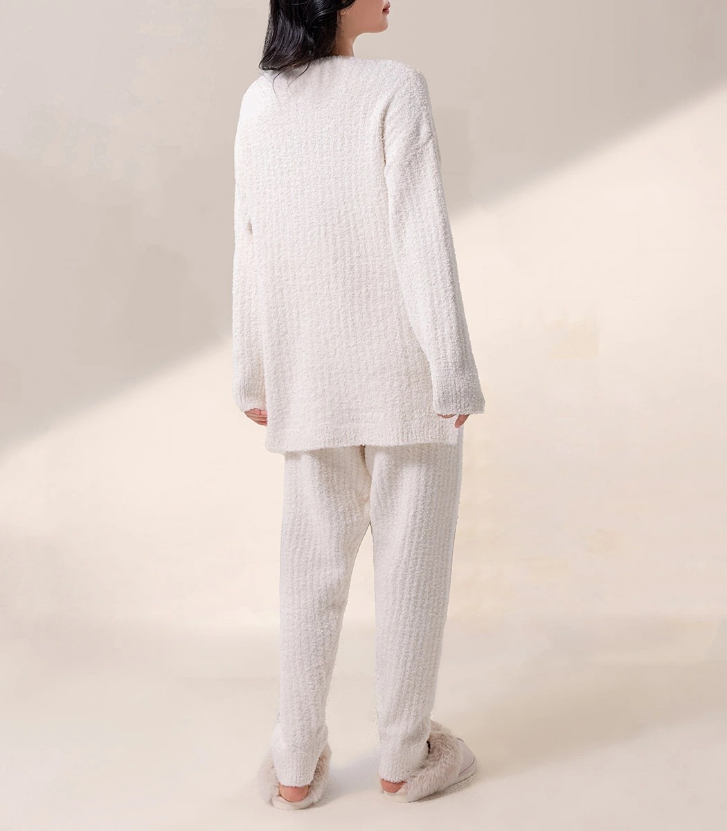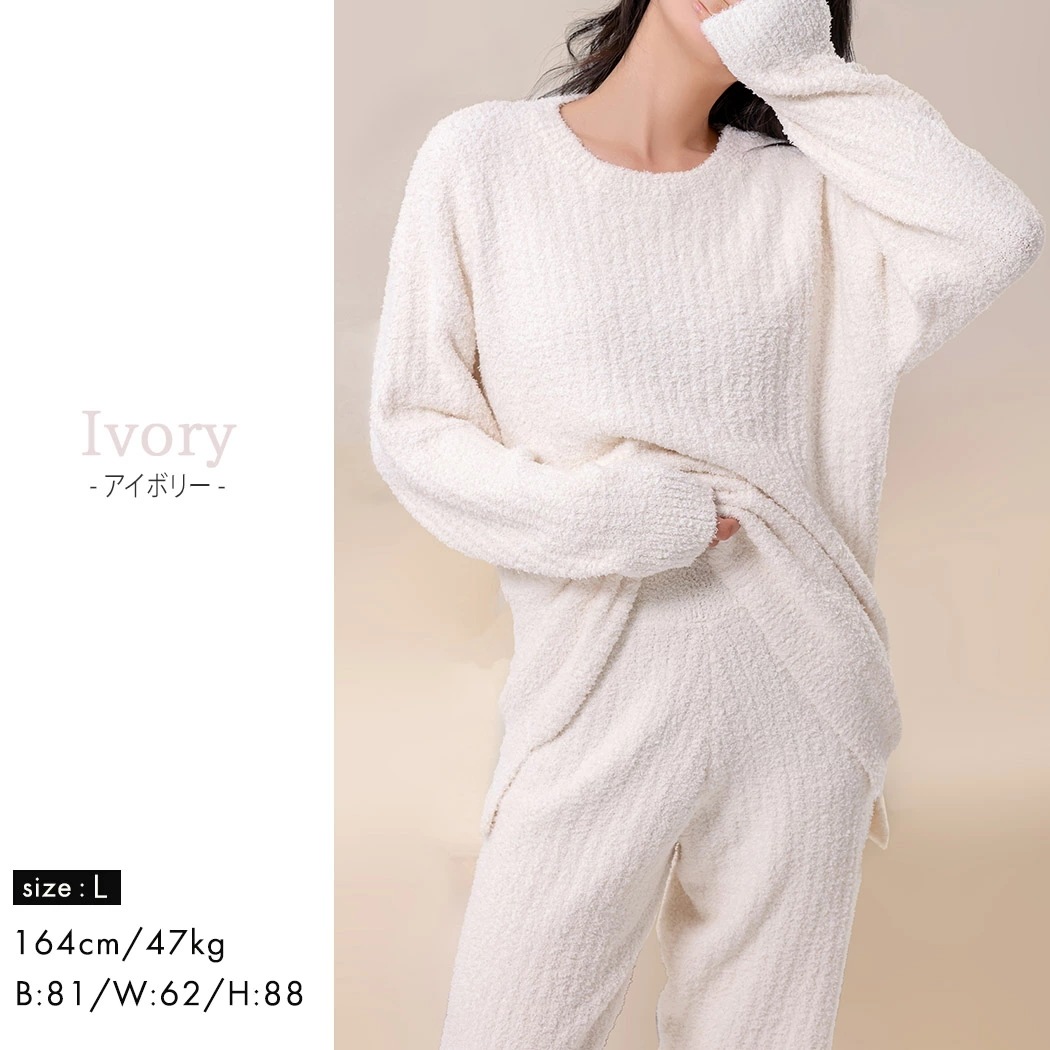 ,ルームウェア レディース 長袖 上下セット モールニット 起毛 パジャマ 寝巻き 部屋着 セットアップ プルオーバー トップス パンツ 腹巻き 一体型 ストレッチ 保温 吸湿性 静電気防止 通気性