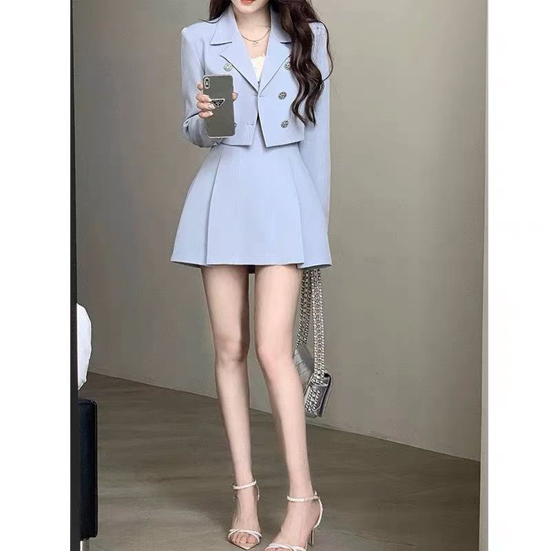 2024年春の女性韓国版新作涼しく楽ちんセットアップヘイズブルー小香風ショートスーツジャケットハイウエストハーフスカートスーツ セットアップ