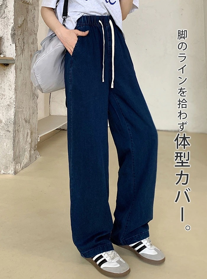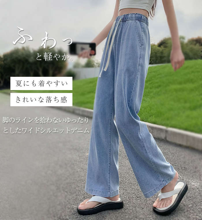 ワイドパンツ レディース デニム パンツ 大きいサイズ ひんやり ガウチョ デニムワイドパンツ UVカット 春 きれいめ ボトムス ゆるパンツ 薄手 夏 ウエストゴム 着痩せ 美脚 通勤 ゆったり 可