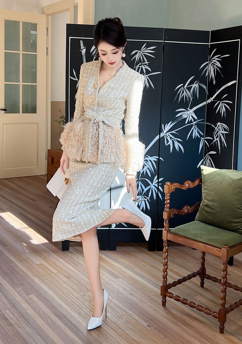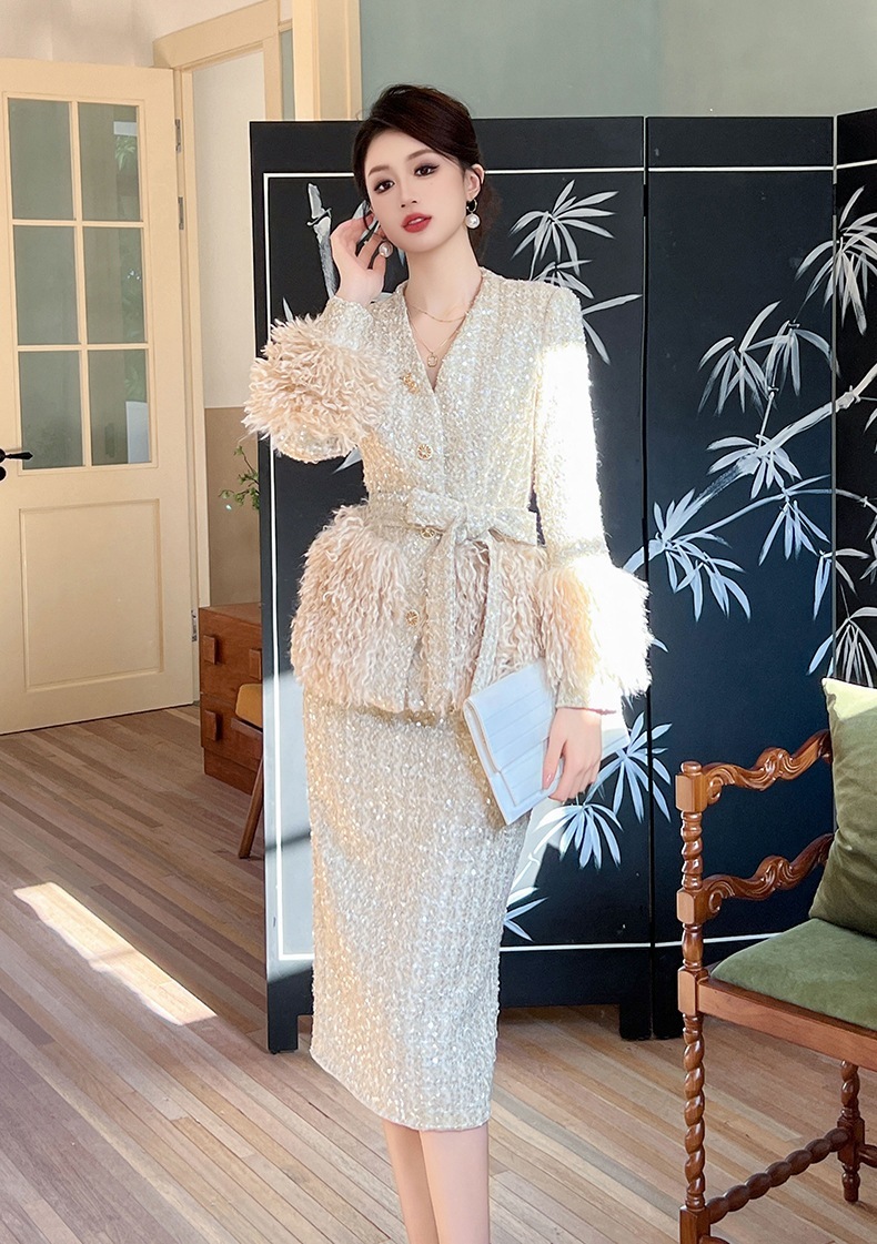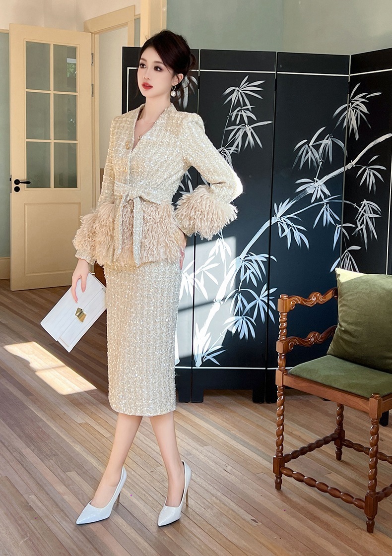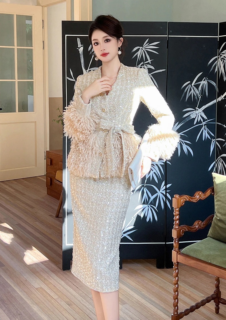 上下2セット ラジャー キラキラ ジャケット+スカート 冬 厚手 ファー飾り レディース セットアップ セットアップ