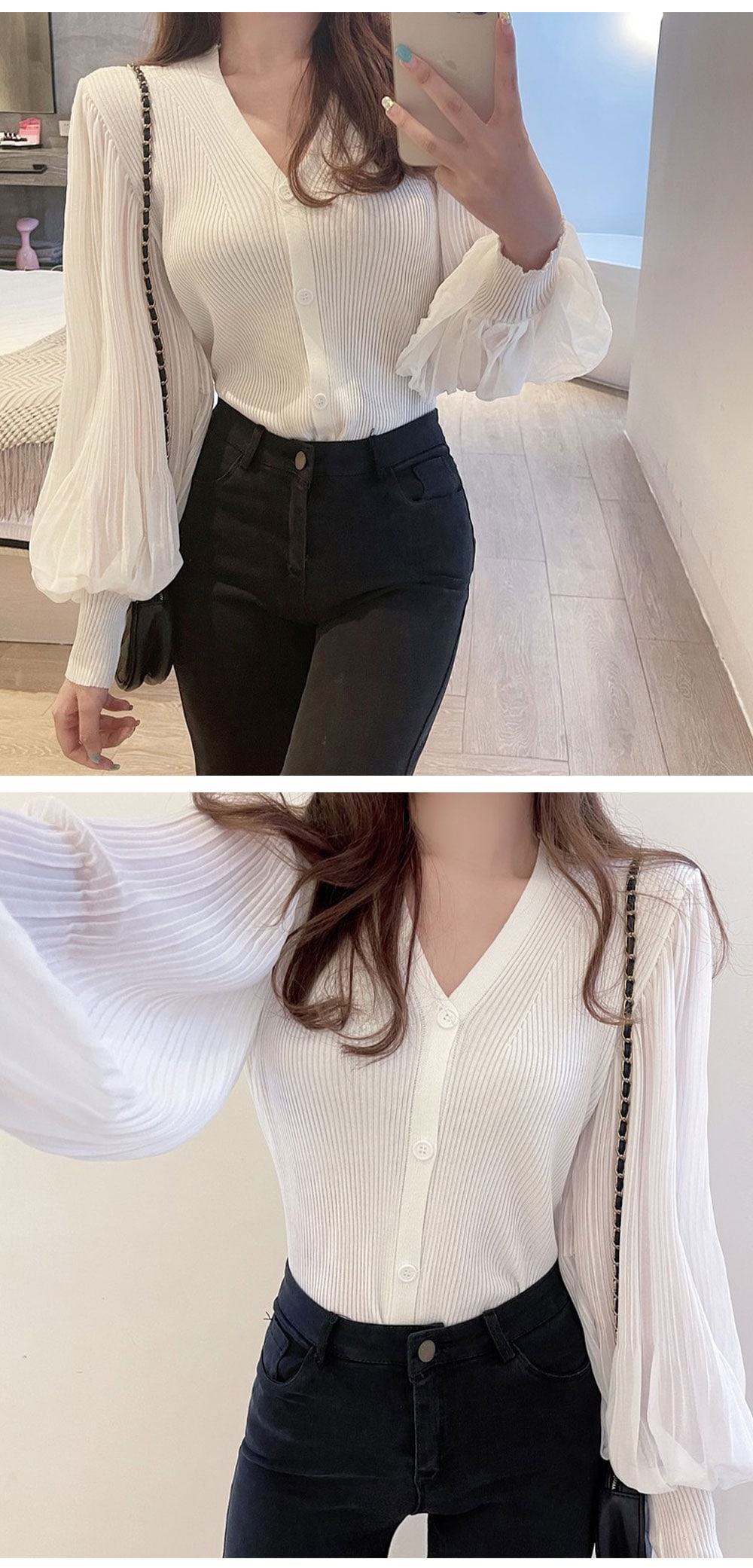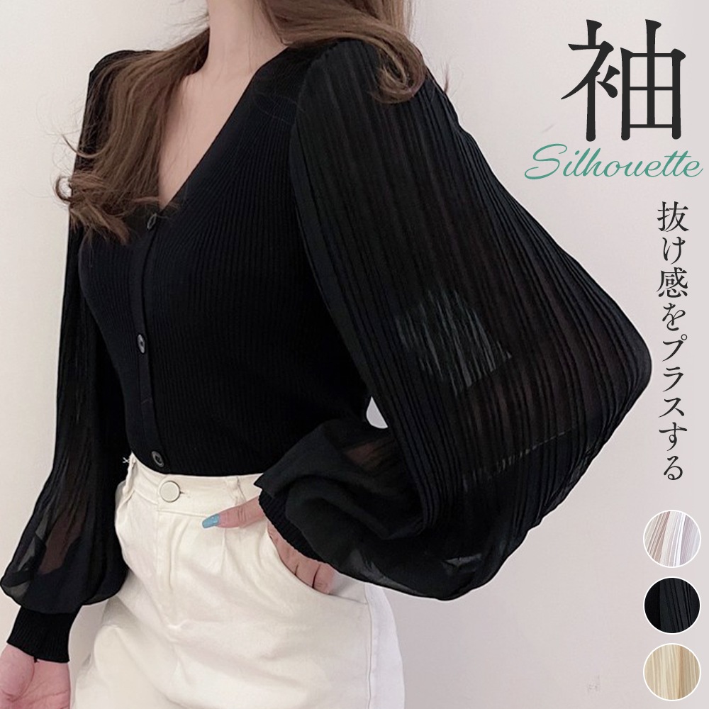 春 秋 長袖 ブラウス ニット ドッキング トップス レディース 切り替え シアー袖 ボリューム袖 レイヤード風 重ね着風 ニットトップス プルオーバー 薄手 ボタン付き 大人 かわいい