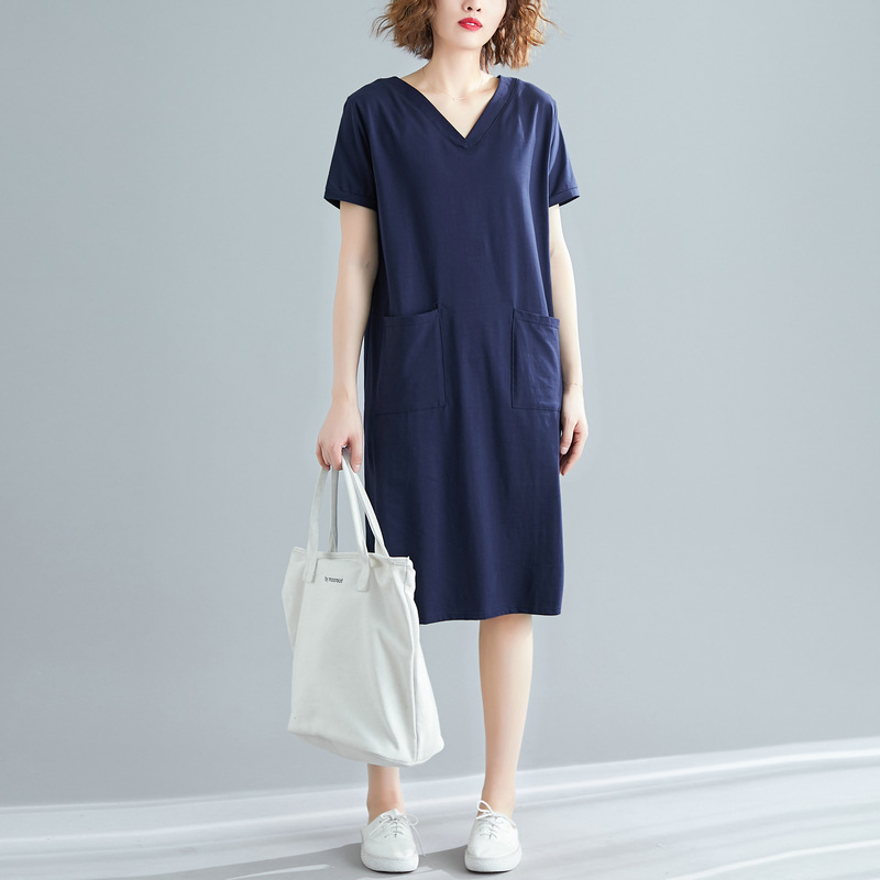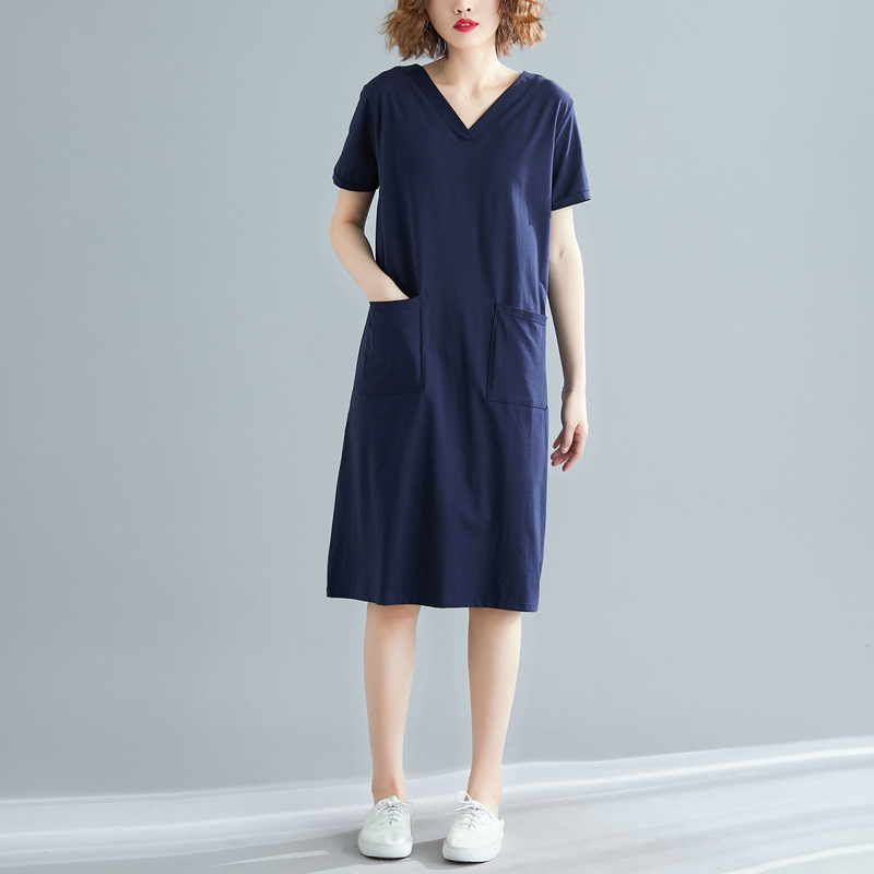 ミディアムレングスのTシャツドレスソリッドカラーVネック半袖ドレスの春と夏のルーズな韓国語バージョン その他 ワンピース ドレス
