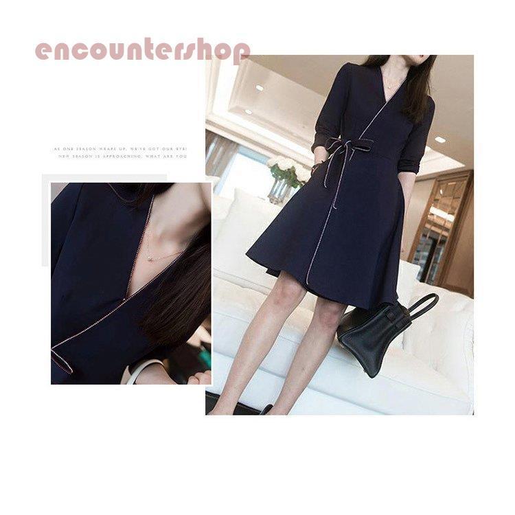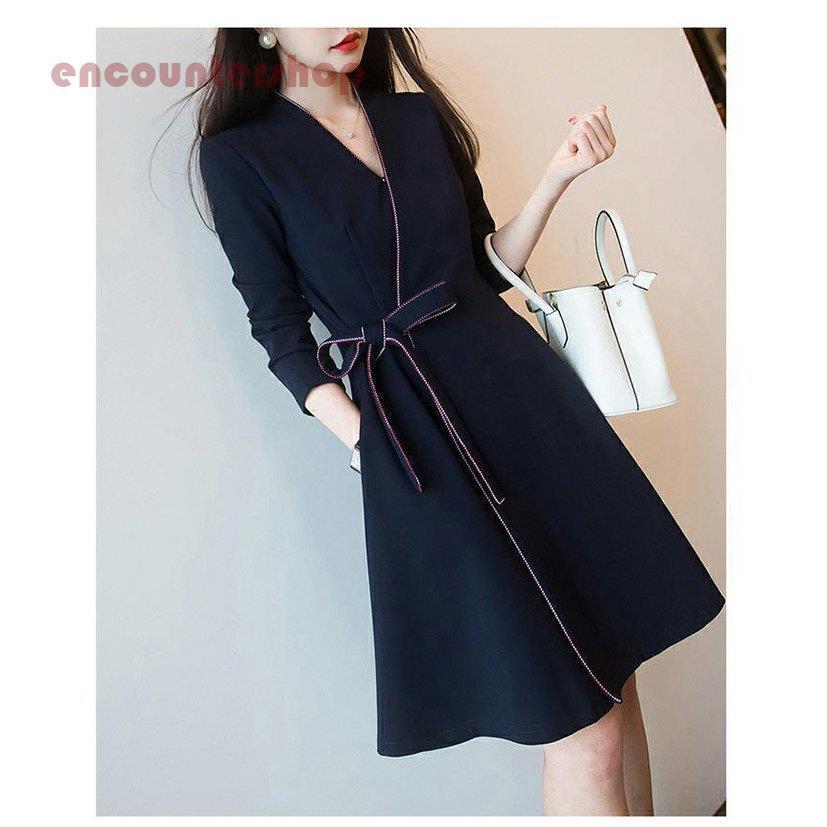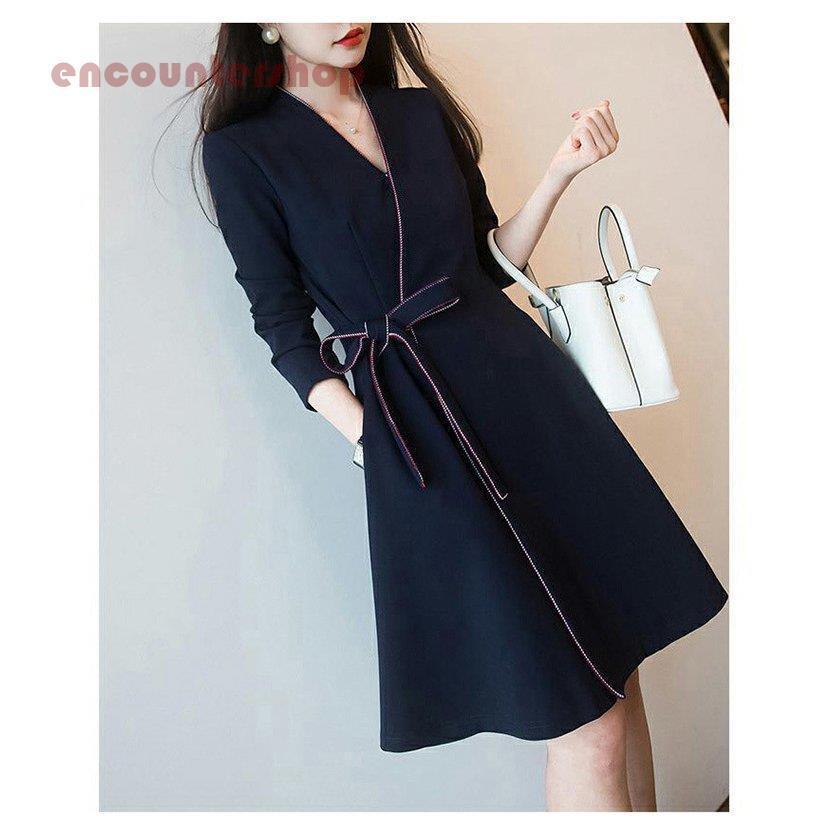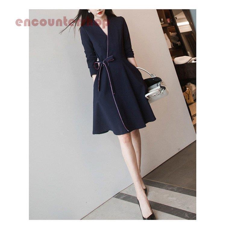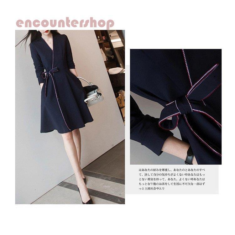 ワンピース レディース 40代 膝丈ンピース 春夏秋新作 きれいめ 長袖ワンピース 黒vネック リボン フレアスカート ひざt丈 オシャレ大人 上品 30代 50代