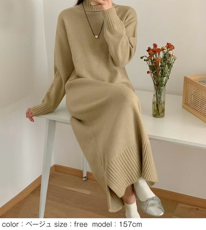 ニットワンピース ニット ワンピース タートルネック ハイネック 長袖 ロングワンピース ロング マキシ丈 レディース 無地 リブニット きれいめ レイヤード 体型カバー 着痩せ 大きめ 大きいサイズ