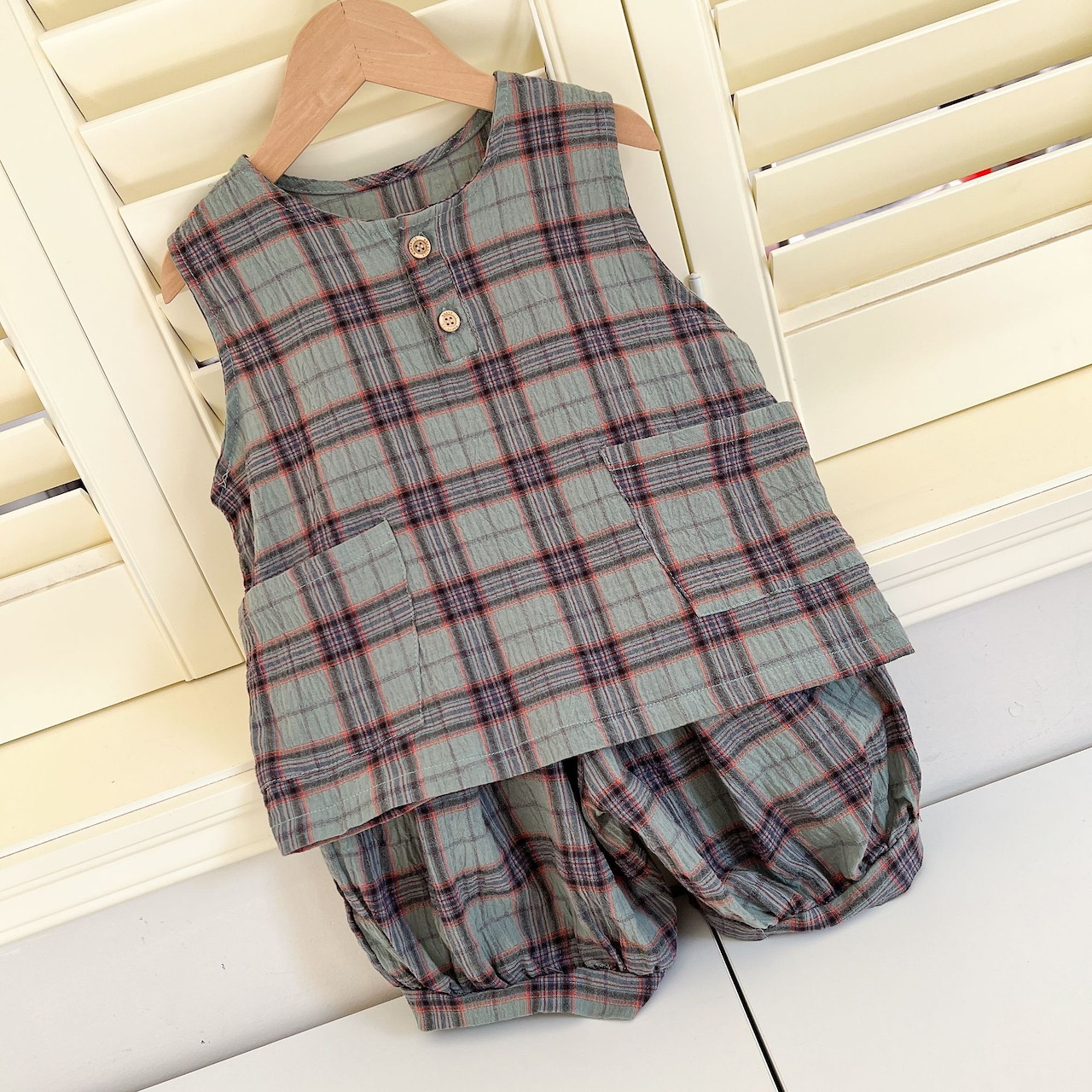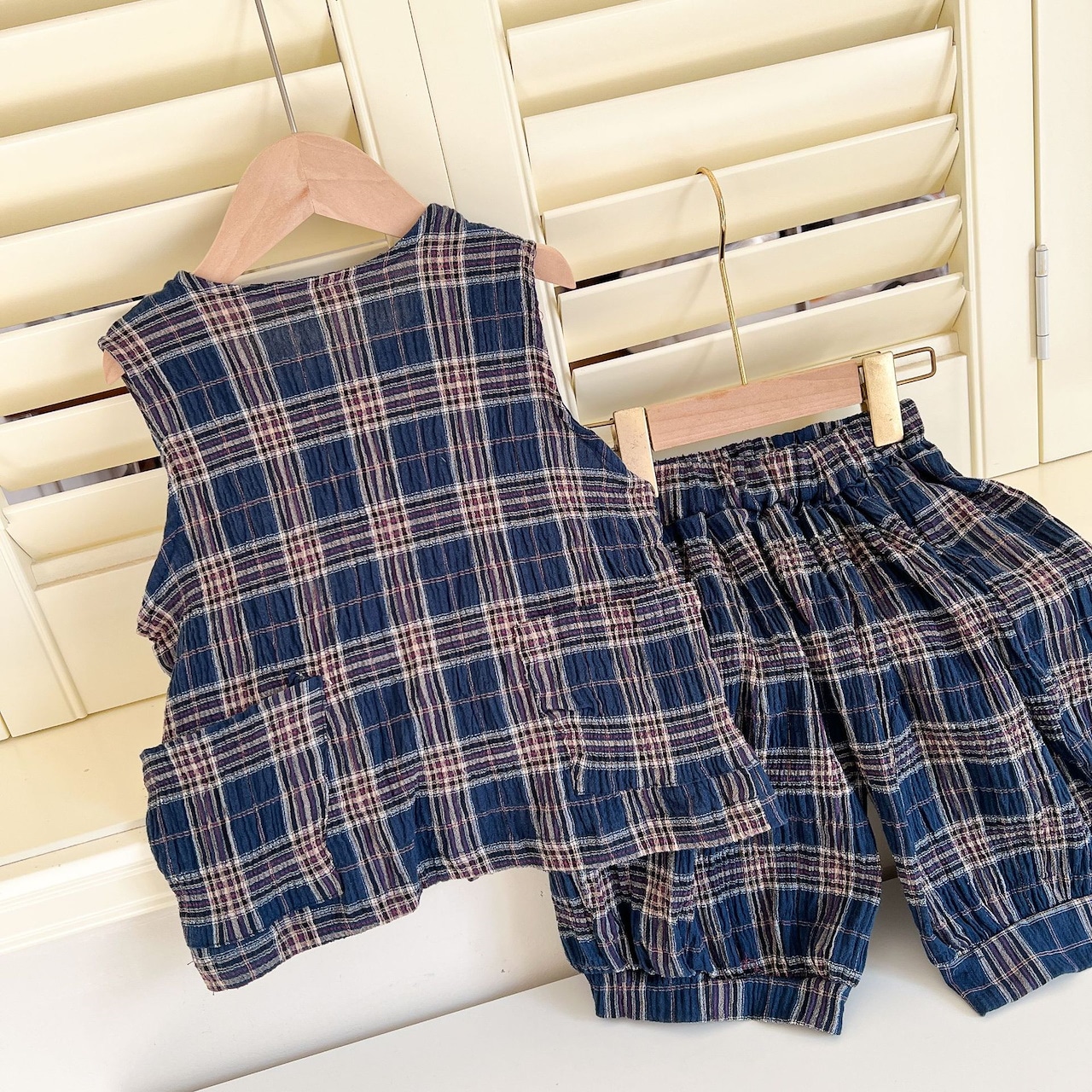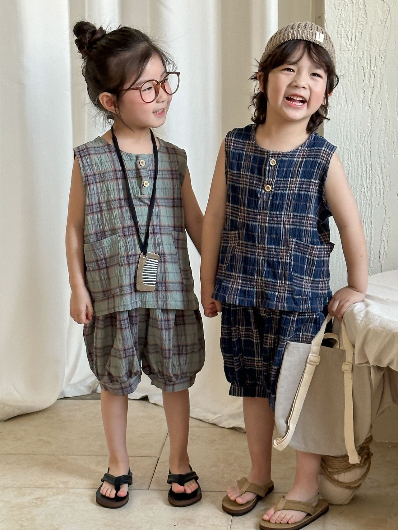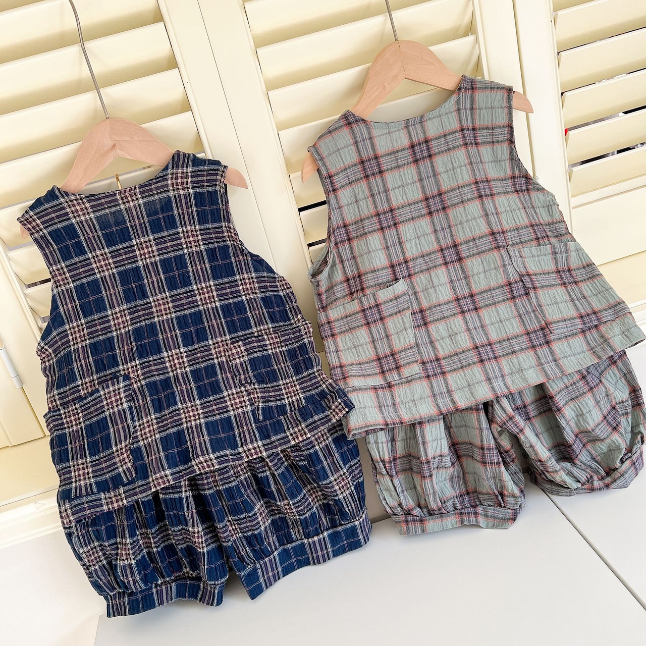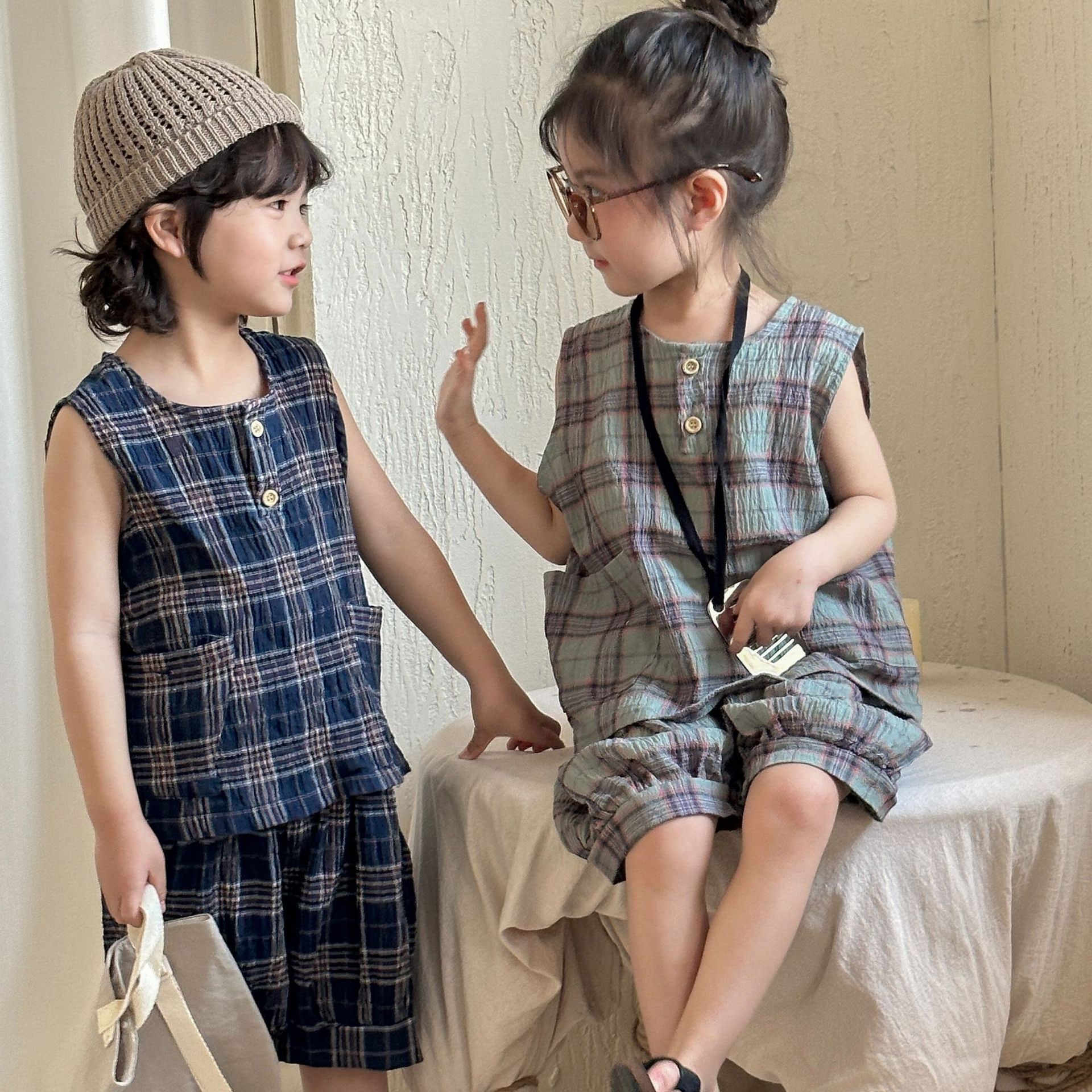 子供のサマースーツ純綿薄手の女の子格子カジュアル2025新型男児ベスト半ズボン赤ちゃん服 子供服 女の子 セットアップ 子供服 男の子 セットアップ