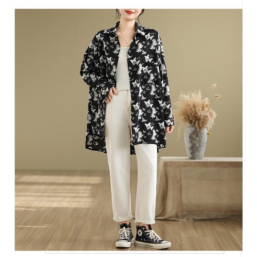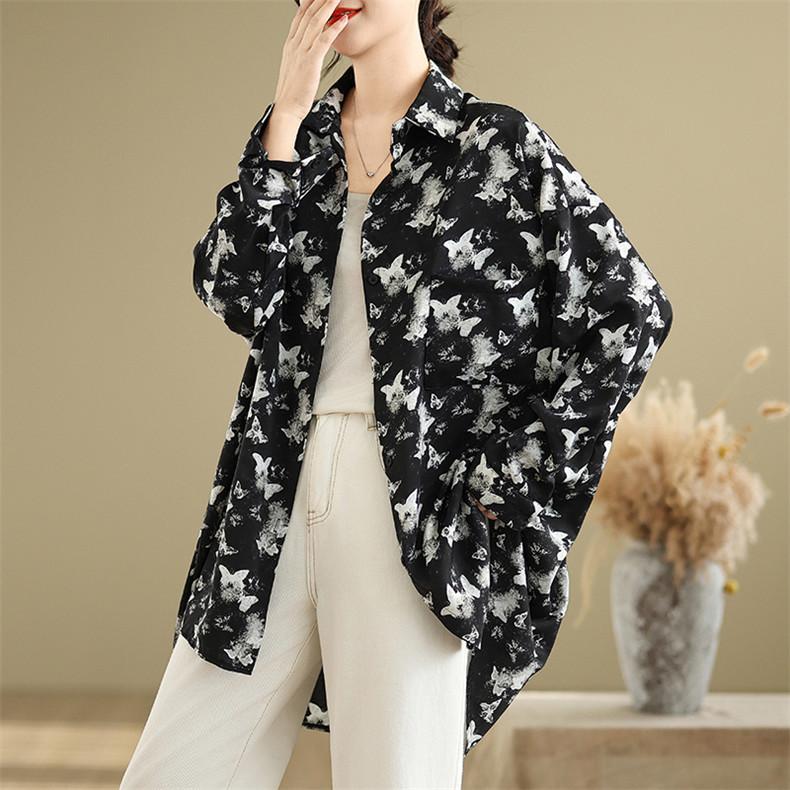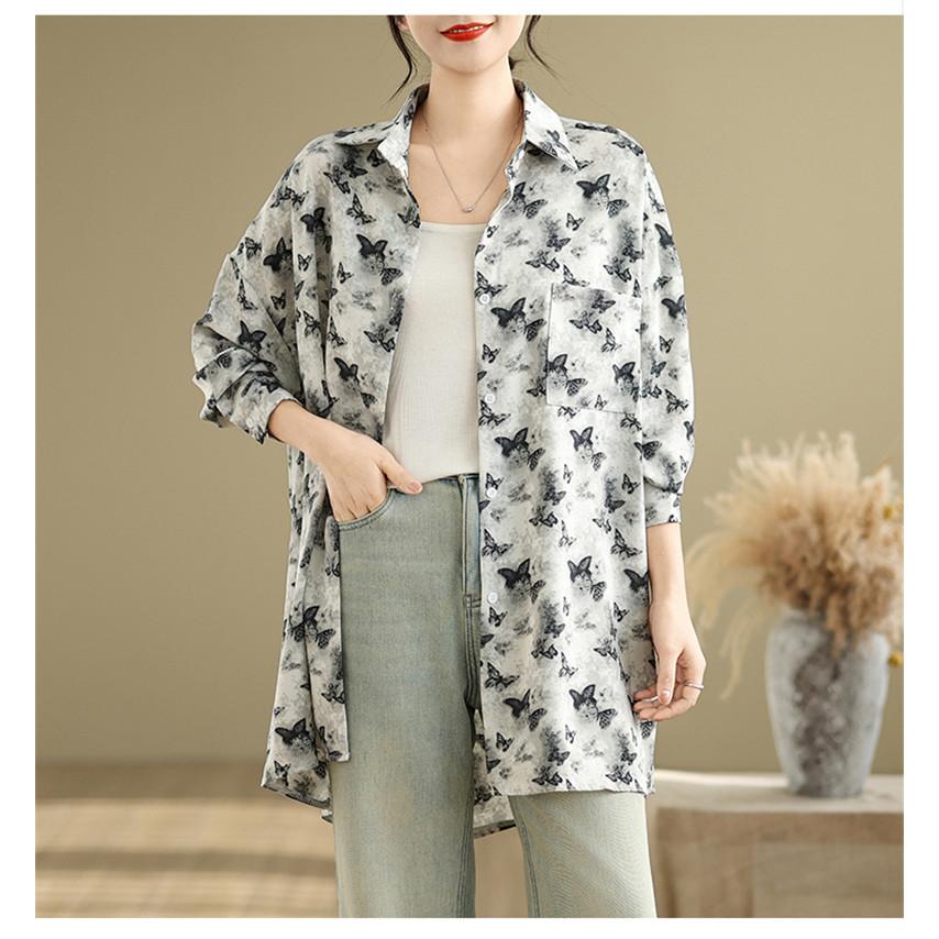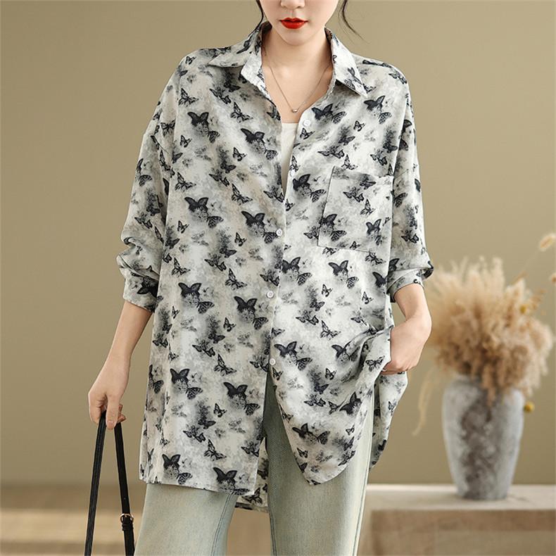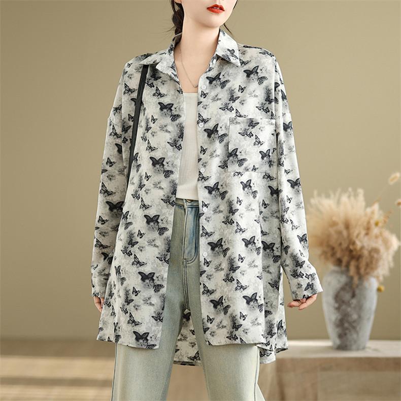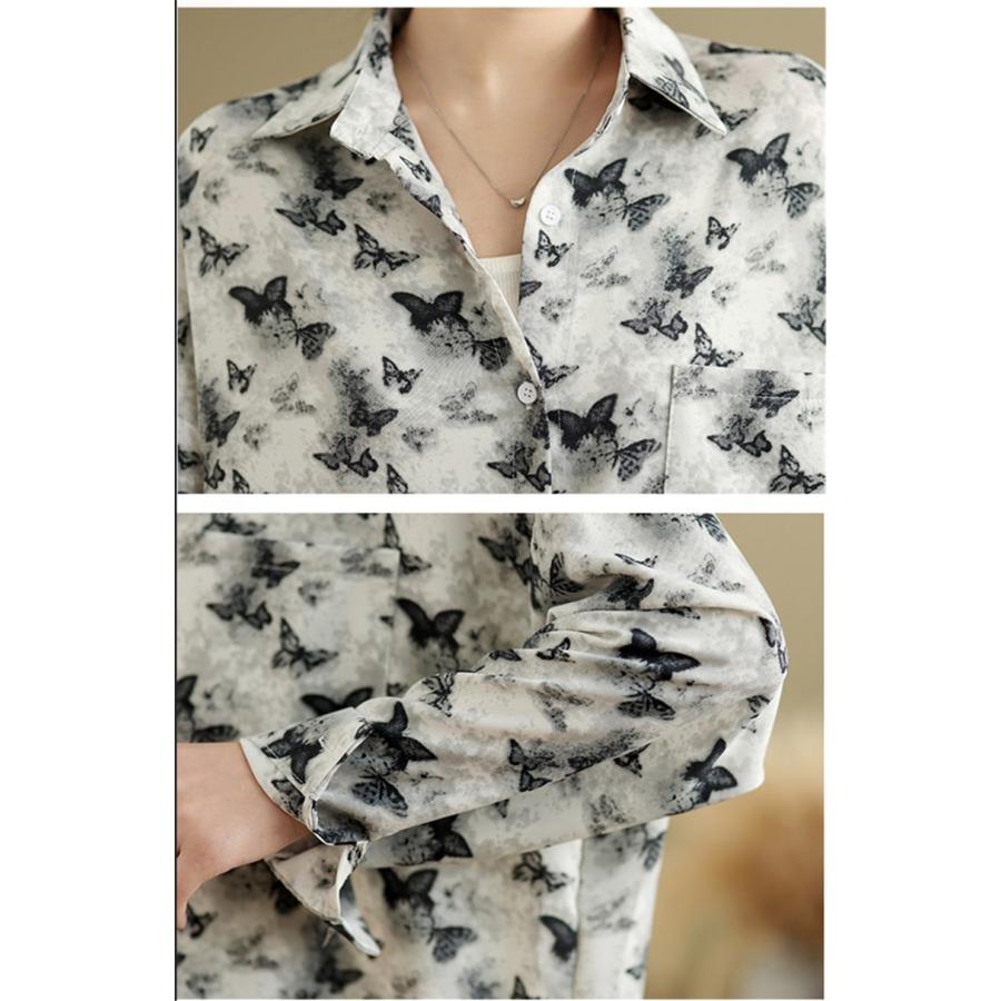 シャツ レディース トップス 春新作 ブラウス 羽織り 大人世代のカジュアルスタイルにぴったり 大人気 長袖 蝶々柄 オーバーシルエット 大きいサイズ
