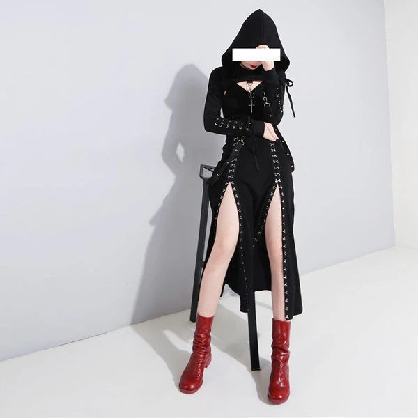 ダーク系ハロウィンコットンのキャミソールワンピースミディアム丈の膝のデコルテを整えたスリット入りロングスカート コスプレ ハロウィン メイド服 メガ割