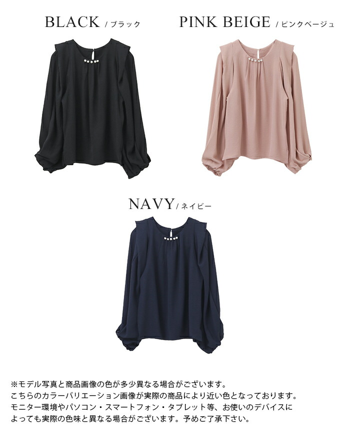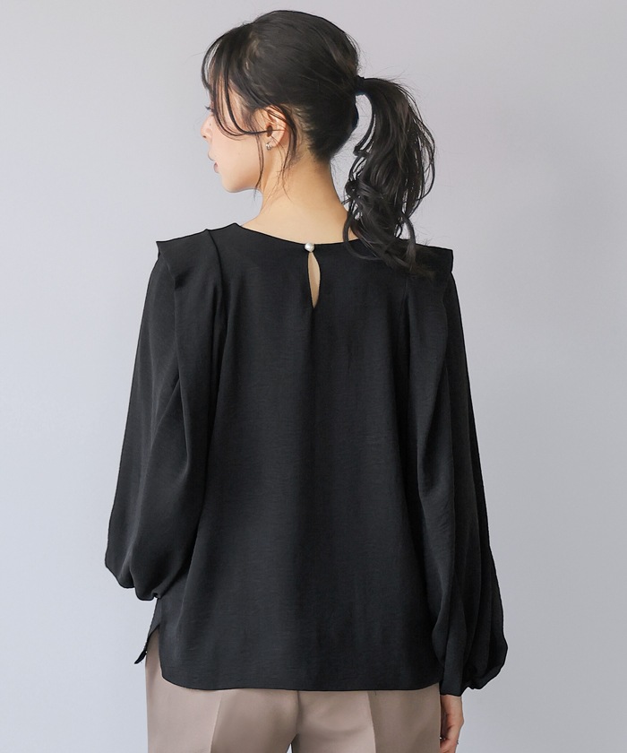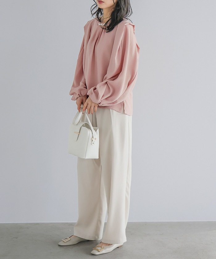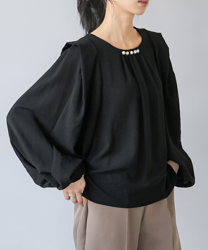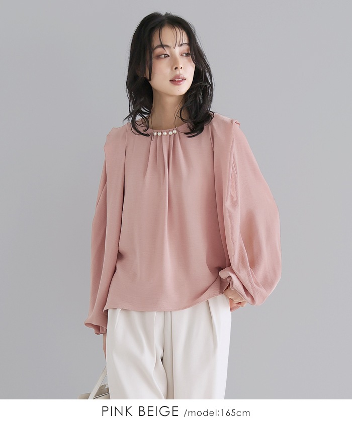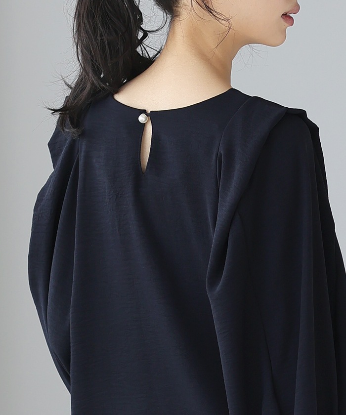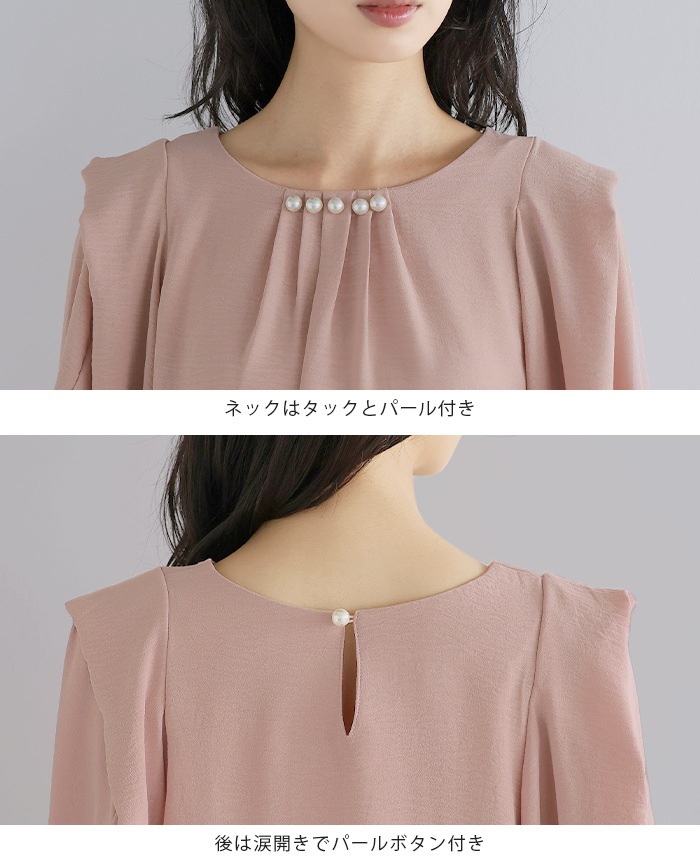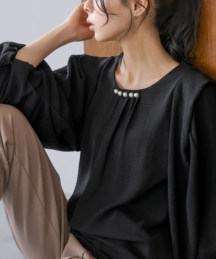 ネックにタックを入れ、その上にパールをあしらったブラウス。