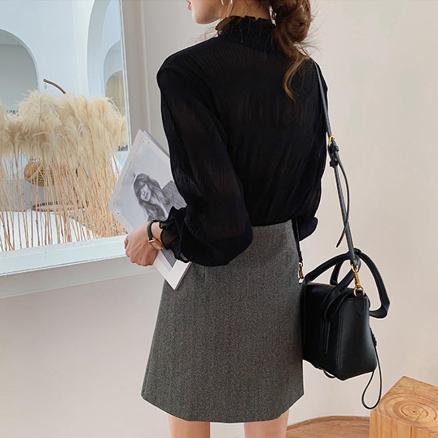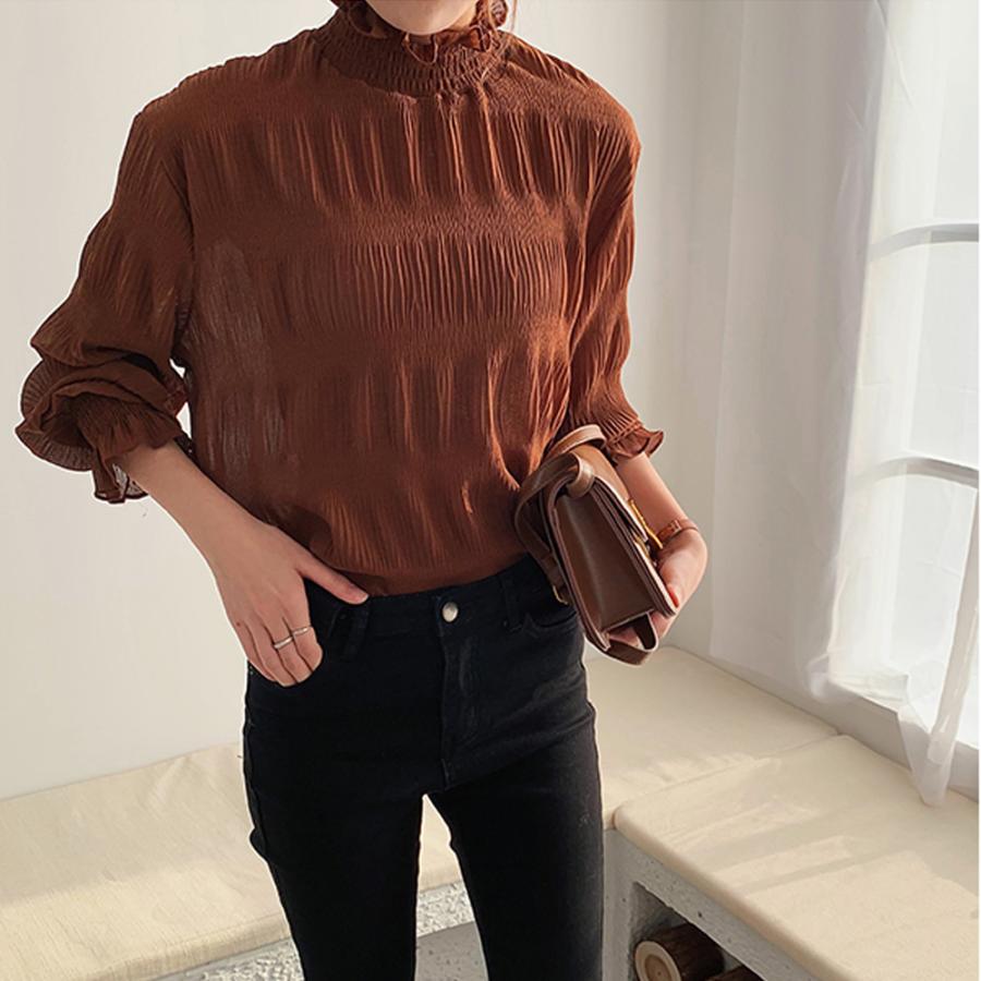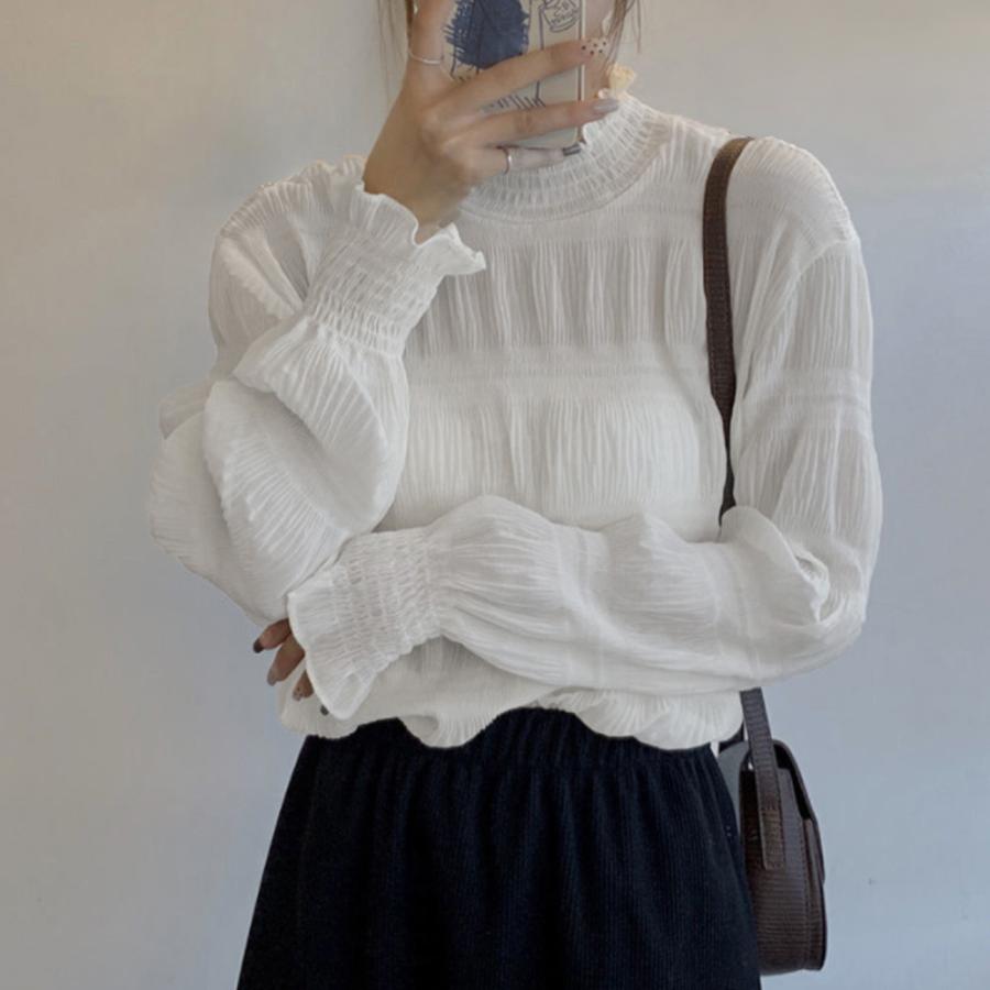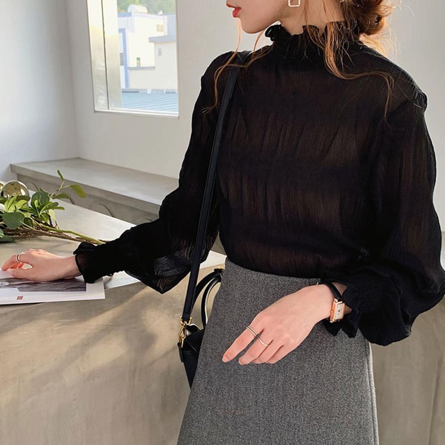 今っぽシアーシャツ レディースファッション メロウフリル ハイネックブラウス 韓国風 シャツ ブラウス