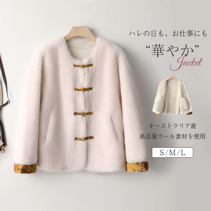 ノーカラージャケット ボア レディース ボアコート アウター ウール ボアアウター ボアジャケット 秋冬 ジャケット ショートコート ノーカラー 長袖 暖かい ショート チャイナ風 ウールジャケット