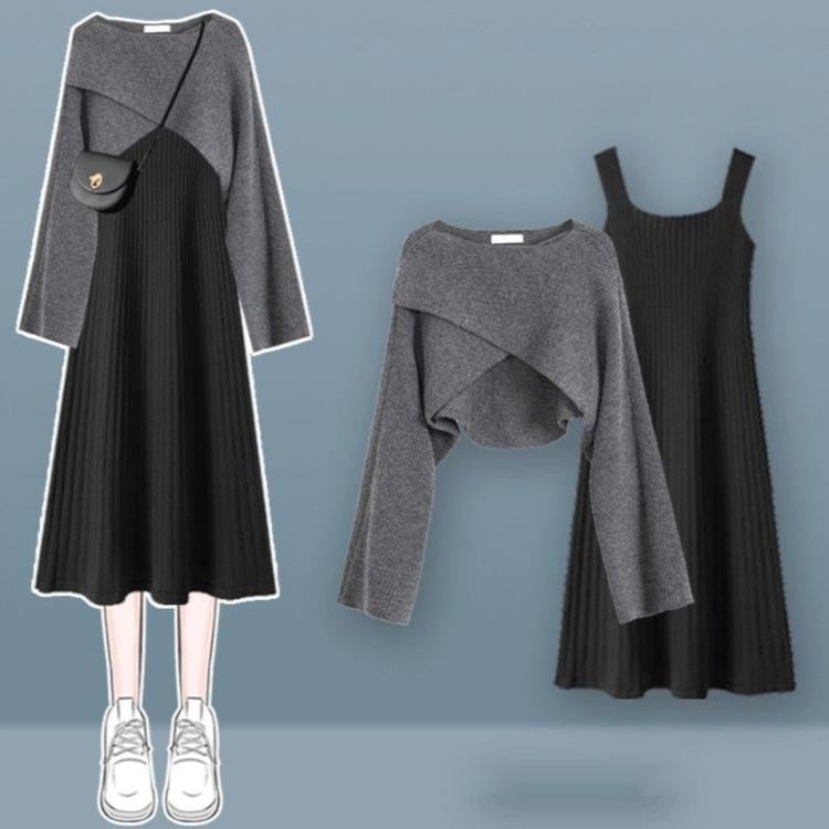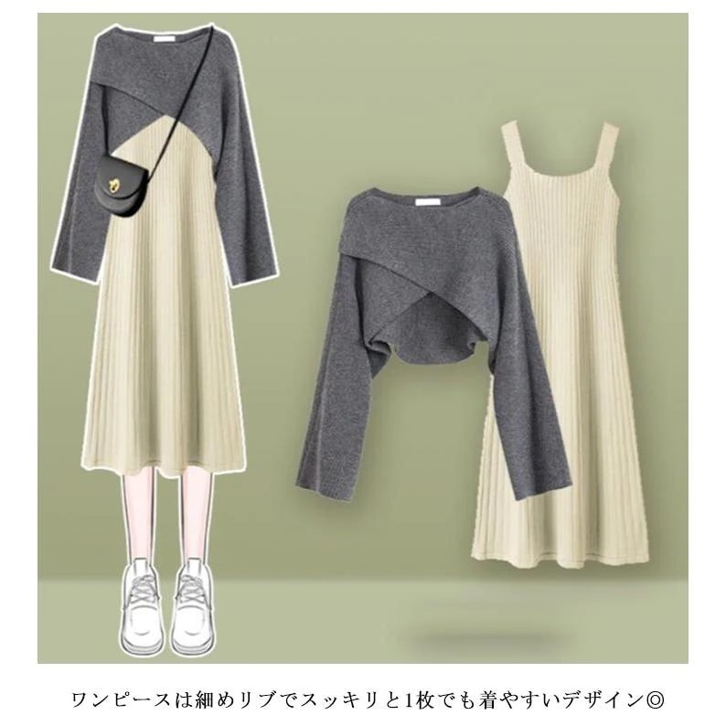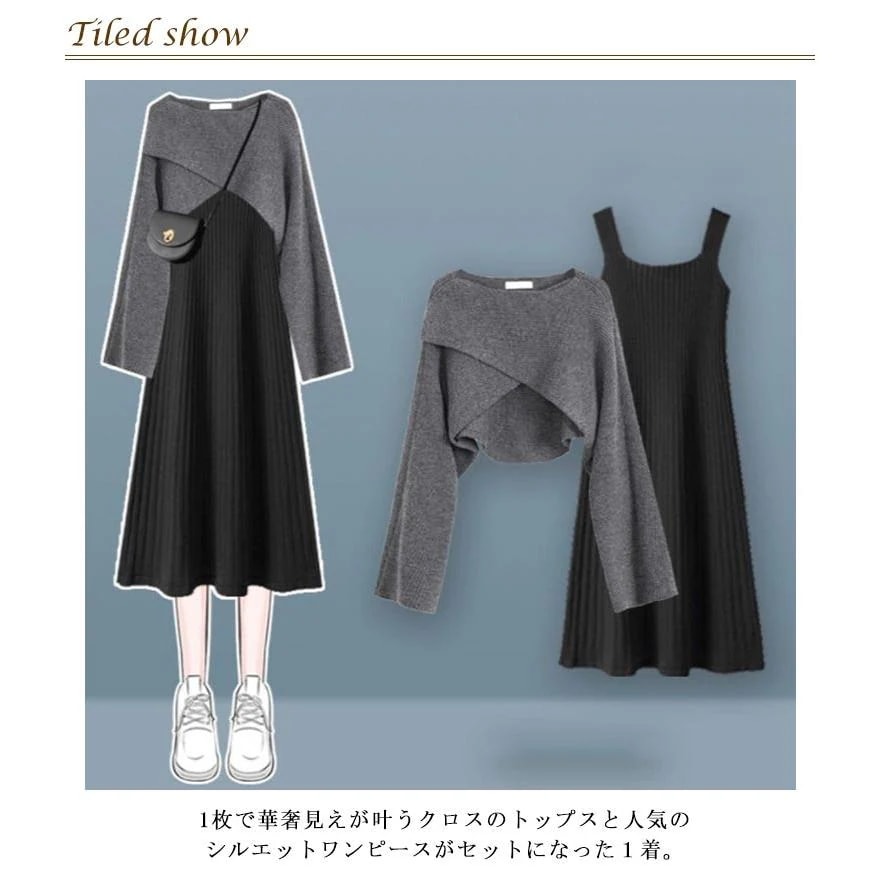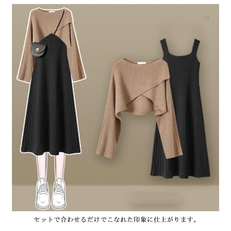 人気商品超目玉 ニットセットアップ 2点セット レディース 春秋 秋冬 ニット セーター クロス 長袖 フレアスワンピース ミモレ丈 ワンピース ロングワンピース き