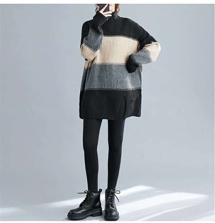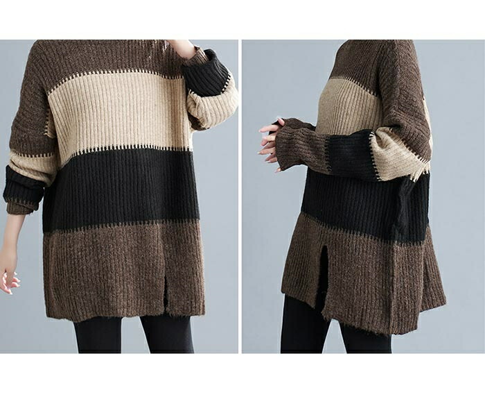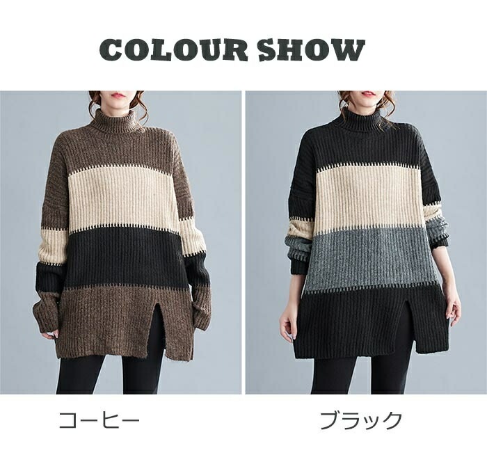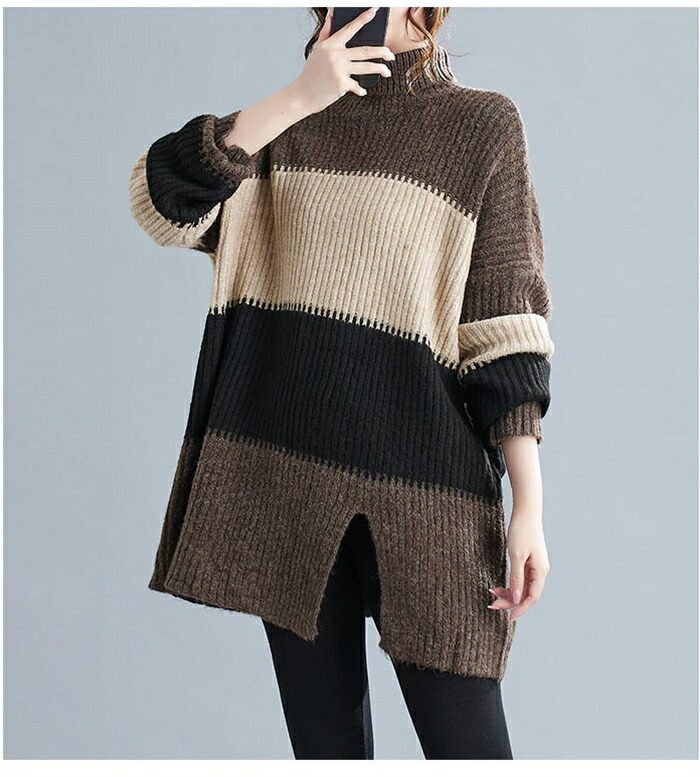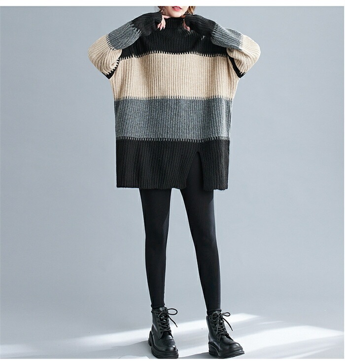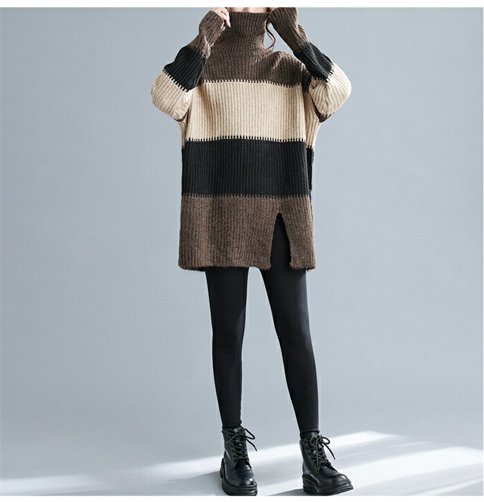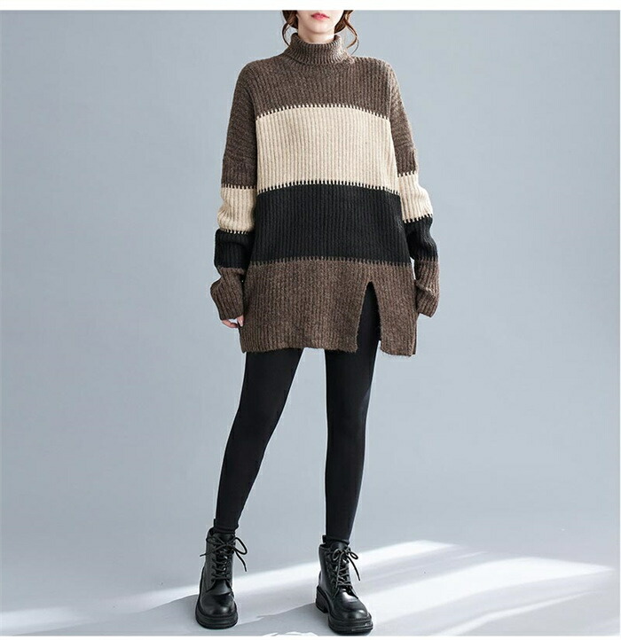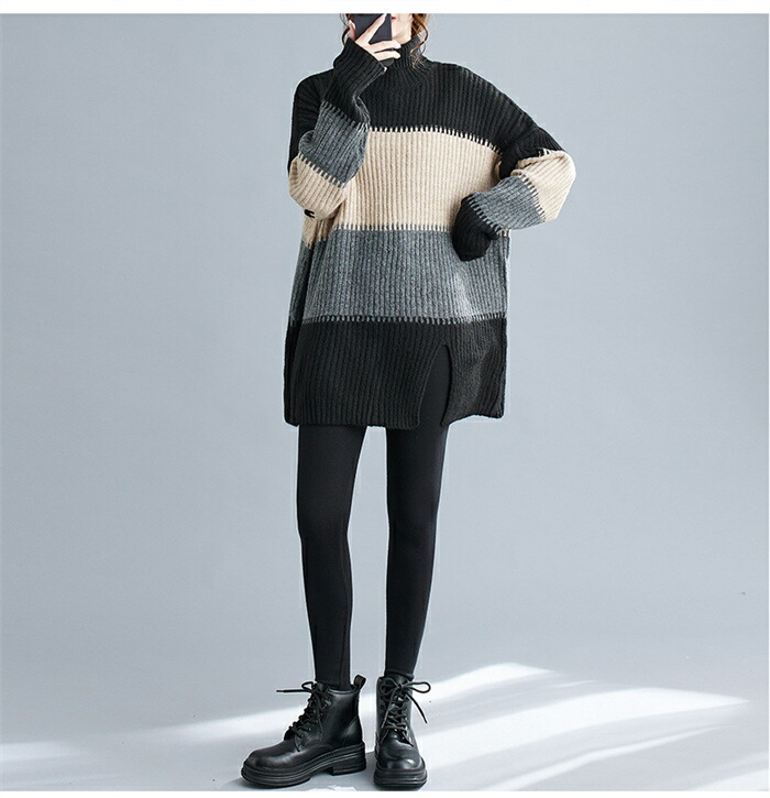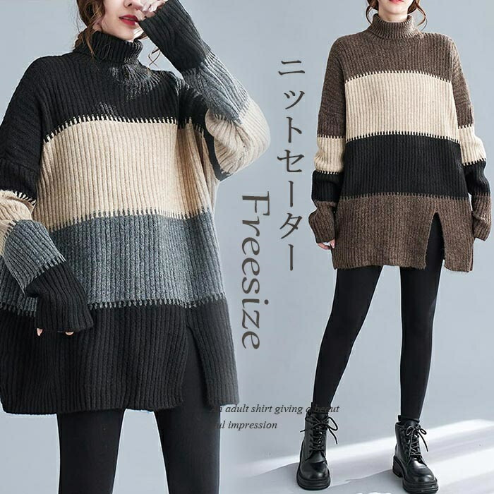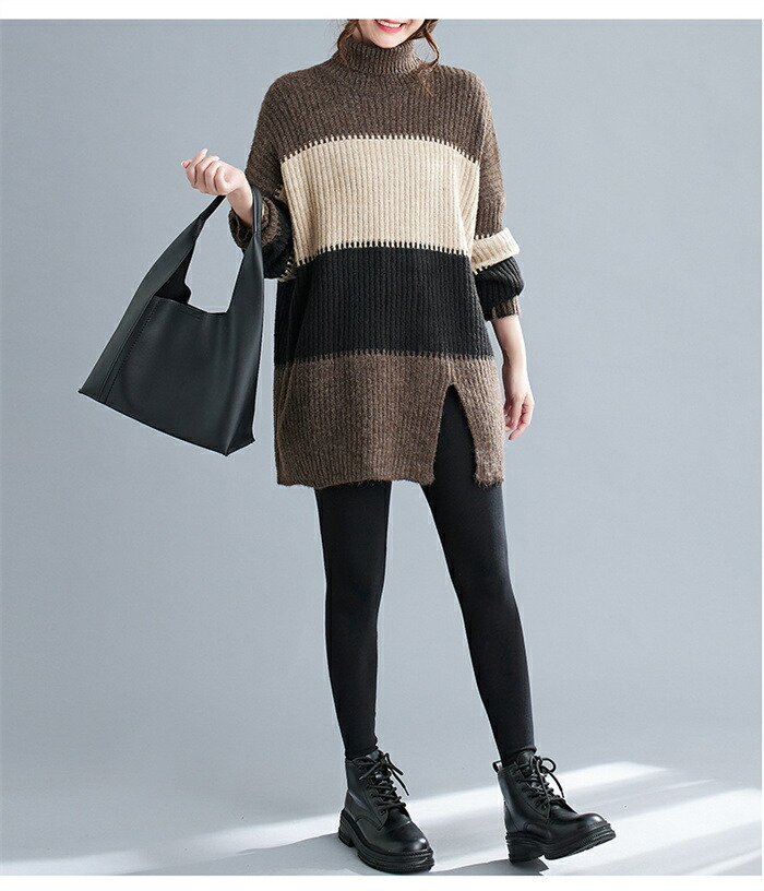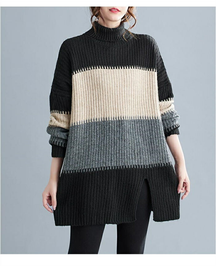 ニットセーター セーター レディース ハイネック ロングニット ニット 秋冬 タートルネック セーター ボーダー 長袖 ニットトップス ニットソー チュニック ボーダー柄セーター 長袖ニット カジュ