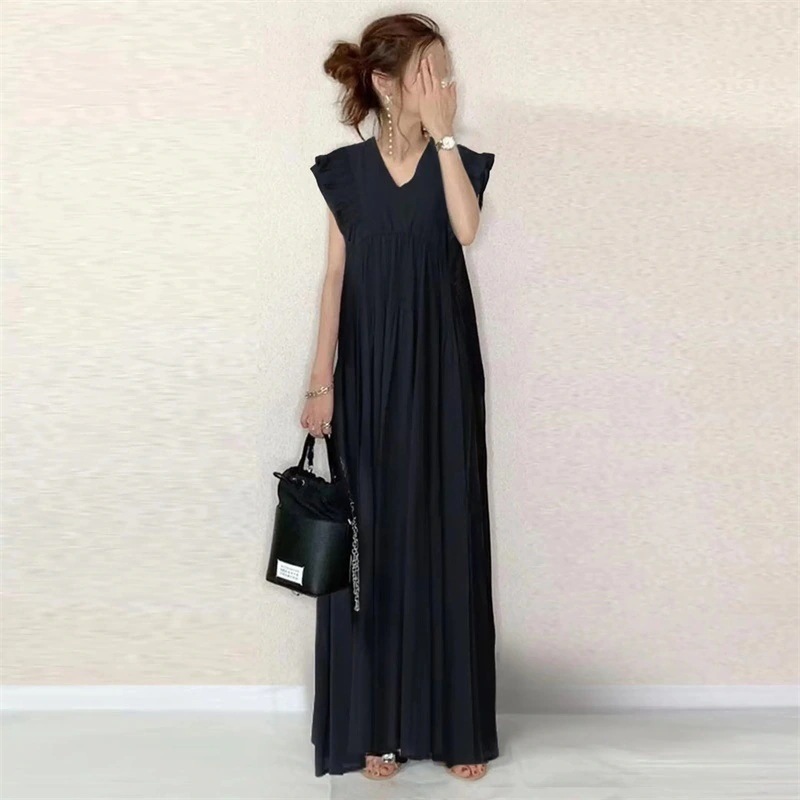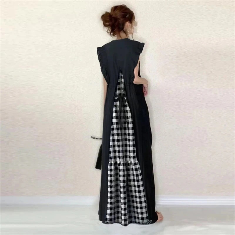 人気発品23新作ワンピース木耳縁袖口蝶結びバックチェックVネックゆったりカジュアルシンプルロング その他 ワンピース ドレス