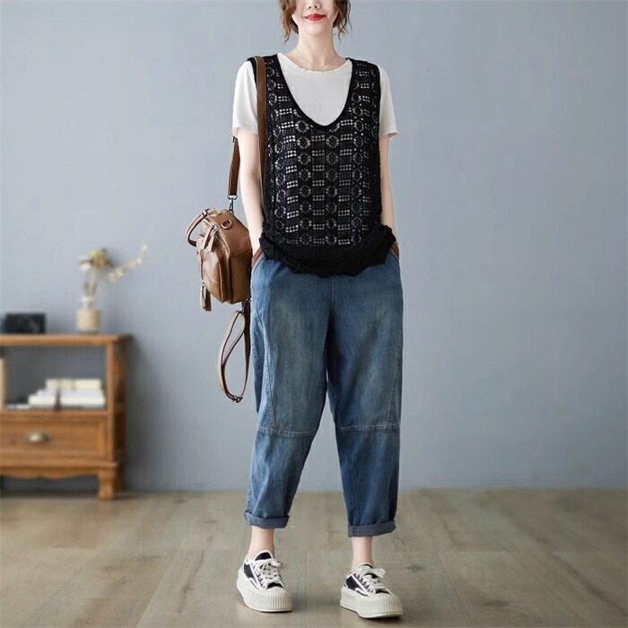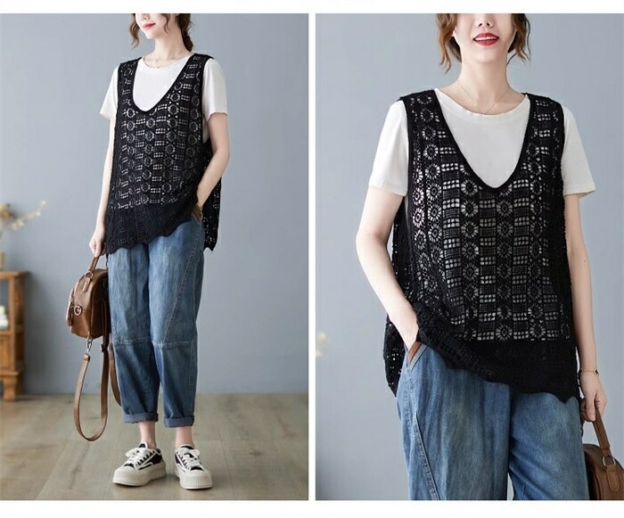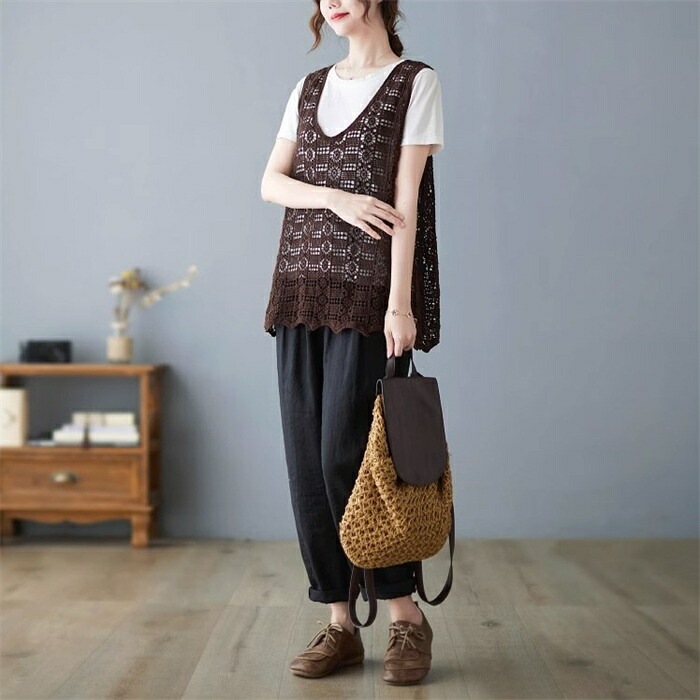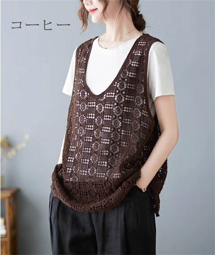 ニットベスト レディース 夏 vネック 透かし編み ニット ベスト vネックニット ゆったり プルオーバー ノースリーブ 大きいサイズ 春ベスト 重ね着 春物 トップス レイヤード サマーニットベスト