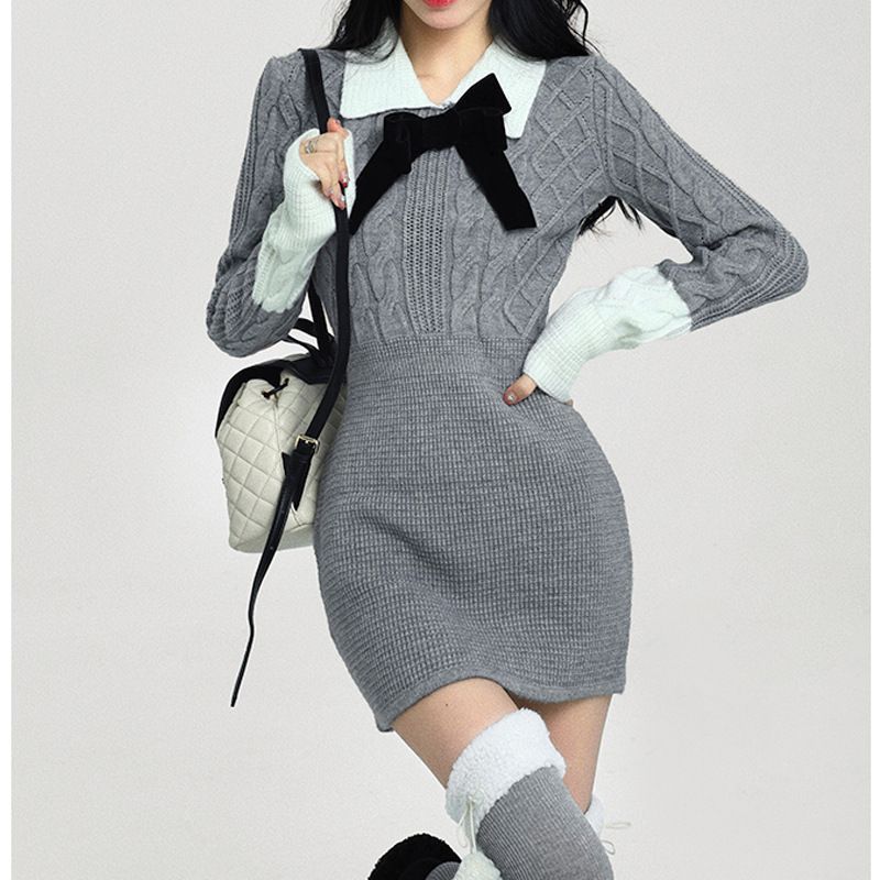 カラコンqoo10アヌアパックアイシャドウ学院風セーターワンピース女性韓国版春装スカートに長袖ニットスカートを掛けてお尻のスカートを包む ニットワンピ