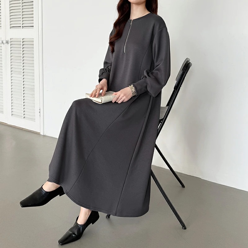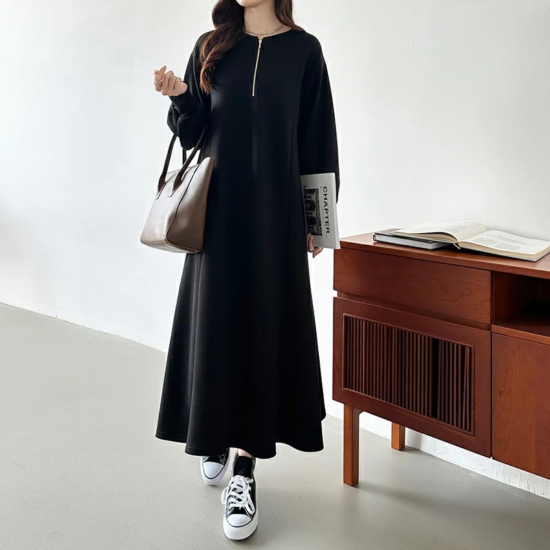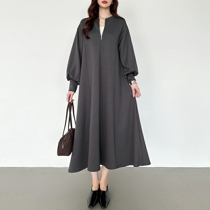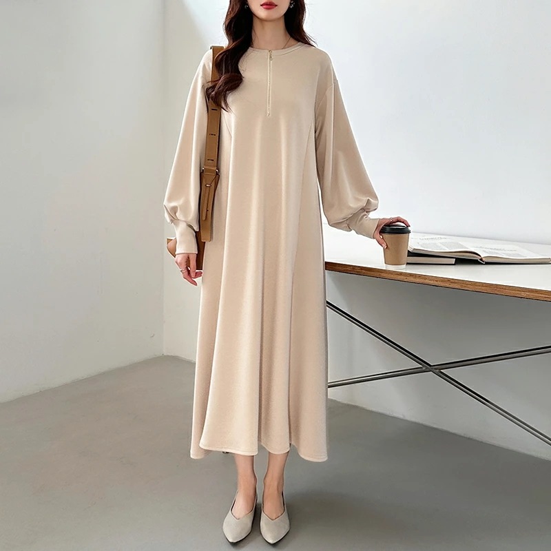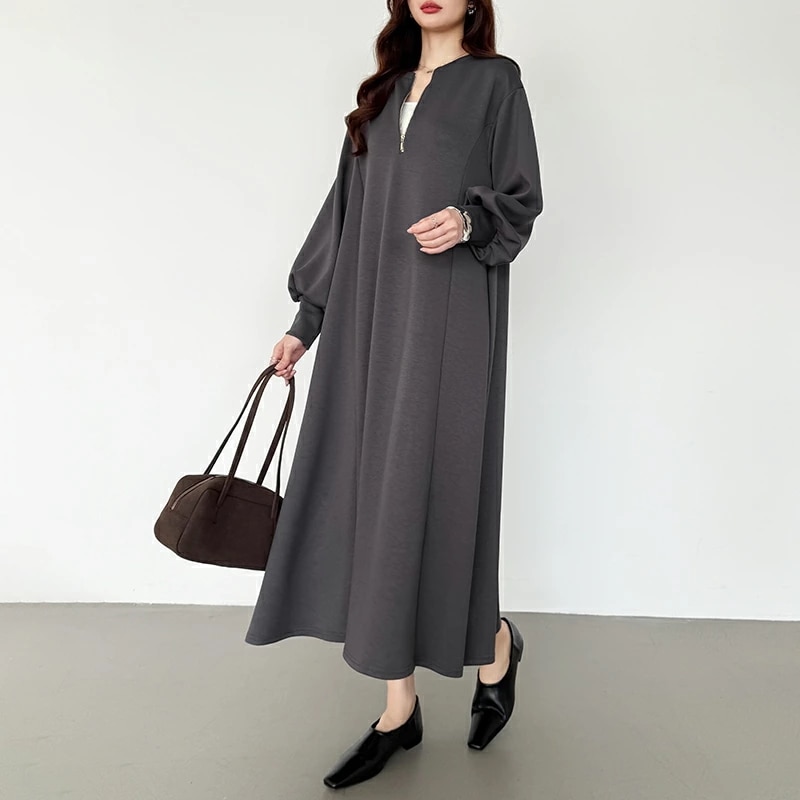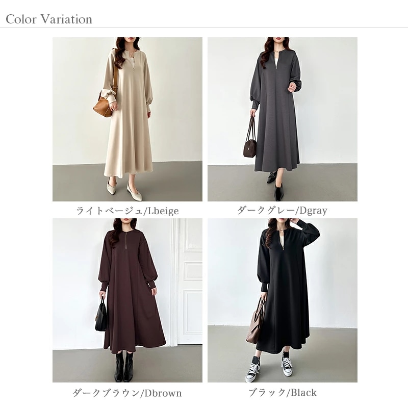 ハーフジップワンピース 前後2way ロングワンピース フレアワンピース ハーフジップ ワンピース 長袖 レディース ロング カジュアル ボリューム袖 大きいサイズ