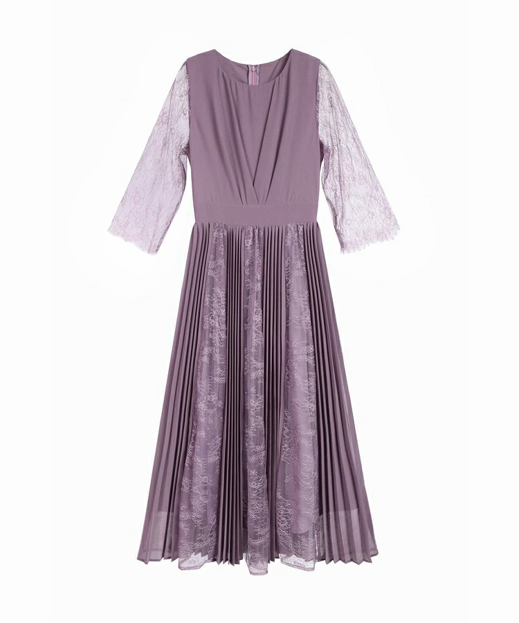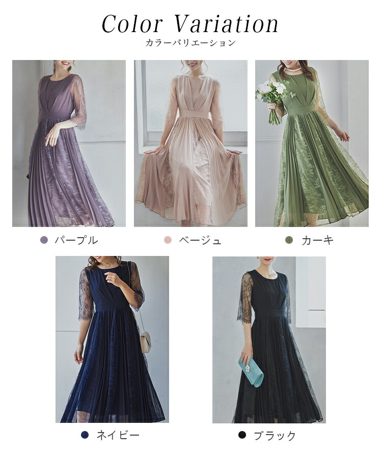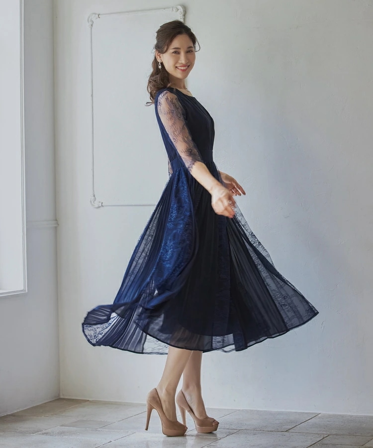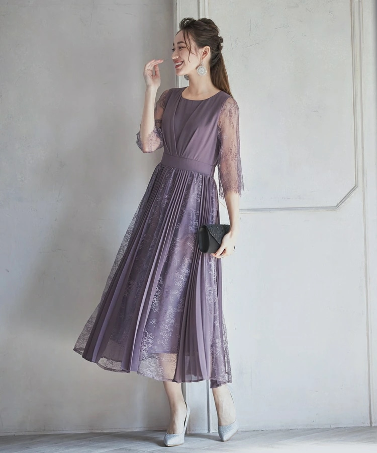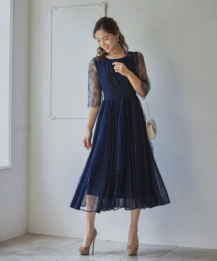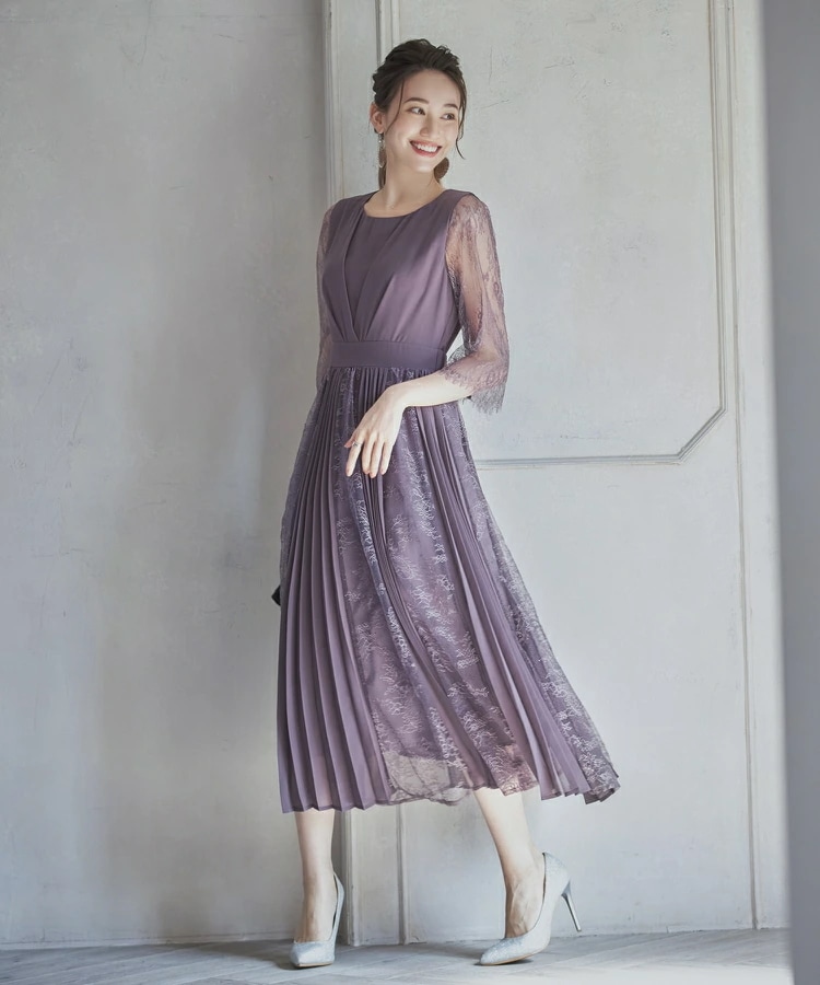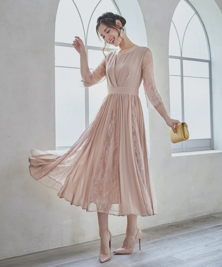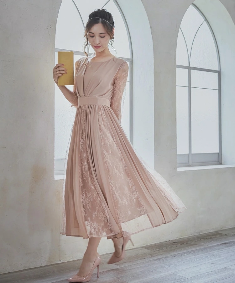 パーティードレスドレス ドレスワンピース ロングワンピース [企画] ワンピース レディース レース シースルー袖 裏地付き ロング丈 ミモレ丈 袖あり ドッキング プリーツ 結婚式 二次会 パー