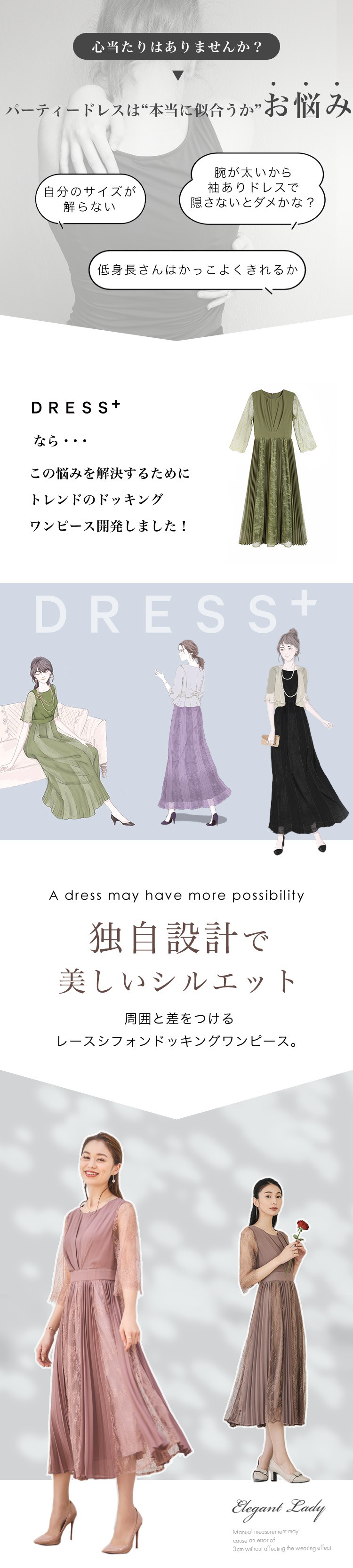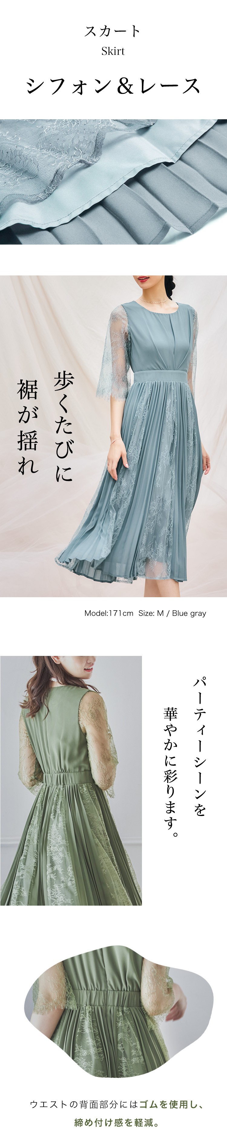 周囲と差をつけるレースシフォンドッキングワンピース。トレンドのドッキングデザインが目を引く、ワンピースドレスです。大人の魅力を感じさせるラグジュアリーな着こなしを、お楽しみいただけます。袖には繊細なレースをたっぷりとあしらい、よりドレッシーな印象に。女性らしい肌見せで、トレンドライクな透け感を演出しました。袖周りにゆとりをもたせ、動きやすさをプラス。シフォンとレースを贅沢に使用した、ドッキングデザイン。ウエストの背面部分にはゴムを使用し、締め付け感を軽減。歩くたびに裾が揺れ、パーティーシーンを華やかに彩ります。スカートとのバランスを保つために、トップのデザインはよりシンプルに。前見頃にタックをあしらい、ウエストにかけてタイトで美しいシルエットを実現しました。シンプルなラウンドネックは、小ぶりなアクセサリーとの相性も抜群です。