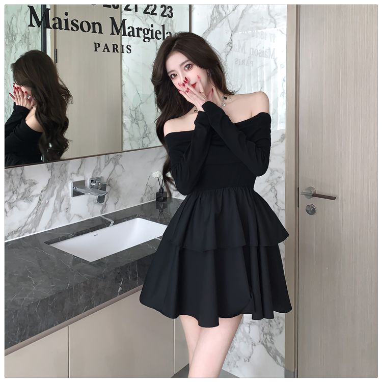 パーティードレス 長袖黒ワンピース春取り入れウエストケーキスカート上品a字スカート肩出しスカート ドレス