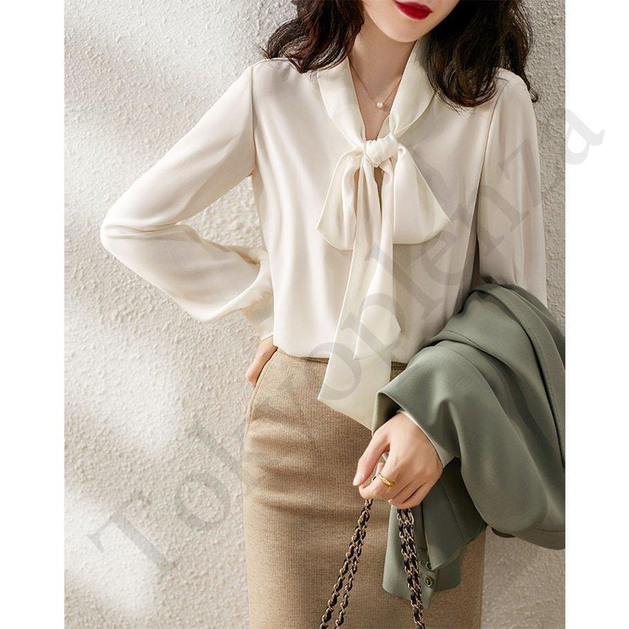 ブラウス レディース きれいめ 長袖 40代 春 秋 オシャレブラウス 白シフォンシャツ リボンネック 上品 大人 通勤 ゆったり シャツ 30代