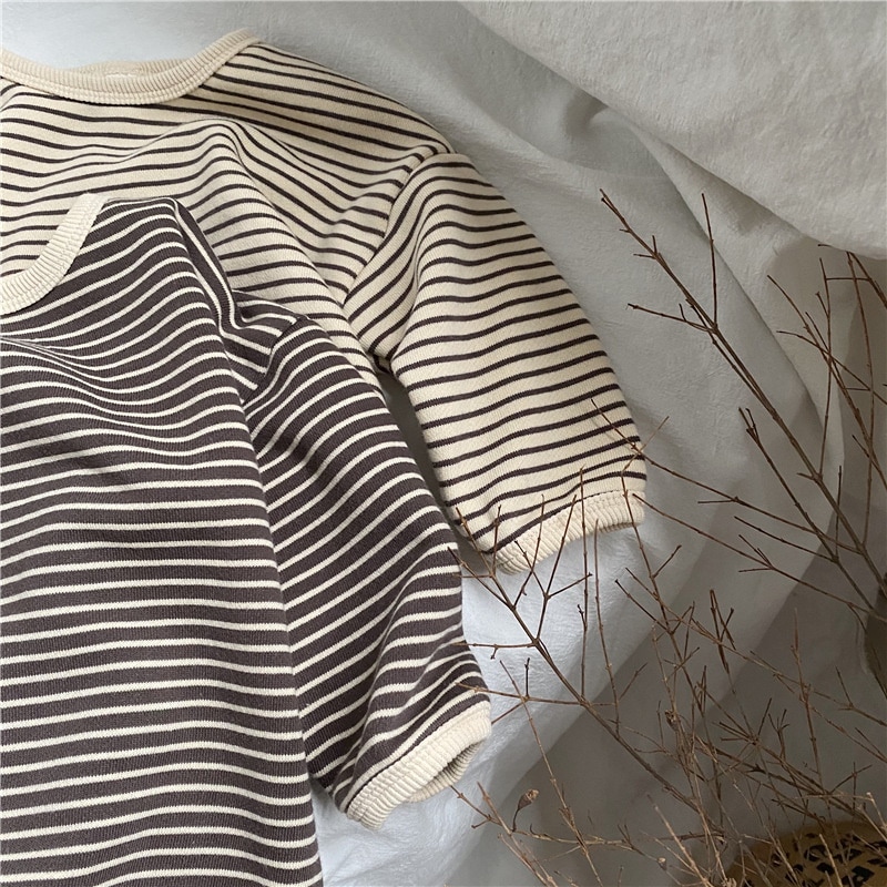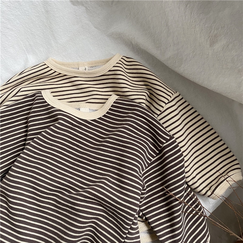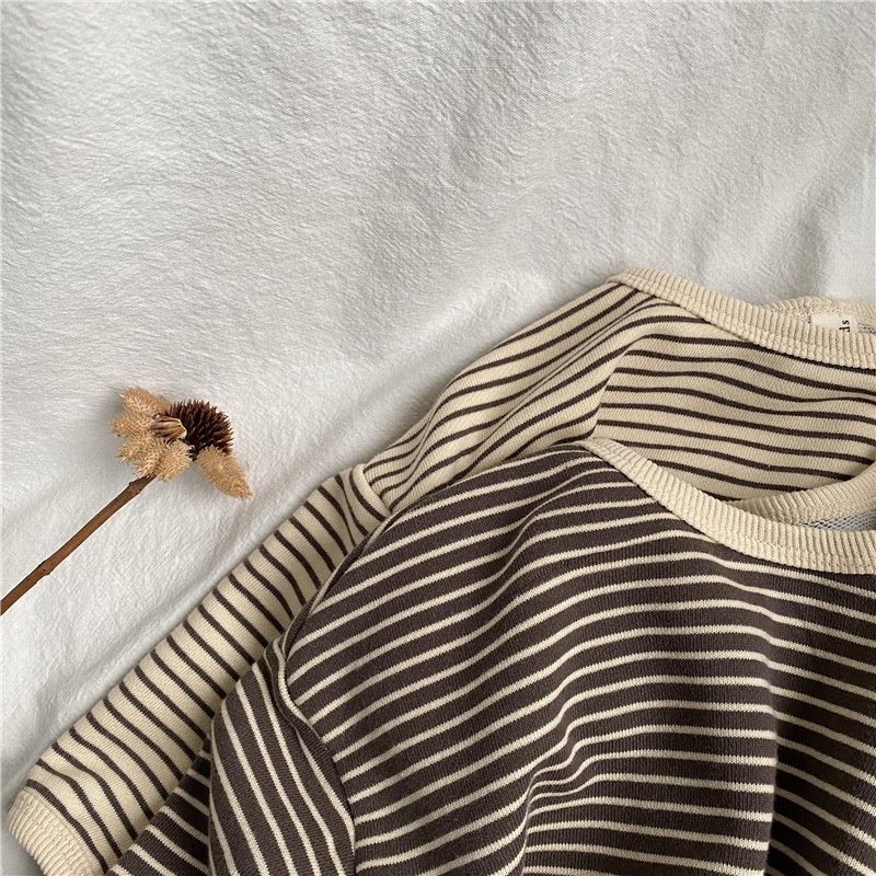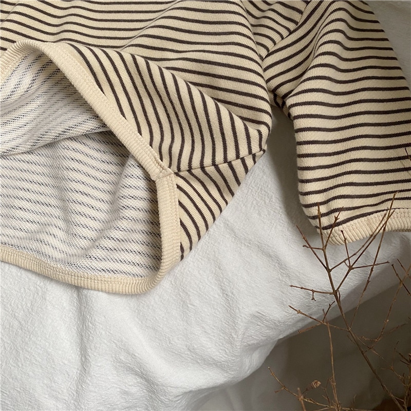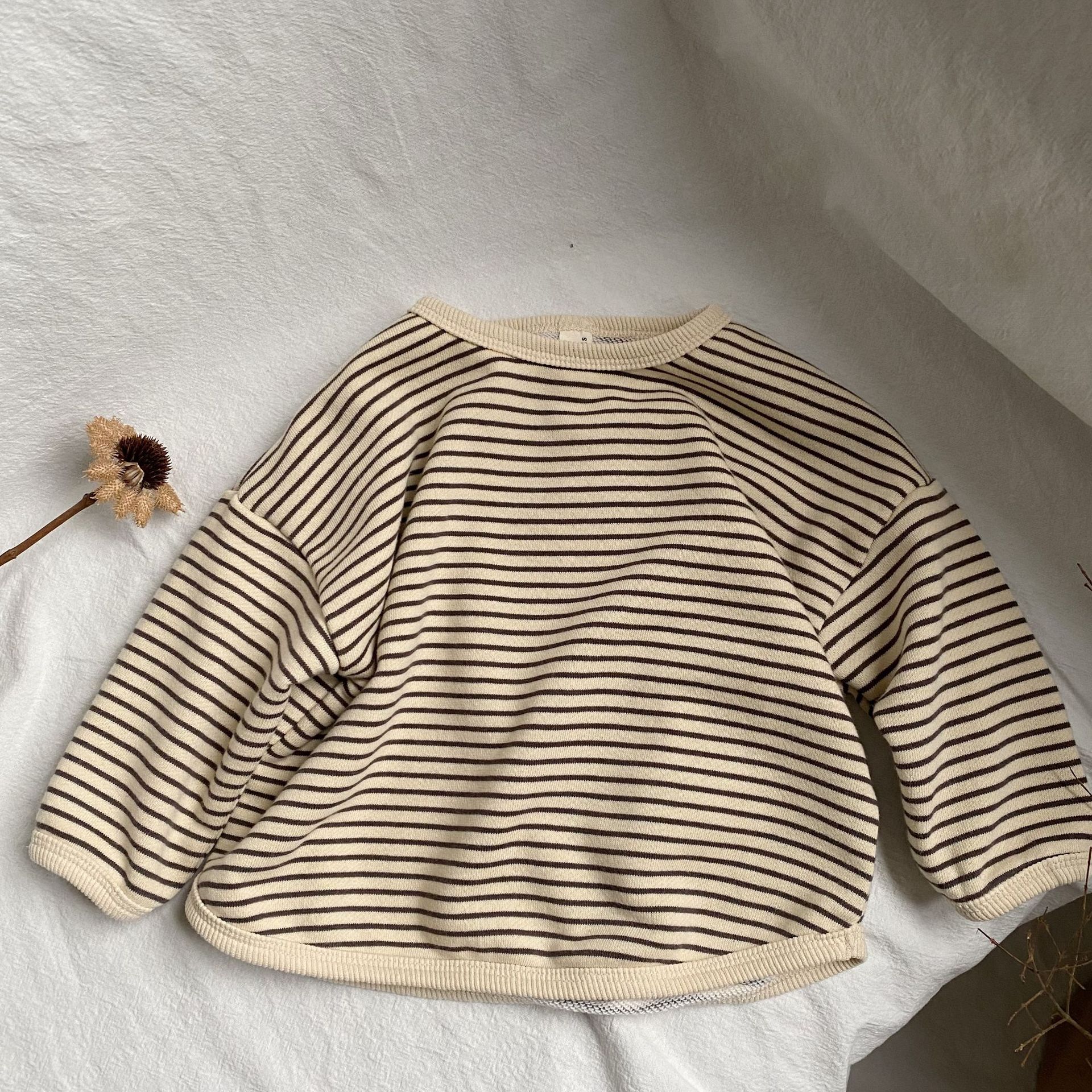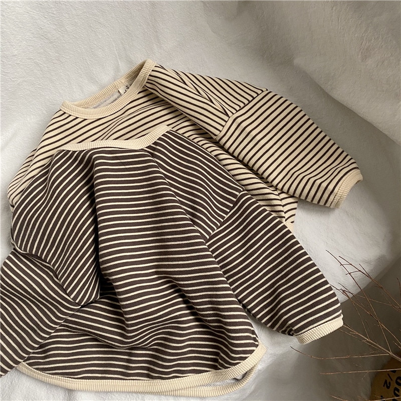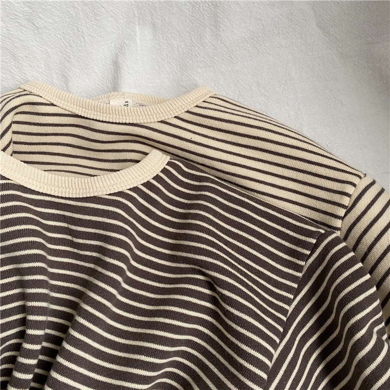 韓国版春の新作子供縞ロンT男女子供ゆったり縞長袖プルオーバー Tシャツ