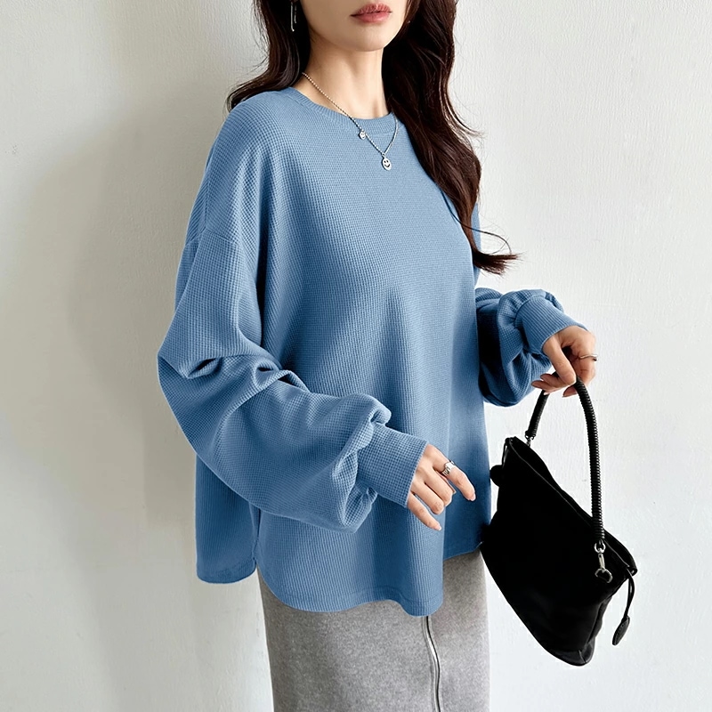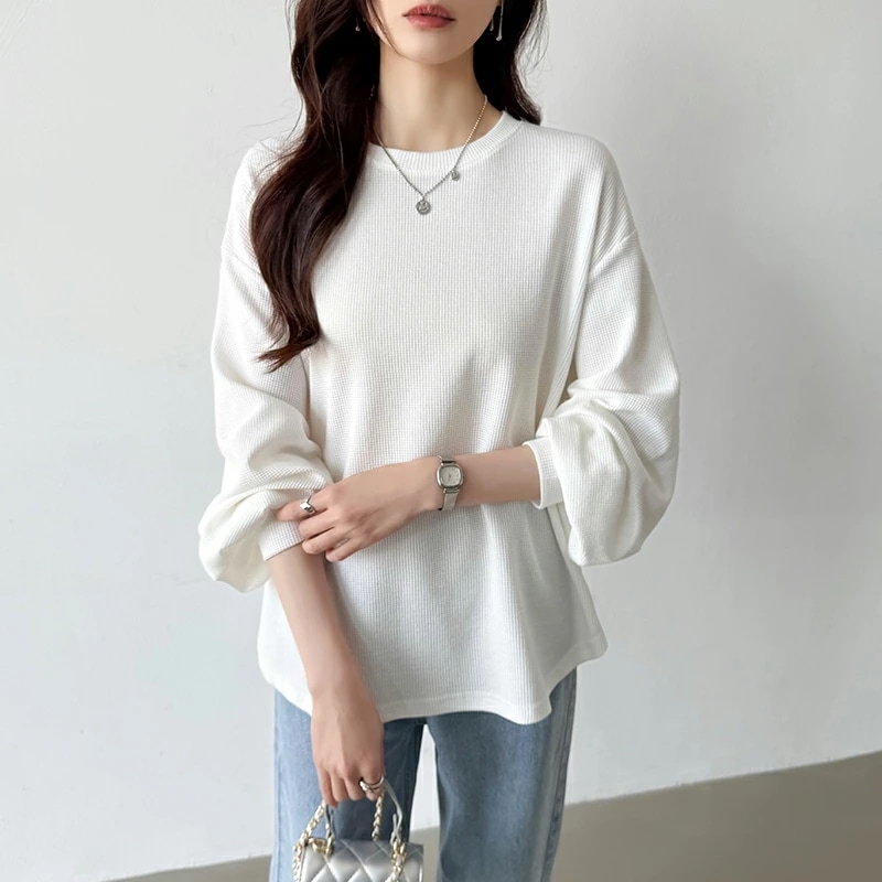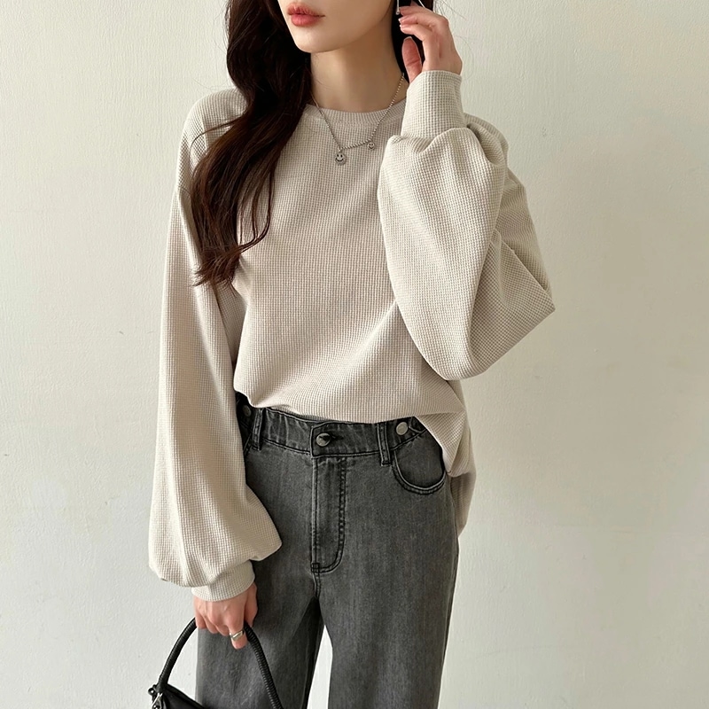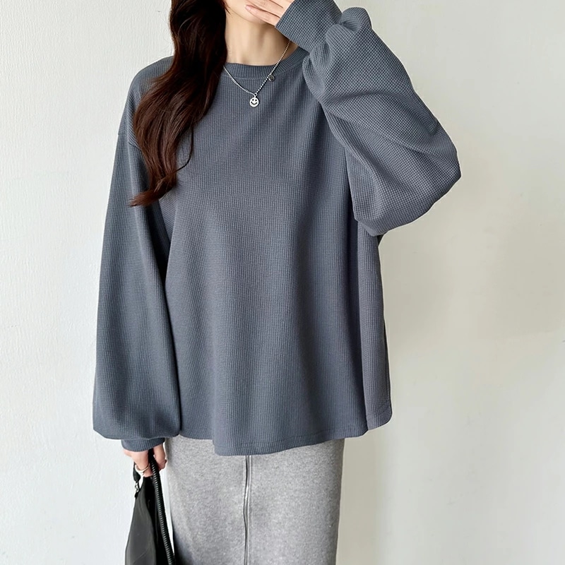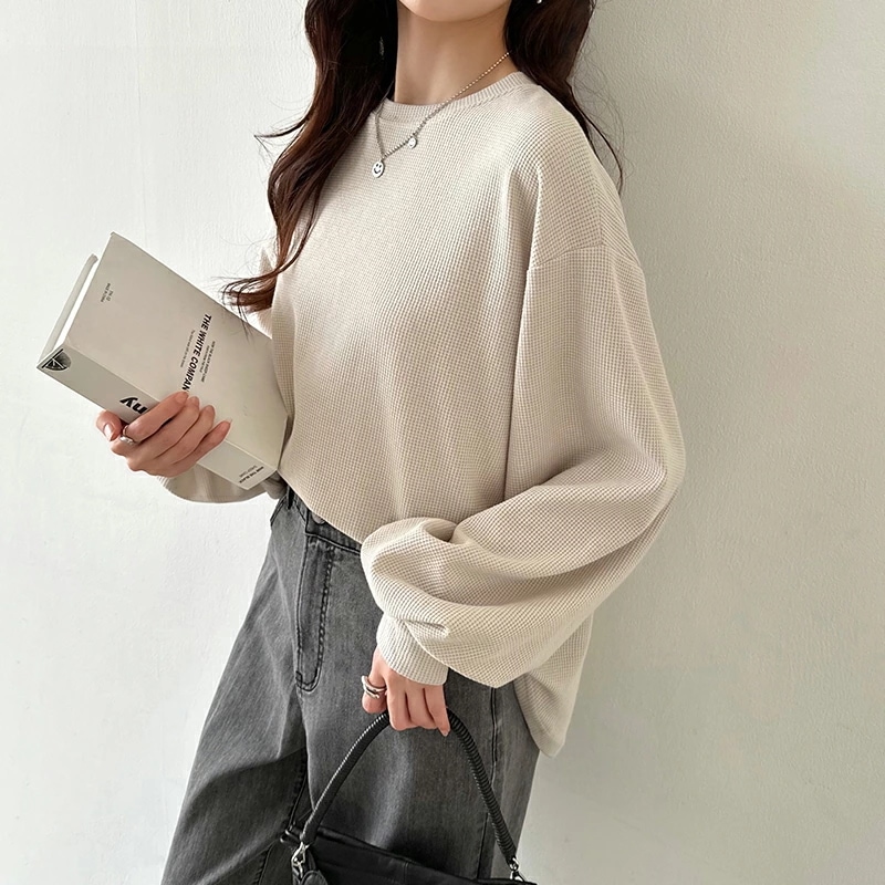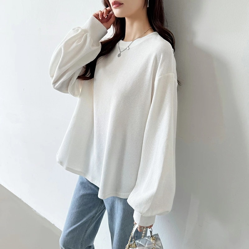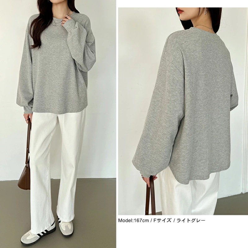 ラウンドヘムワッフルカットソー ボリューム袖 ロンT オーバーサイズ ボリューム袖 ワッフル カットソー 長袖 レディース ゆったり tシャツ トップス ドロップショルダー クルーネック
