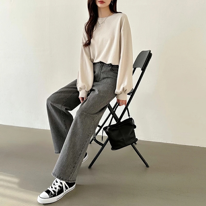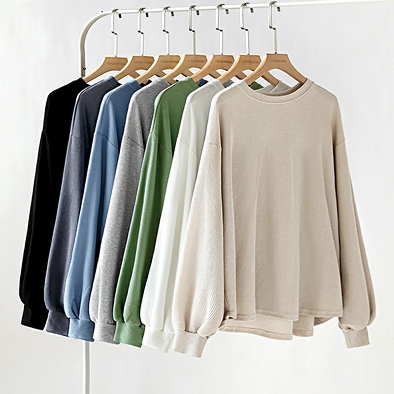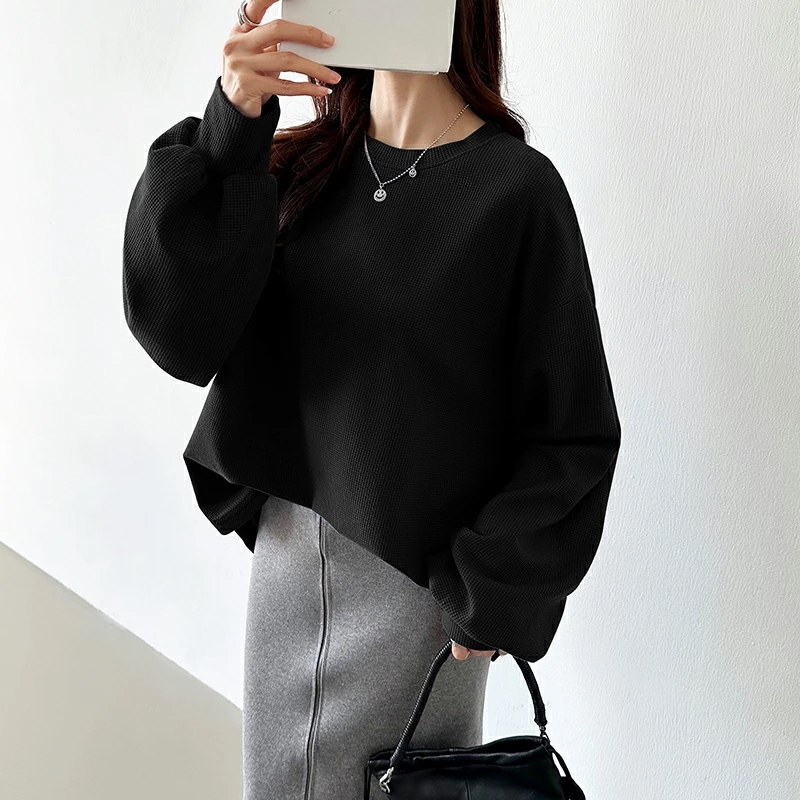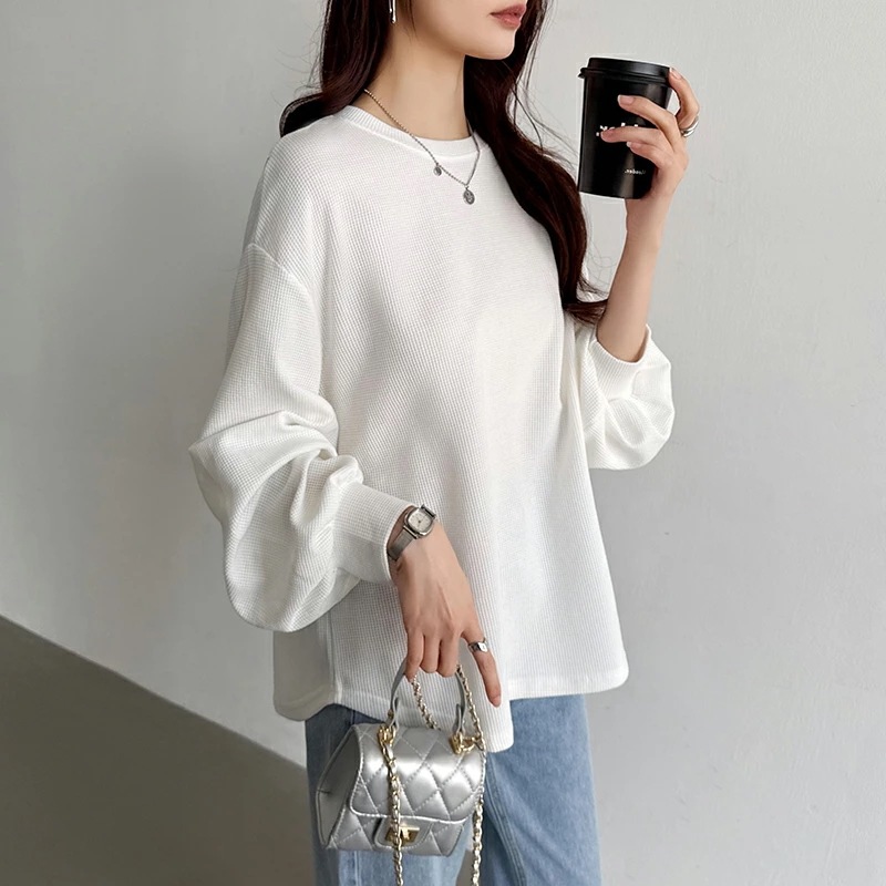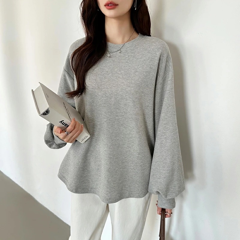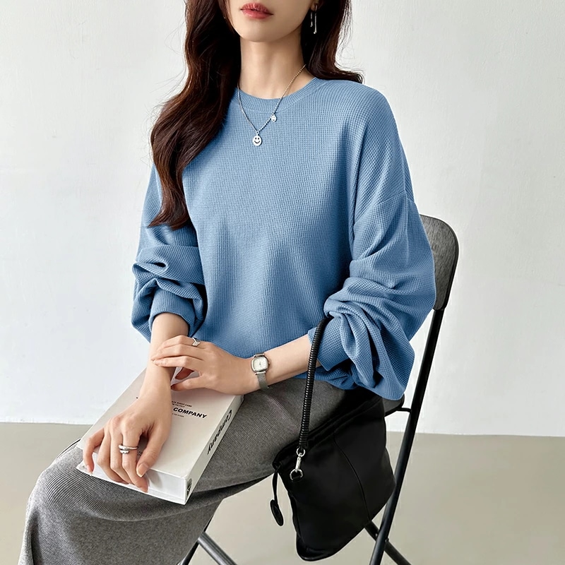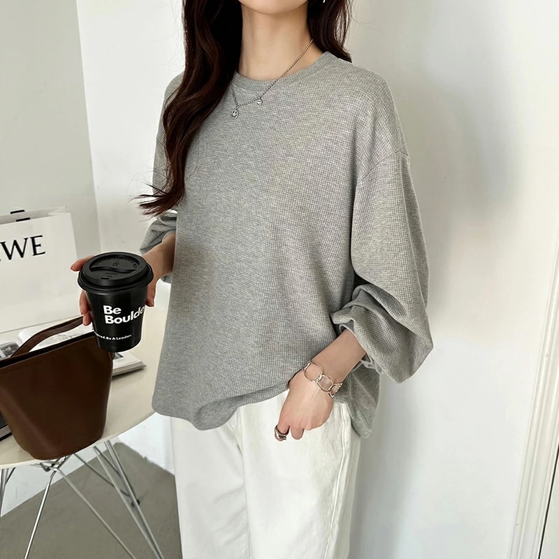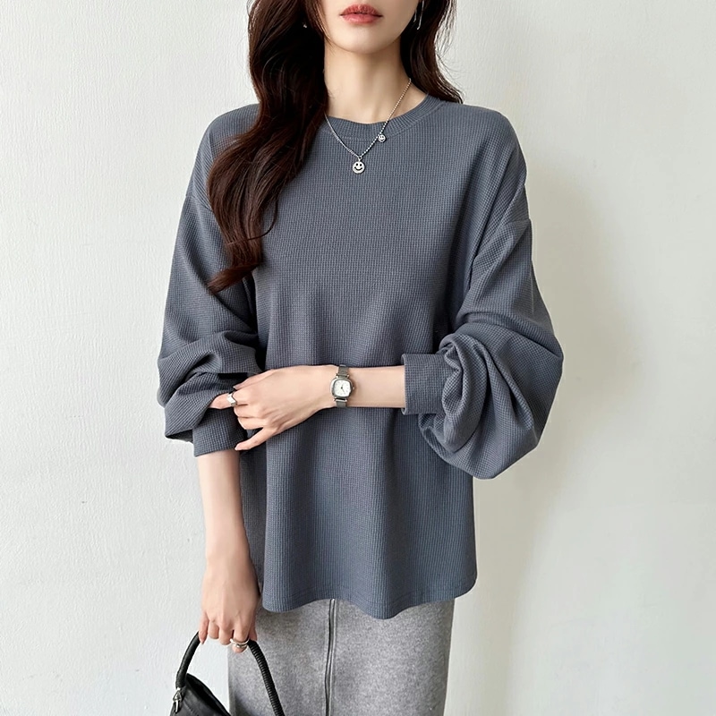 ラウンドヘムワッフルカットソー ボリューム袖 ロンT オーバーサイズ ボリューム袖 ワッフル カットソー 長袖 レディース ゆったり tシャツ トップス ドロップショルダー クルーネック