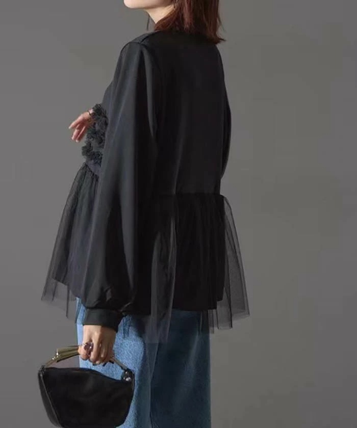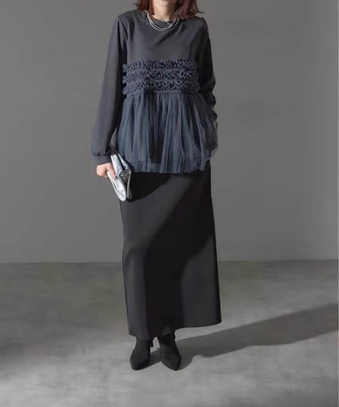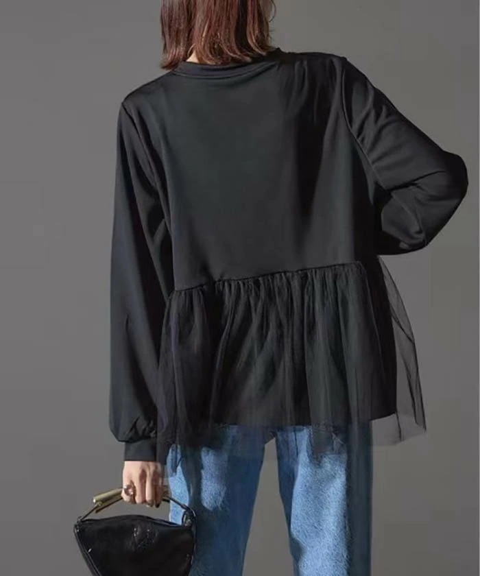 セーター レディース チュール セーター 長袖 秋 春 冬 カレッジ ニット チュール切り替え カットソー チュニック ゆったり 重ね着 レイヤード風 チュールニット 体型カバー シンプル カジュア