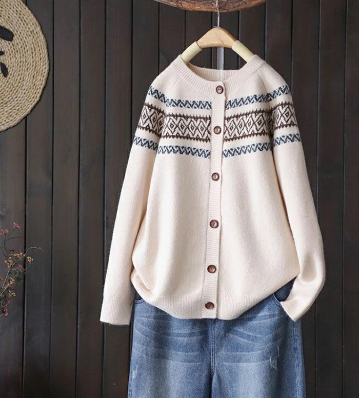 ニットカーディガン レディース 長袖 クルーネック 柄 ニットカーデ カーディガン ゆるカーディガン ニットカーデ 羽織り 春秋 大人カジュアル 大人可愛い 無地 前開き ゆったり エスニック レトロ