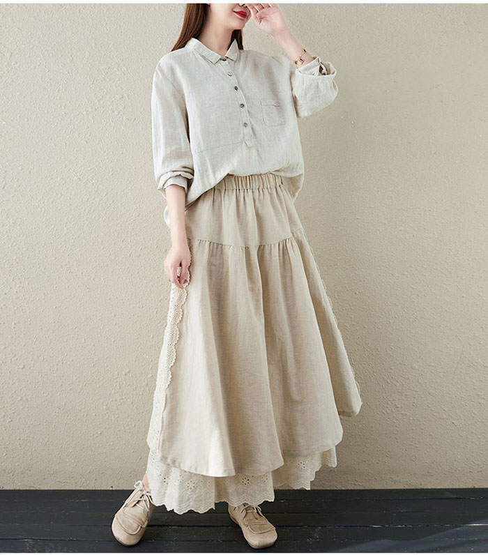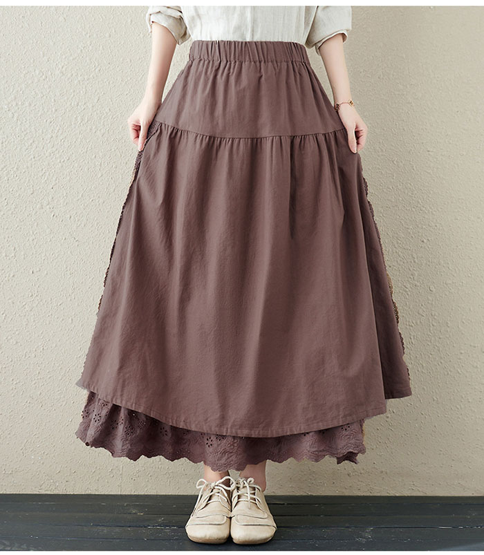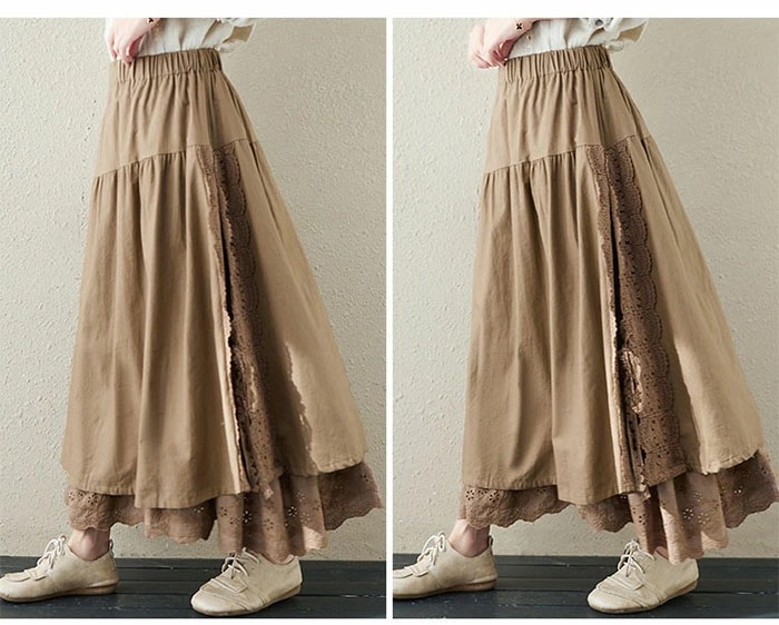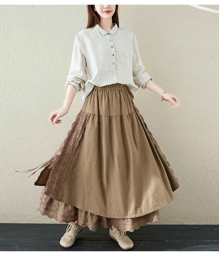スカート ロング 春 Aライ 異素材 切替 レース アシンメトリー レディース ボトムス フレアスカート ロングスカート 大きいサイズ ゆったり ミモレ丈 ウエストゴム お洒落無地 ゆったり カジ