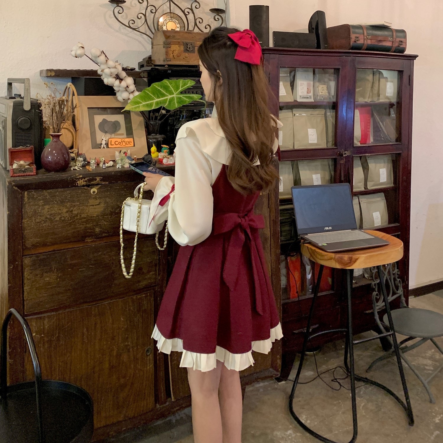 color: 長袖シャツ+赤サスペンダースカート 長袖シャツ+赤半身スカート