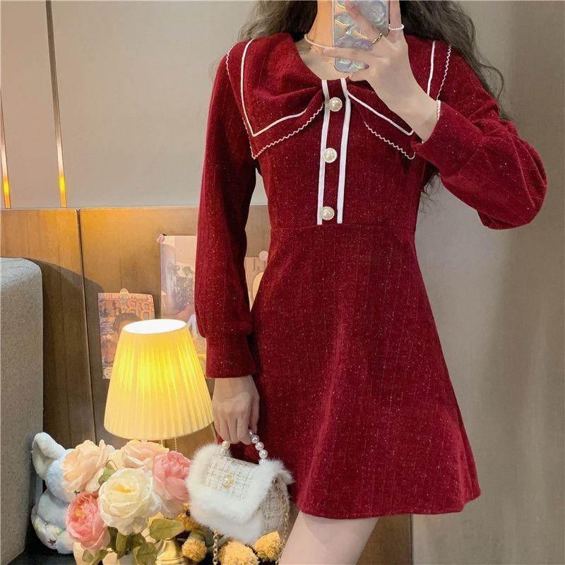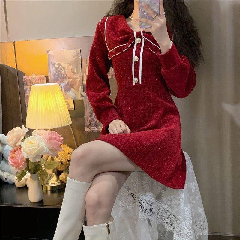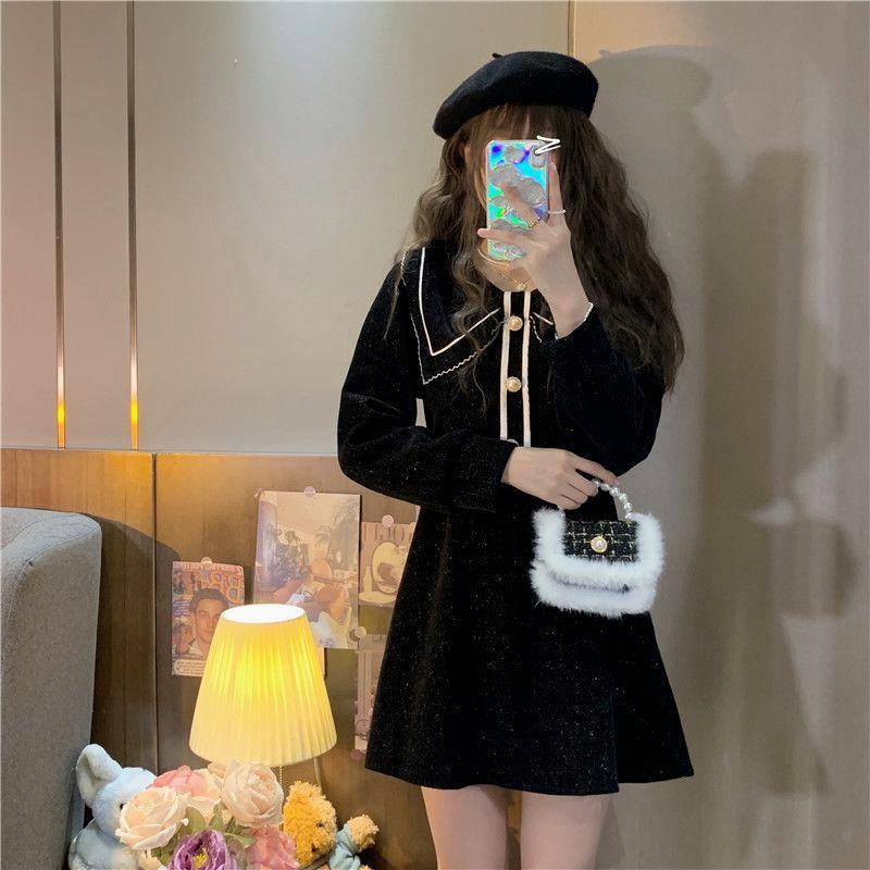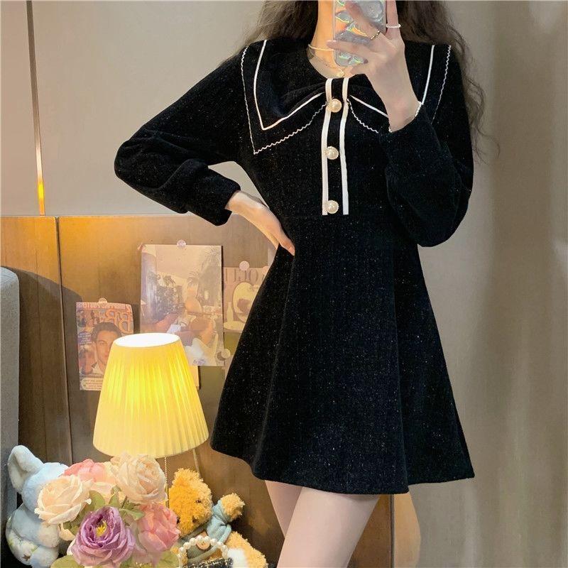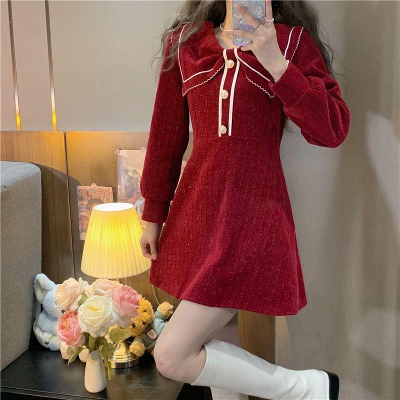 2025春新作韓国版カレッジ風甘めリボンカラー純色ワンピースショート丈スカート ワンピース シャツワンピ
