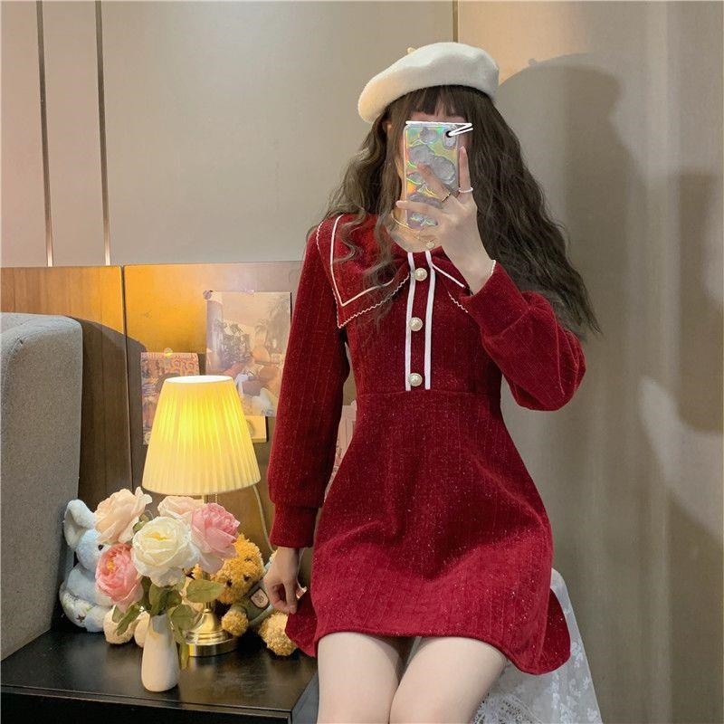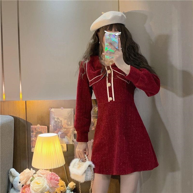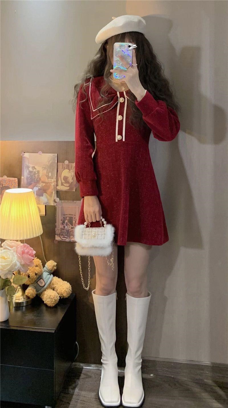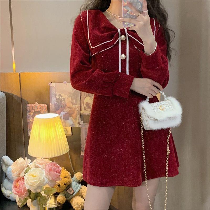 2025春新作韓国版カレッジ風甘めリボンカラー純色ワンピースショート丈スカート ワンピース シャツワンピ