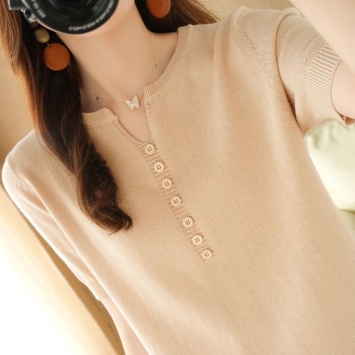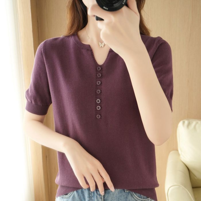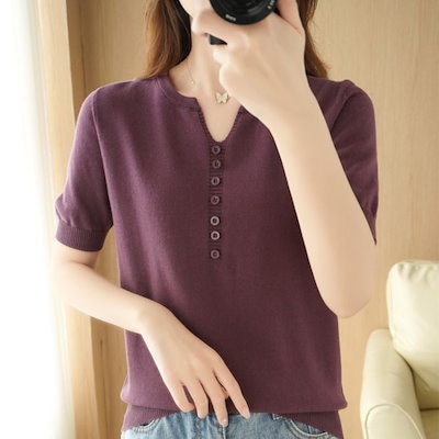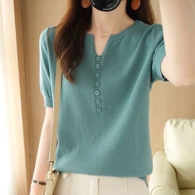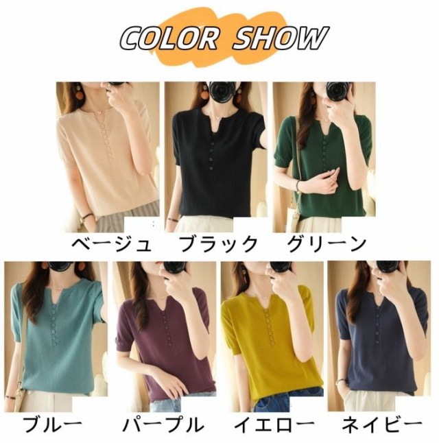 サマーニット 半袖 Tシャツ レディース Vネック トップス サマーセーター ゴルフウェア 無地 春夏 きれいめ オフィス 洗える ニット