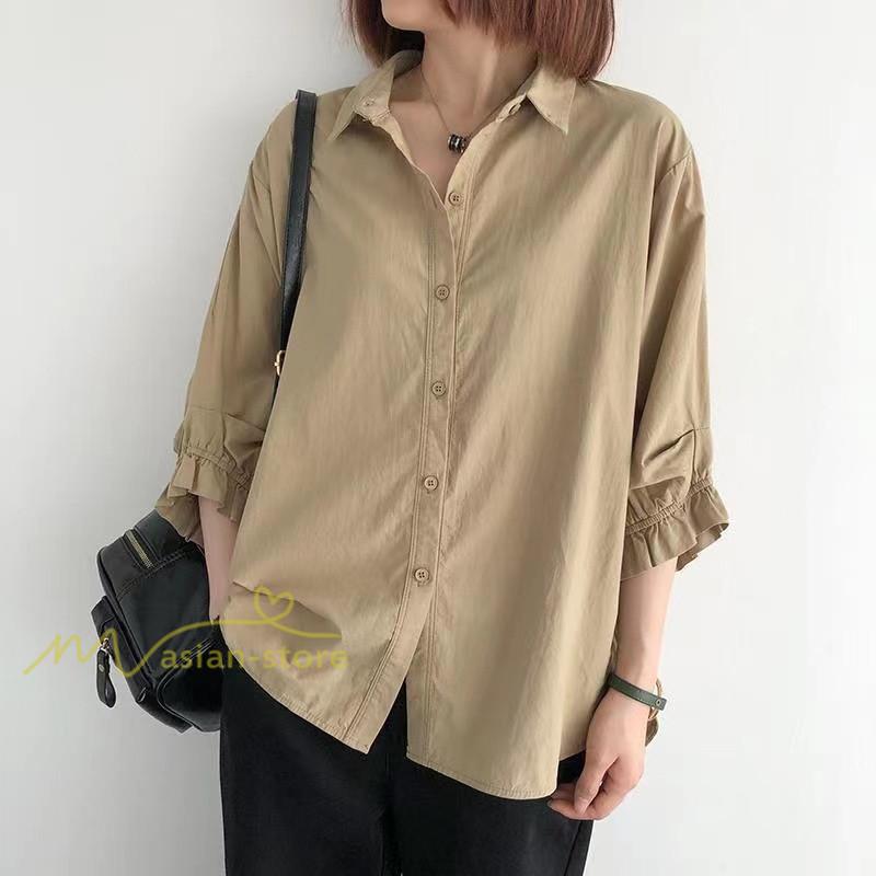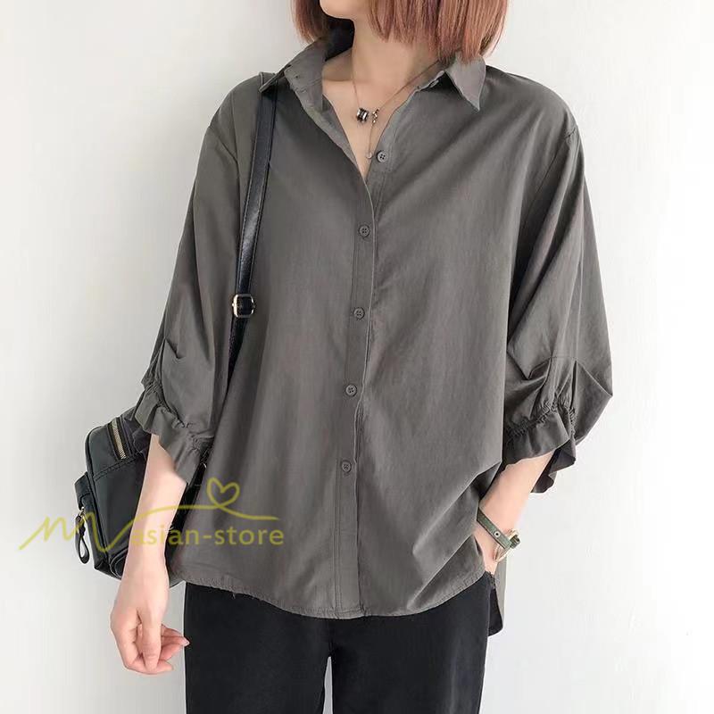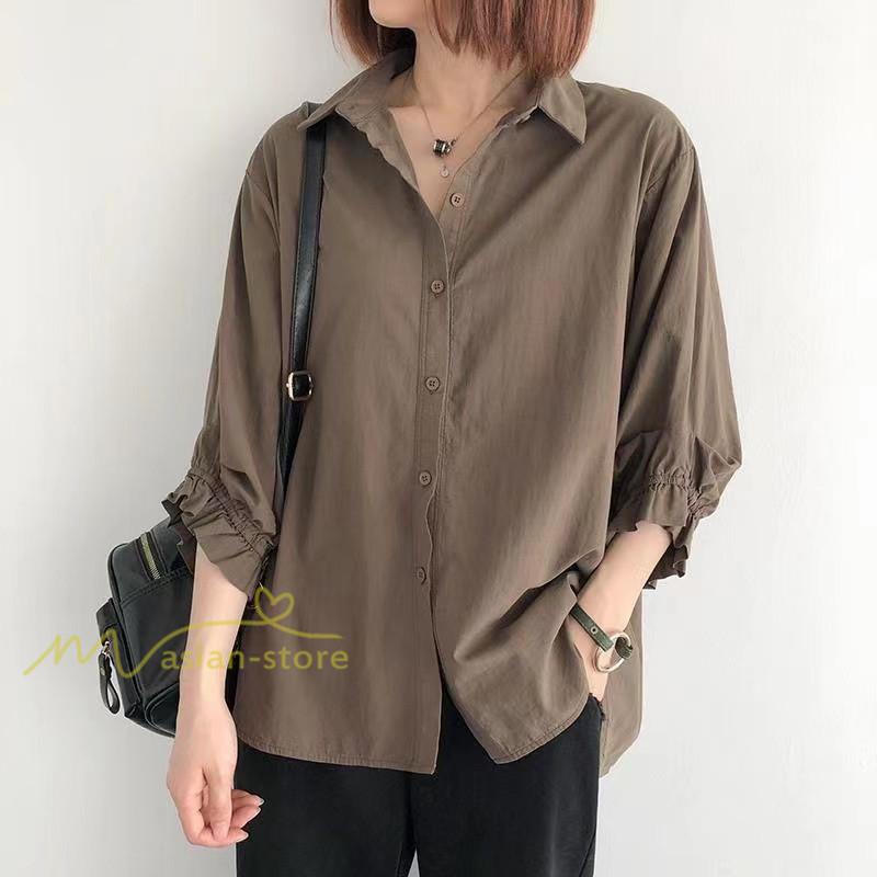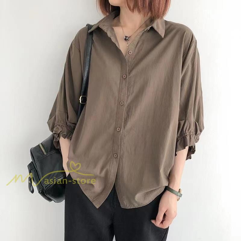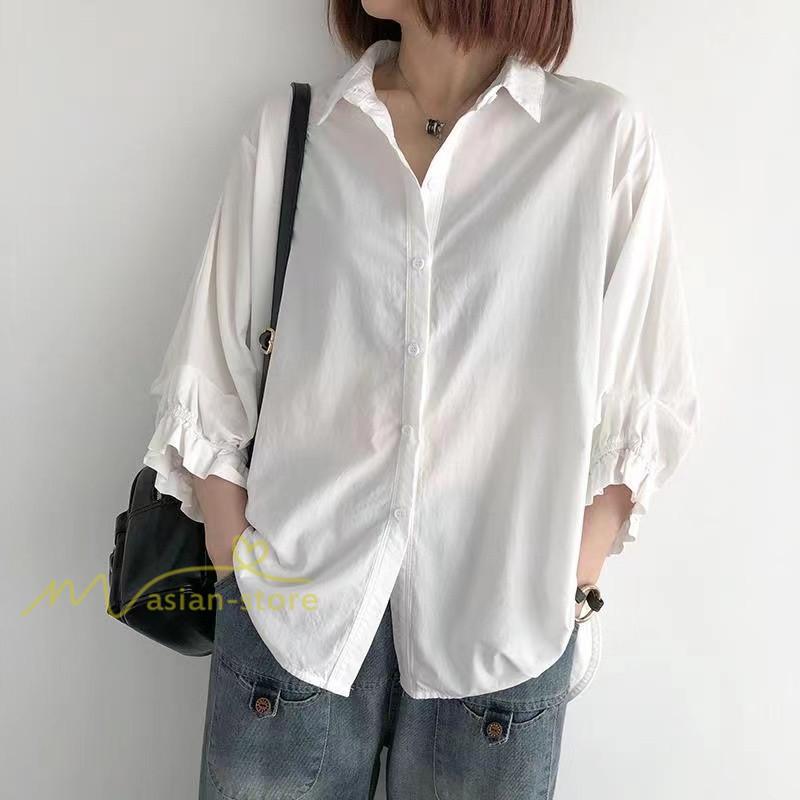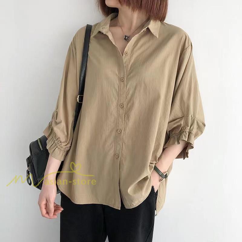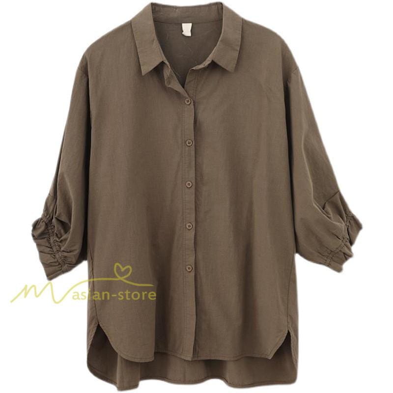 シャツ レディース 七分袖 開襟シャツ 夏物 トップス ボタン 無地 30代40代50代 vネック 前後差 チュニック丈 ワイド 可愛い ギャザー袖口 裾ラウンド