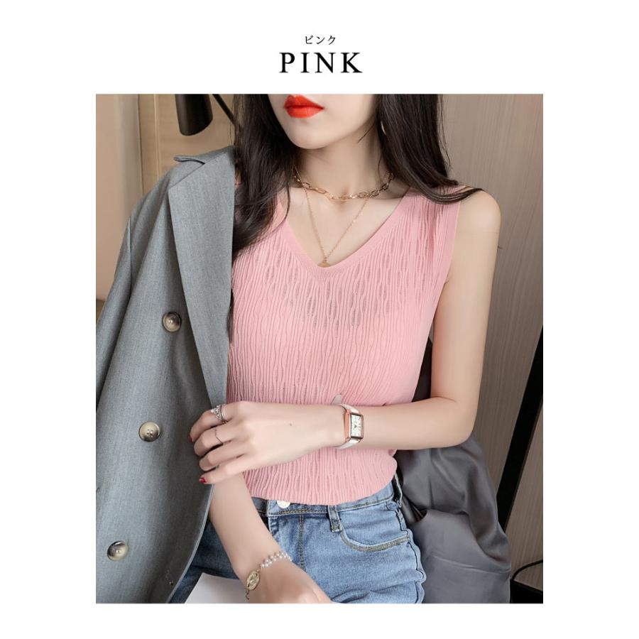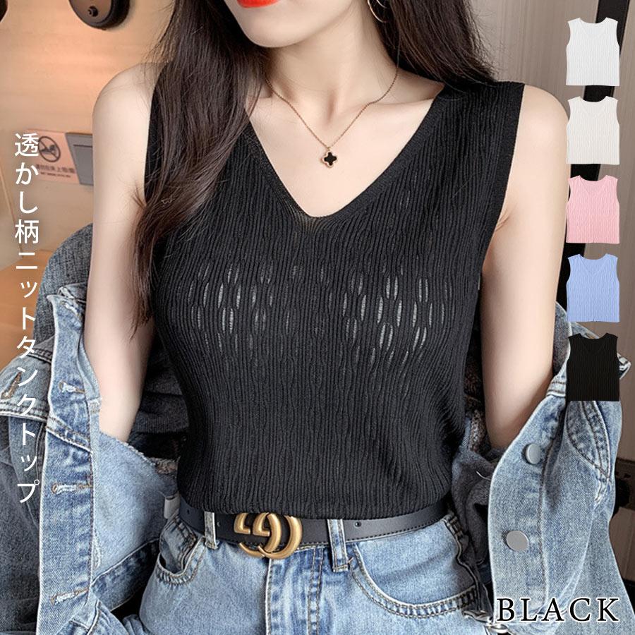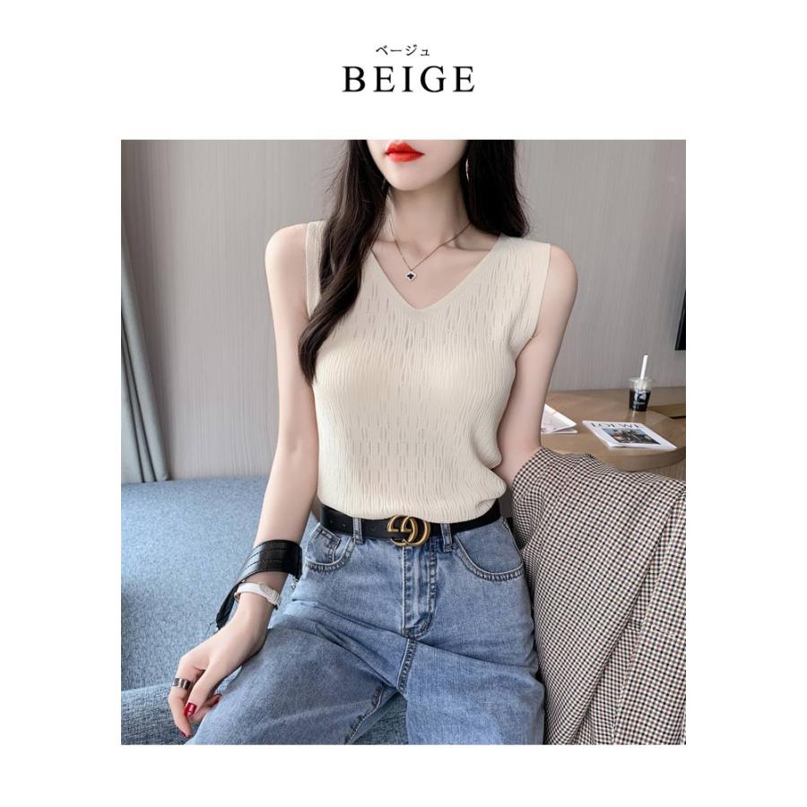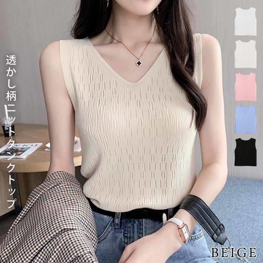 ニットトップス レディース 春 黒 白 タンクトップ ブラック ホワイト ベージュ ピンク ブルー ノースリーブ サマーニット Vネック キャミソール