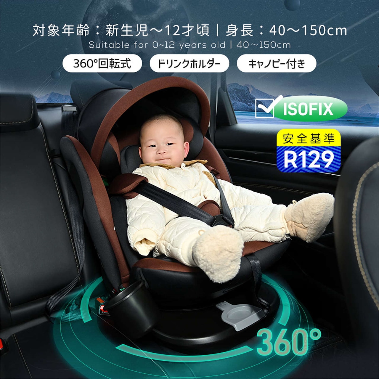 【トップテザー】EU安全規格安全基準R129適合 チャイルドシート 新生児 ISOFIX 0歳~12歳 360度回転式 40~150cm ジュニアシート サポートレッグ 調節可能 洗える キャノピー付き 長く使える 取付簡単 キッズシート ベビーシート ドリンクホルダー付き 出産祝い 車 赤ちゃん 子供 日焼け対策 軽量 新作