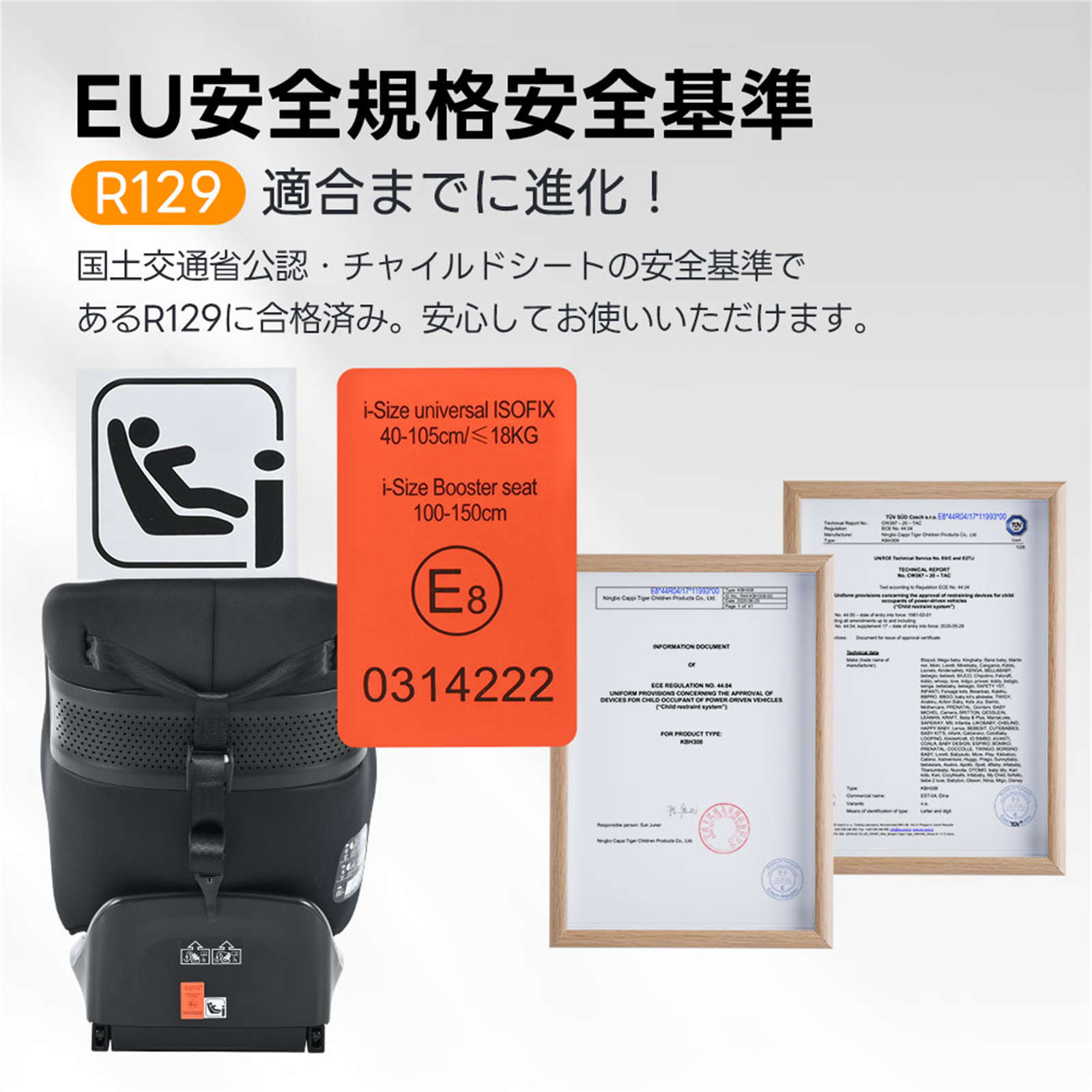国土交通省公認・チャイルドシートの安全基準であるR129に合格済み。安心してお使いいただけます。