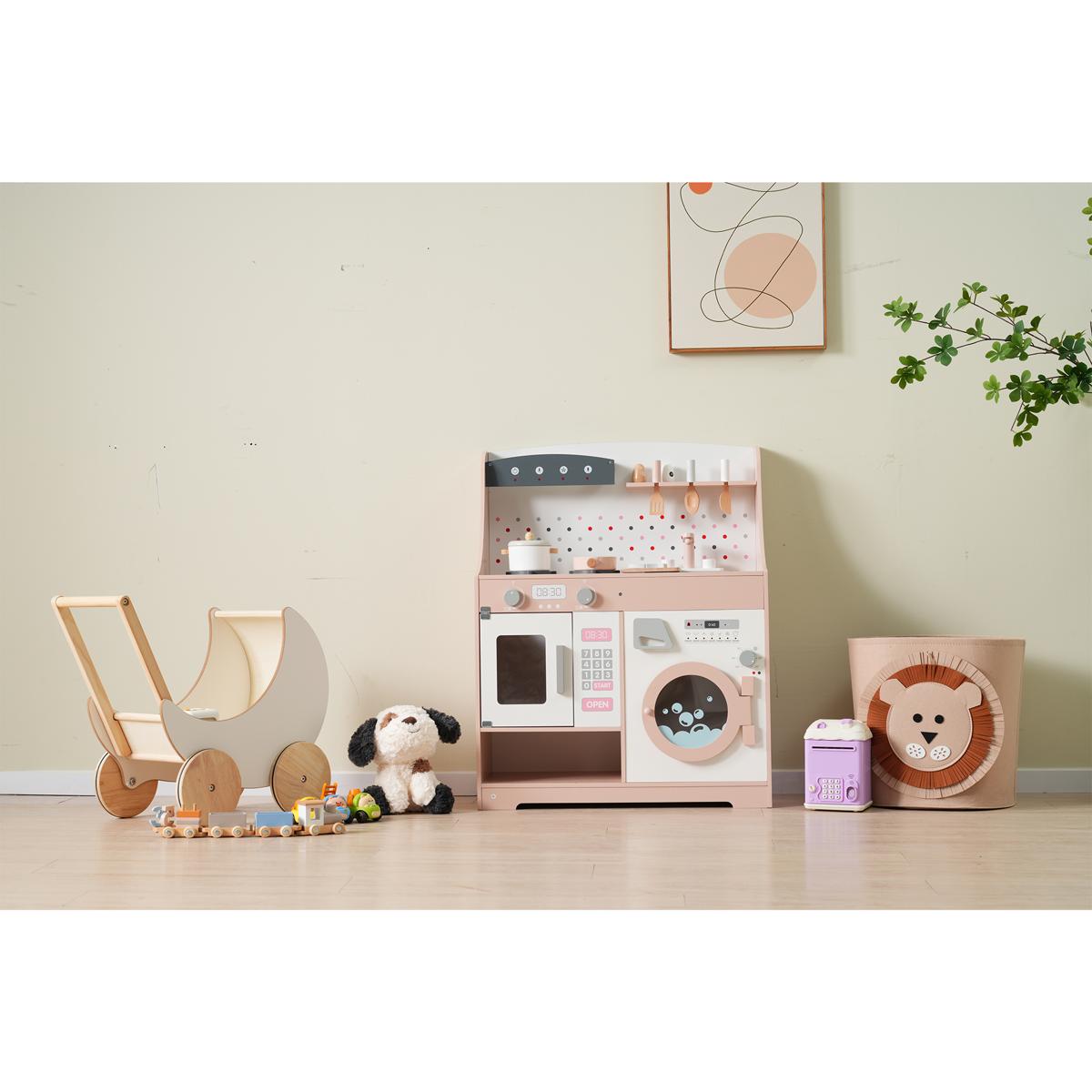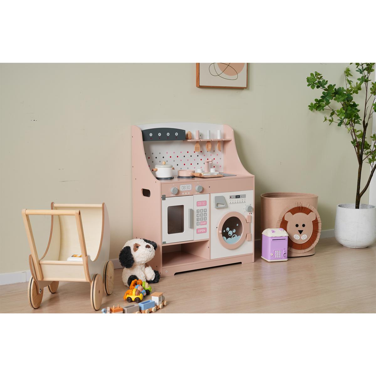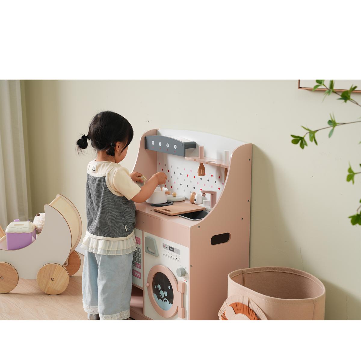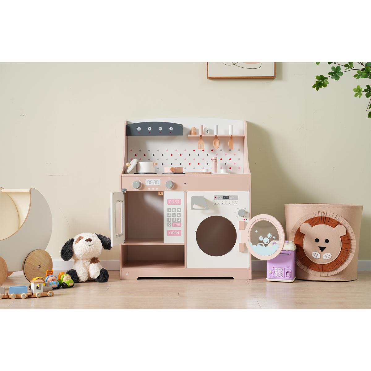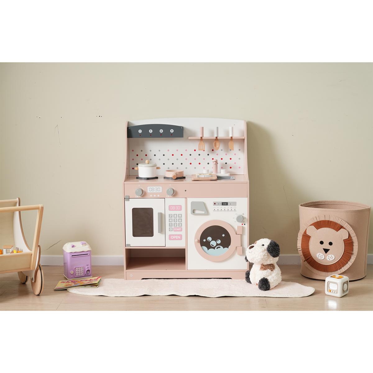 おままごと キッチン 木製 誕生日 台所 洗濯機 調理器具付き 調味料 食材 知育玩具 おもちゃキッチン キッズ ベビー Pink MDF