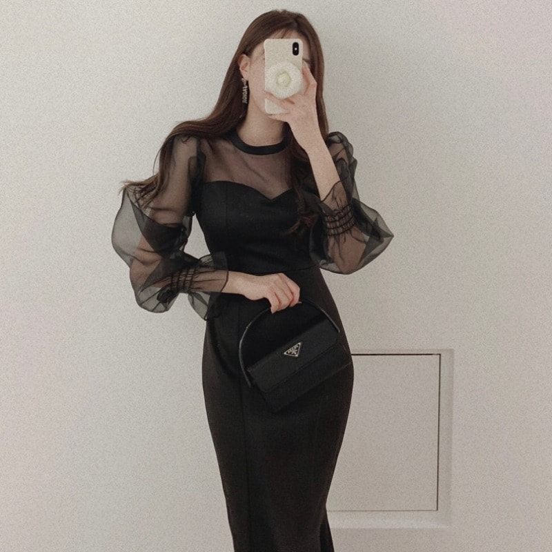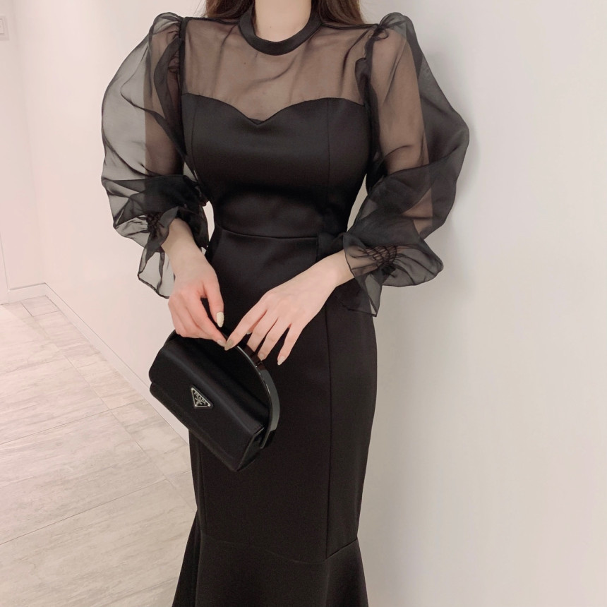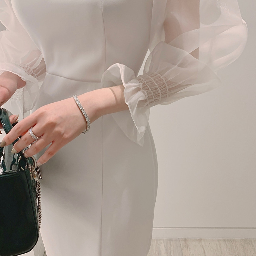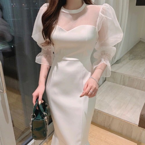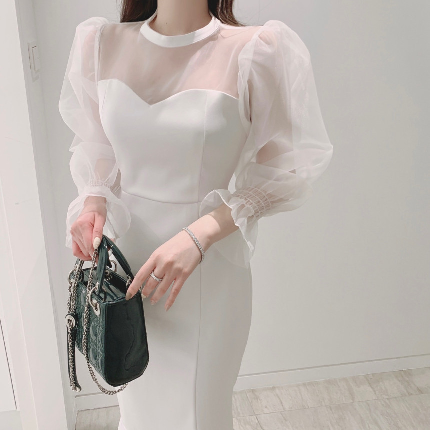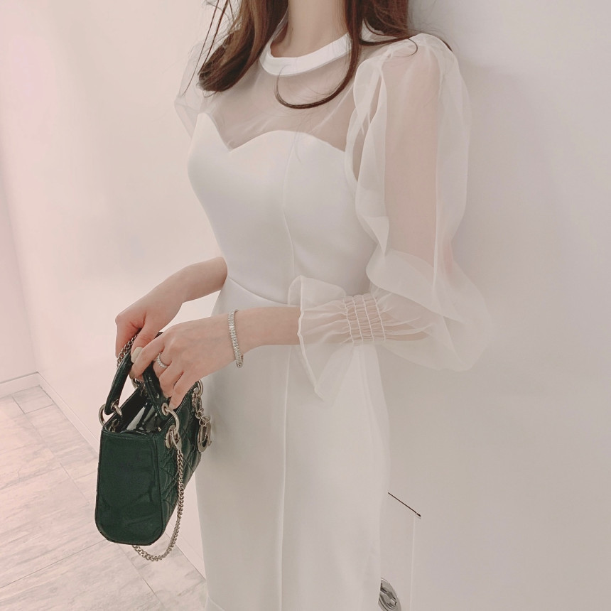 便利 2wayシフォンワンピース 気質 OL 通勤 ワンピースレディース 丸ネック メッシュ バブル袖 ワンピース シャツワンピ