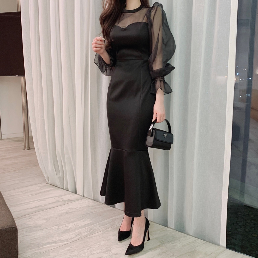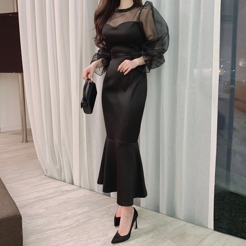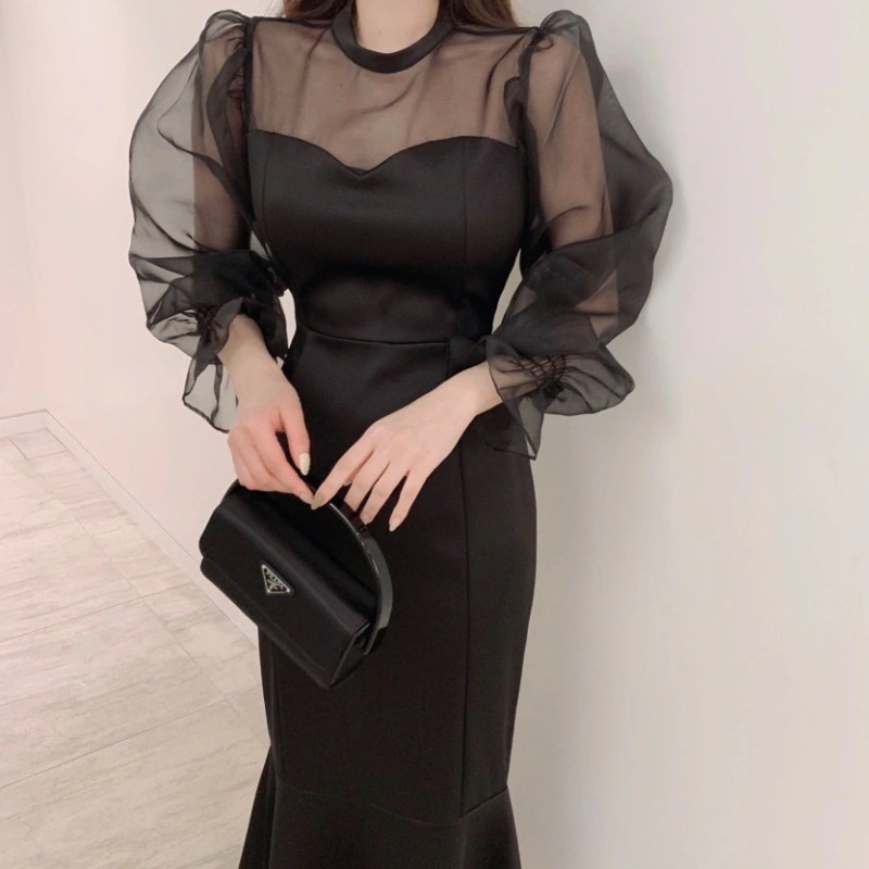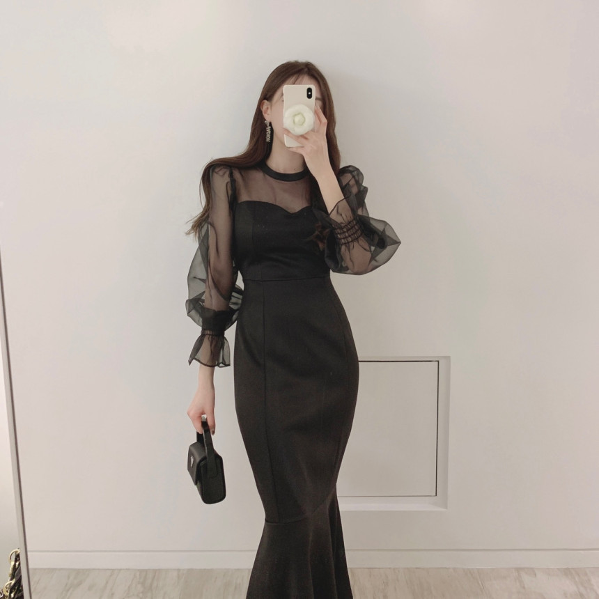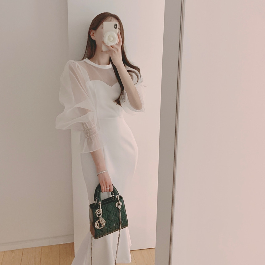便利 2wayシフォンワンピース 気質 OL 通勤 ワンピースレディース 丸ネック メッシュ バブル袖 ワンピース シャツワンピ
