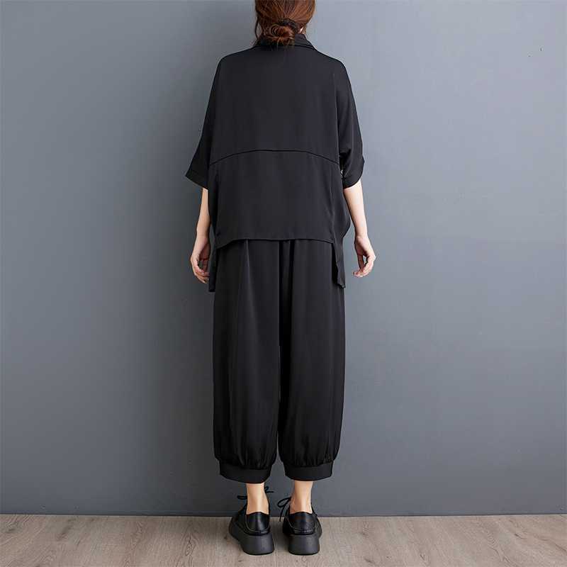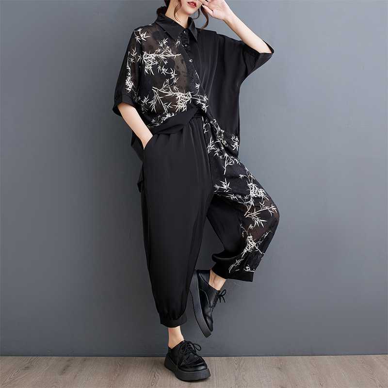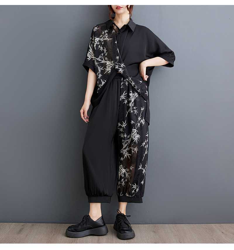 2025夏新品 上下セット 竹柄 七分袖ブラウス+九分丈ワイドパンツ 大きいサイズ 体型カバー レディース セットアップ メガ割