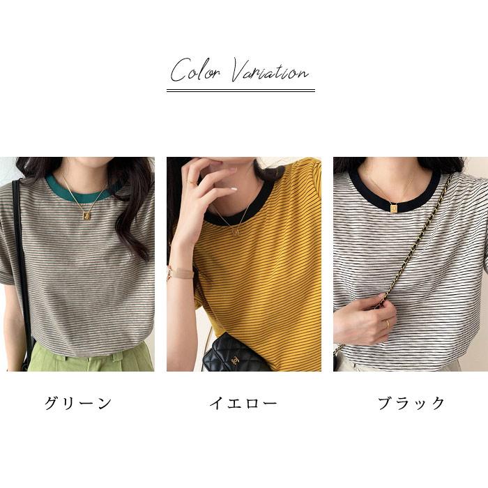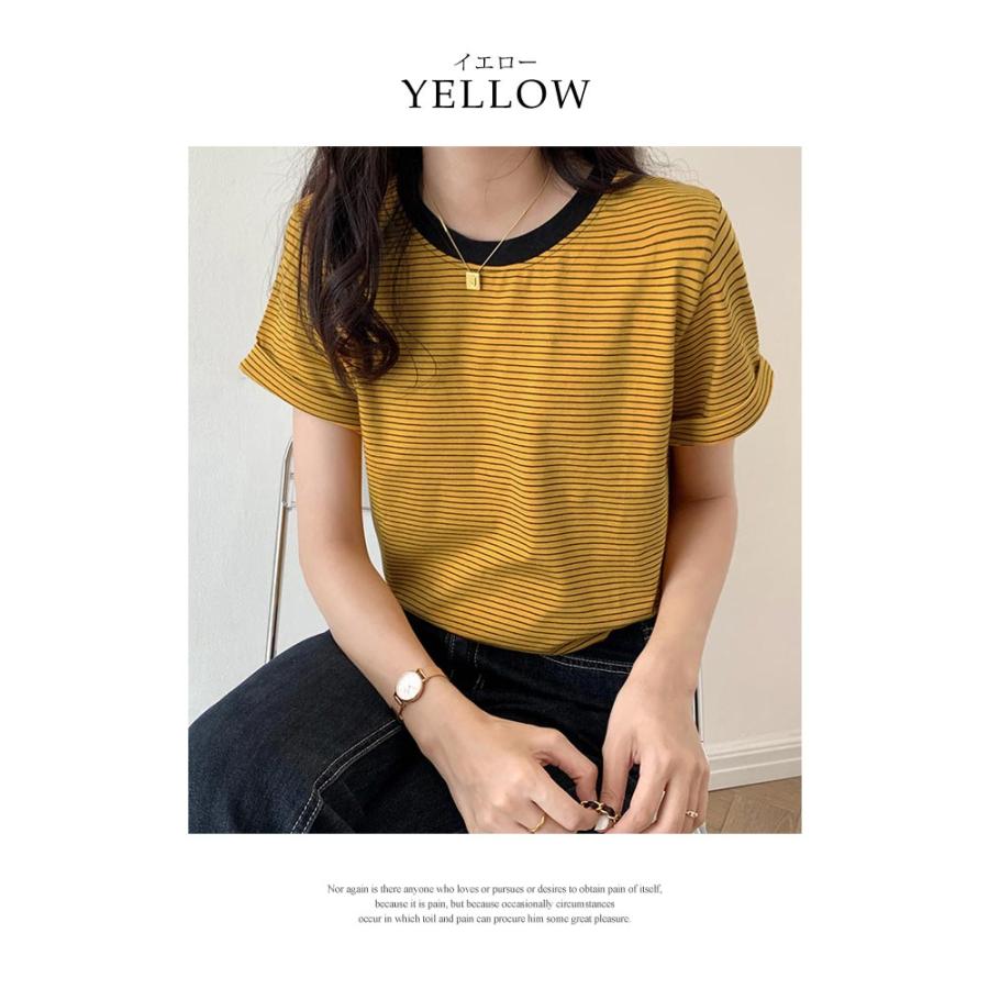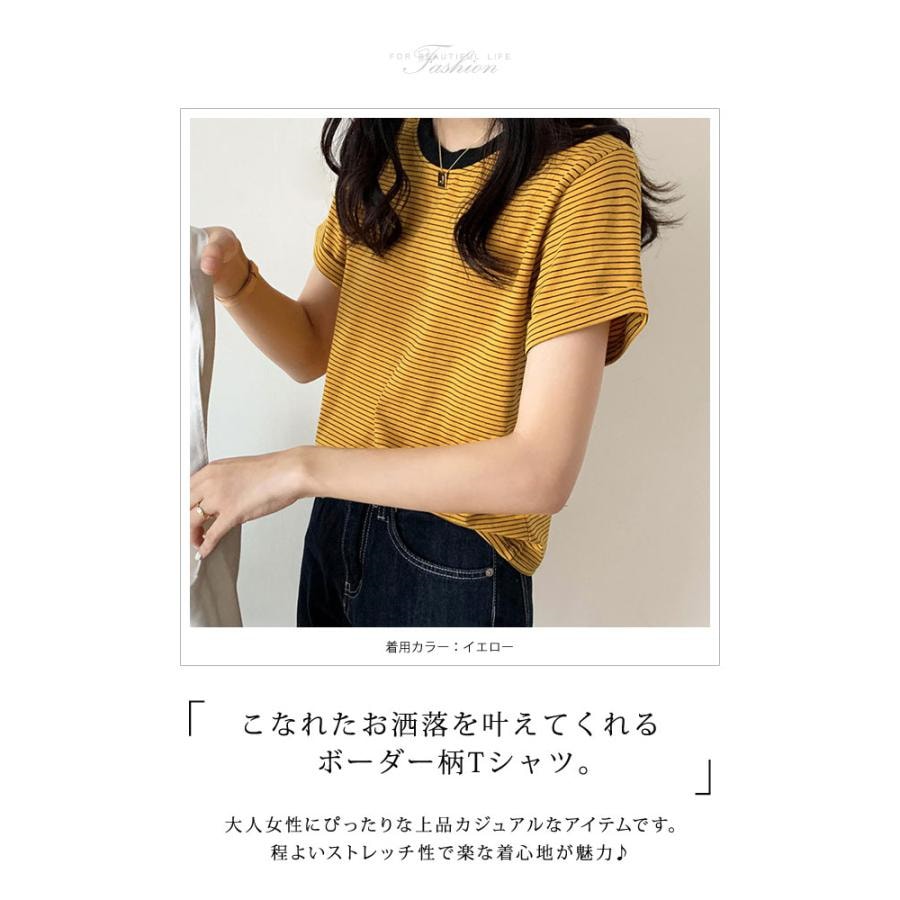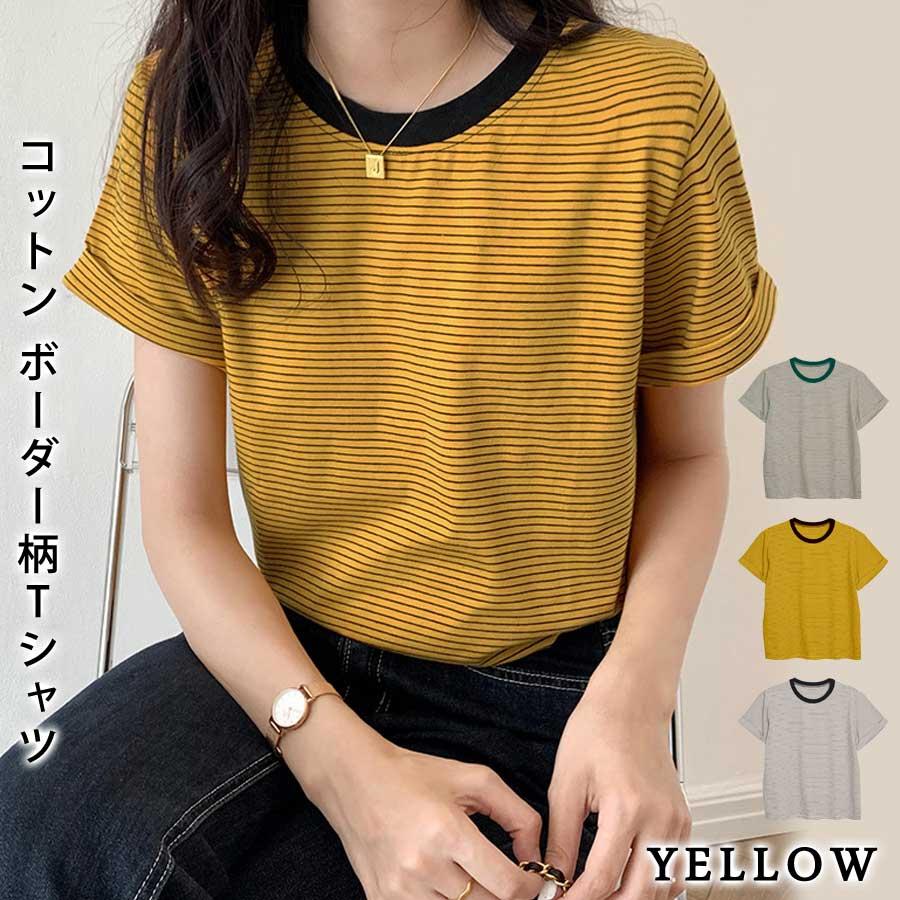 Tシャツ レディース 春 夏 春夏 黒 ボーダー 半袖 トップス ボーダー イエロー ブラック ストレッチ 半袖Tシャツ Uネック グリーン 20代 30代