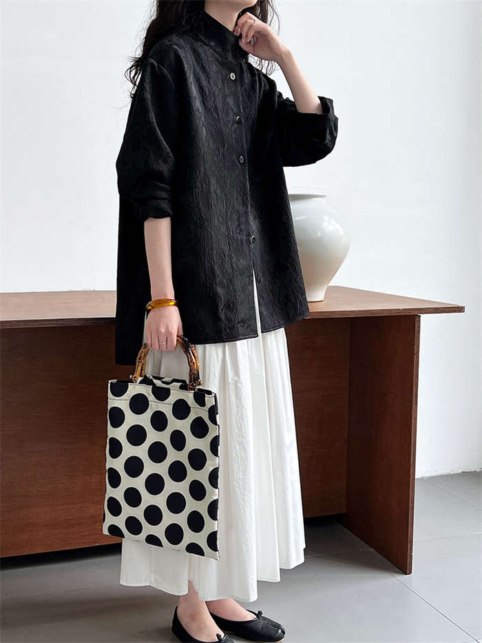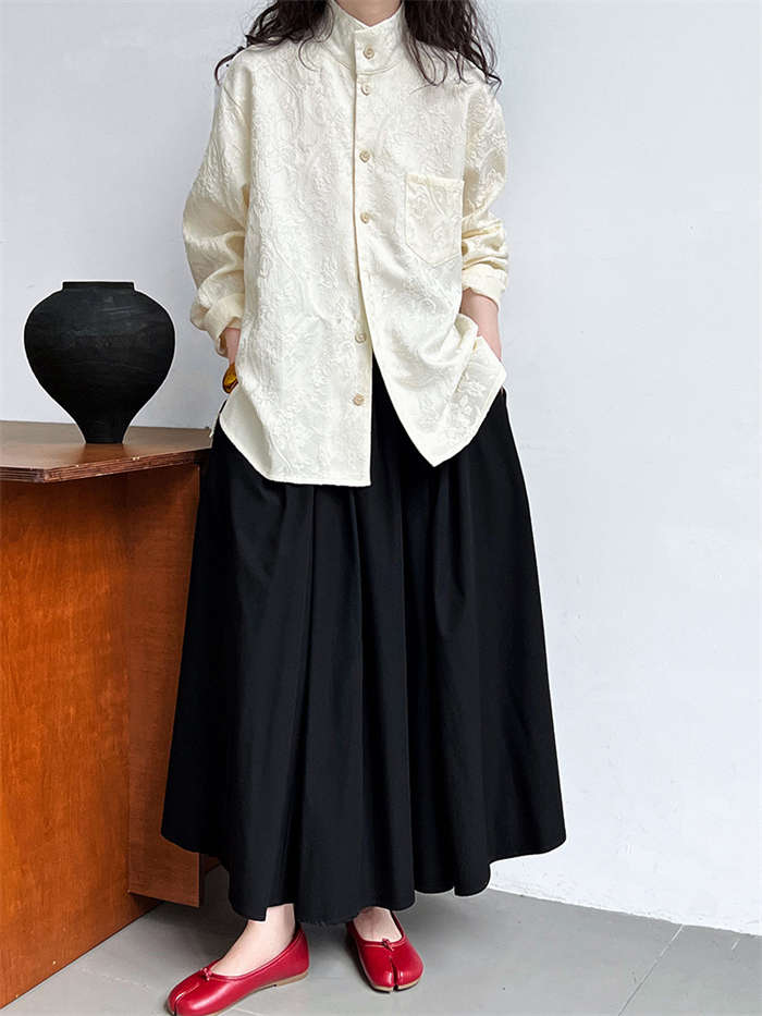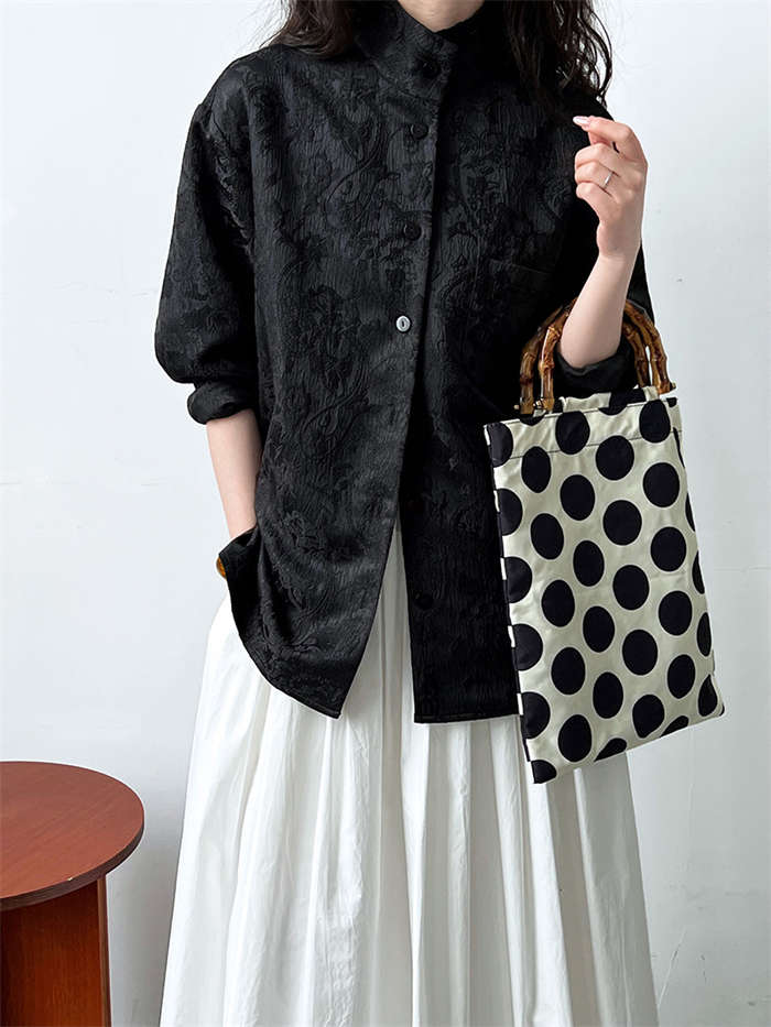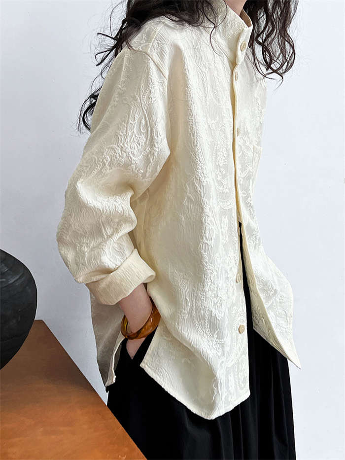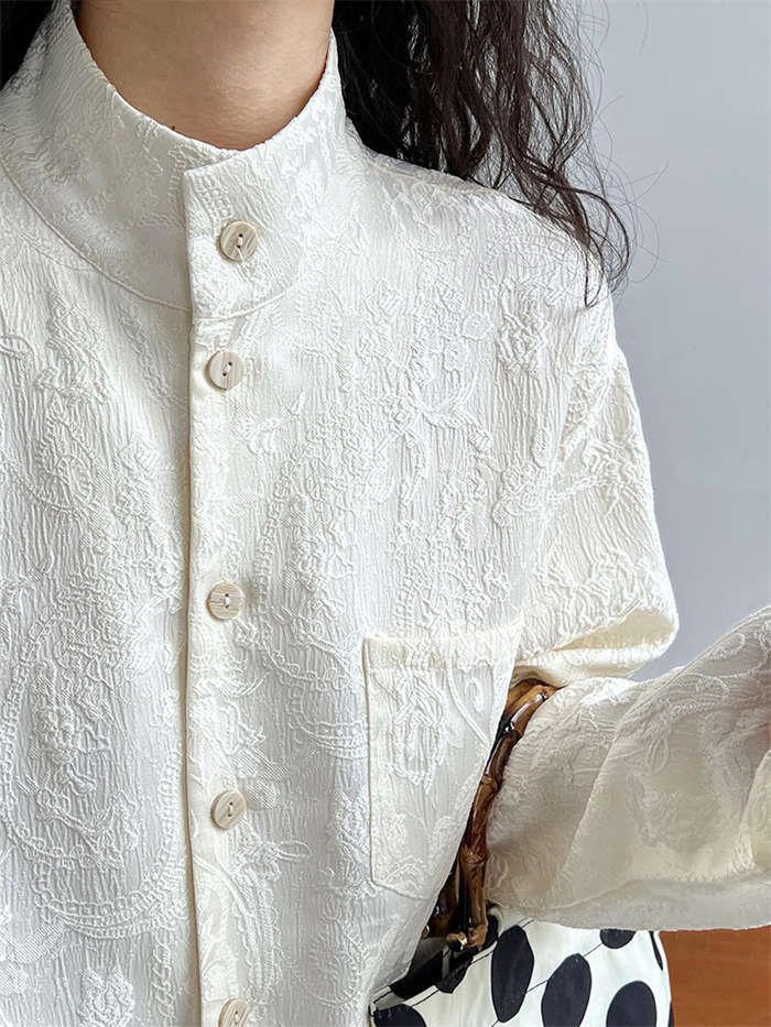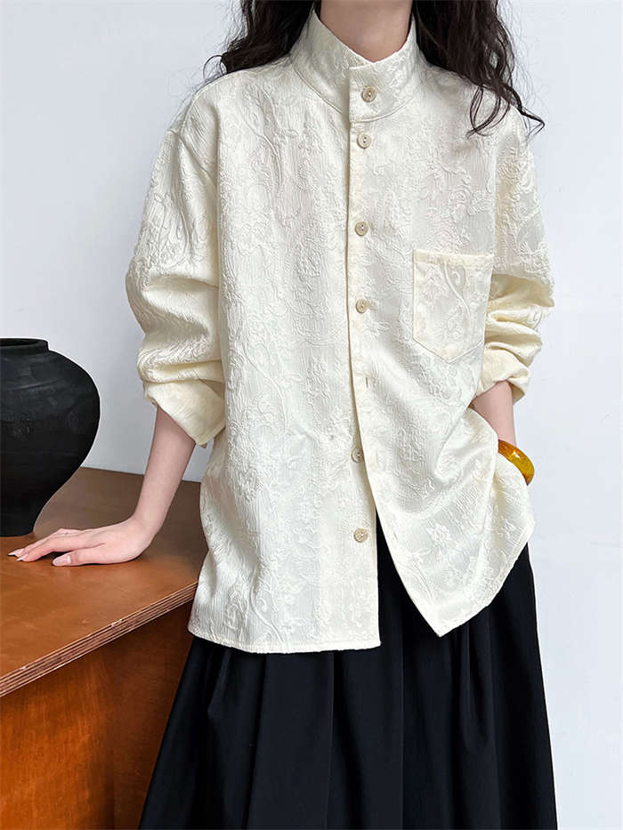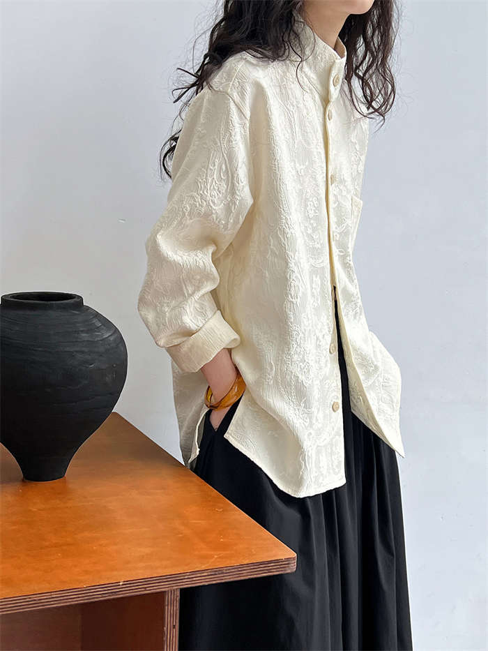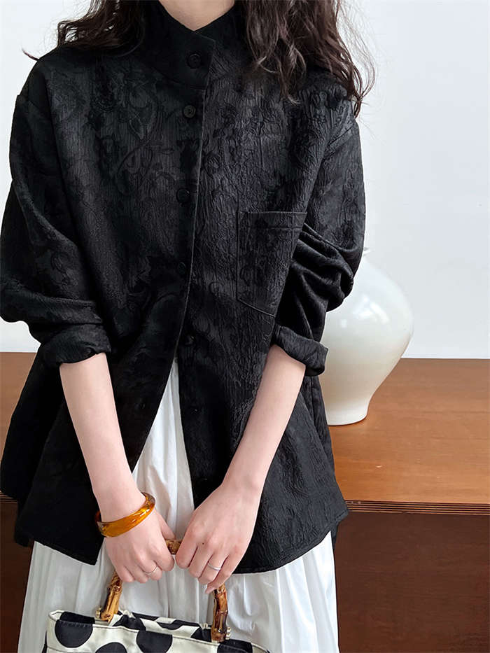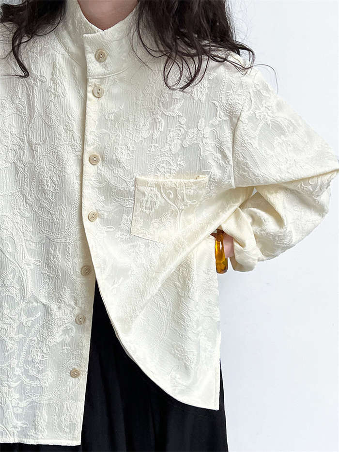 シャツ レディース ブラウン ジャケット 長袖 立体 花柄 シャツ 春 秋 夏 トップス 羽織り 前開き スタンドカラー チャイナシャツ チュニック チャイナ風 中華 前後差 フェミニン ゆったり カ