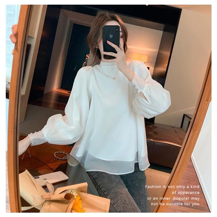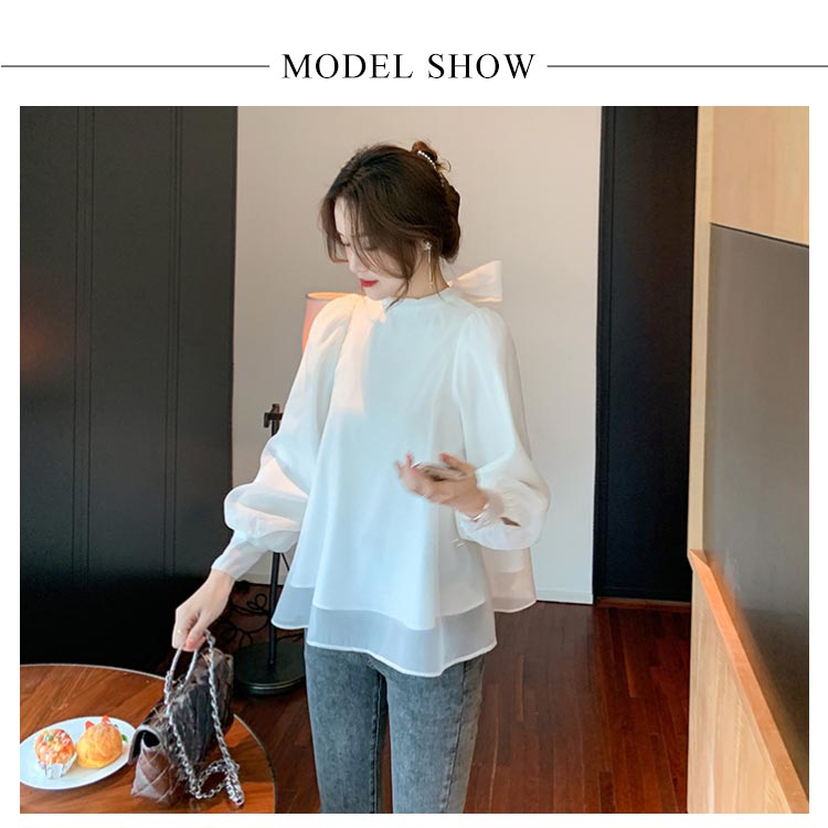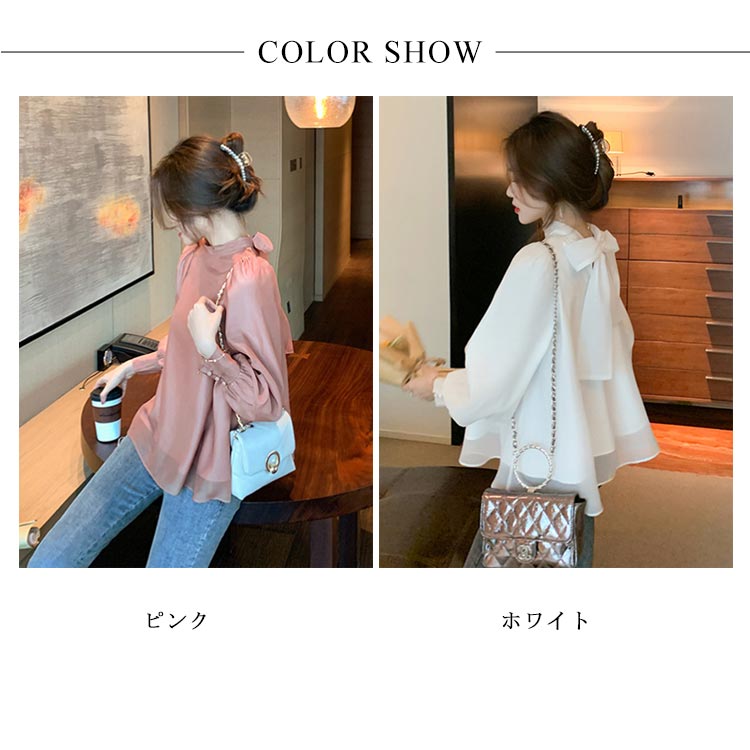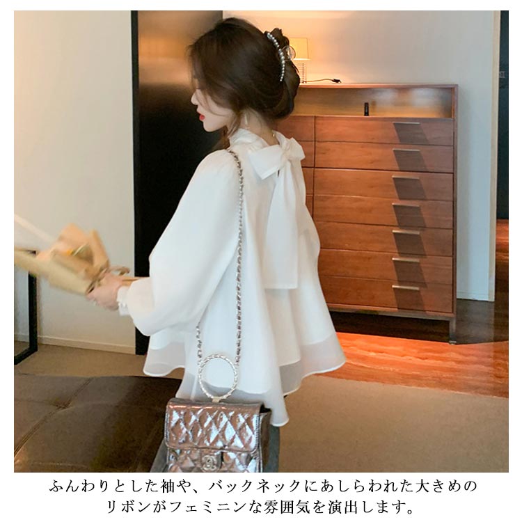 レディースパフスリーブボウタイブラウスAラインスタンドカラーブラウス長袖大人可愛いハイネックMボリューム袖Lトップス体型カバーゆったり春おしゃれ無地SホワイトフレアXL白バックリボン
