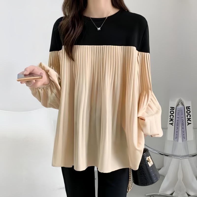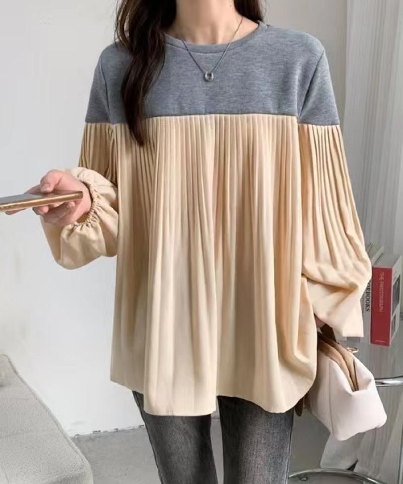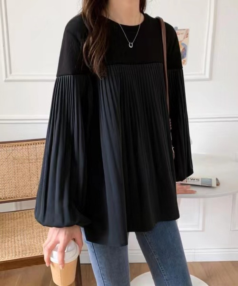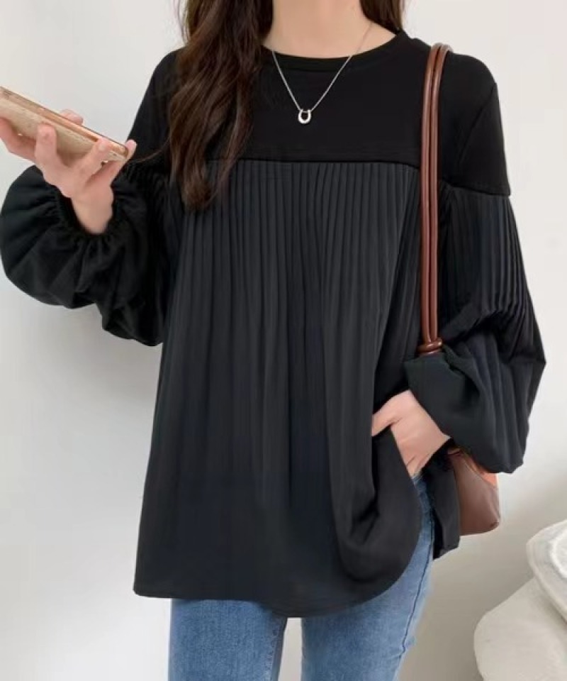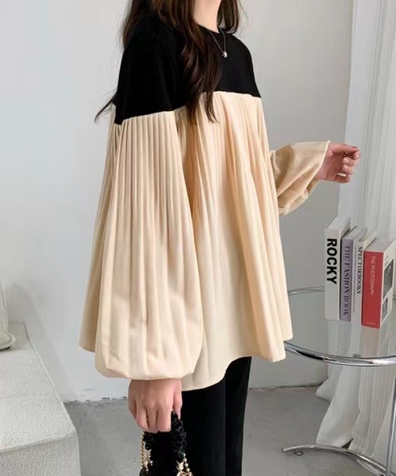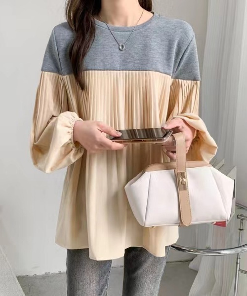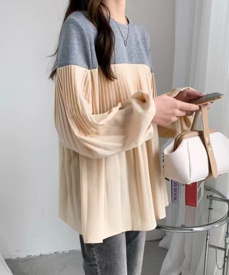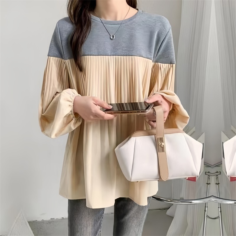 大人気新作 和モダン春トップス プリーツ&ゴムデザイン ランタンスリーブ カラーブロック長袖Tシャツ 3色 シャツ ブラウス