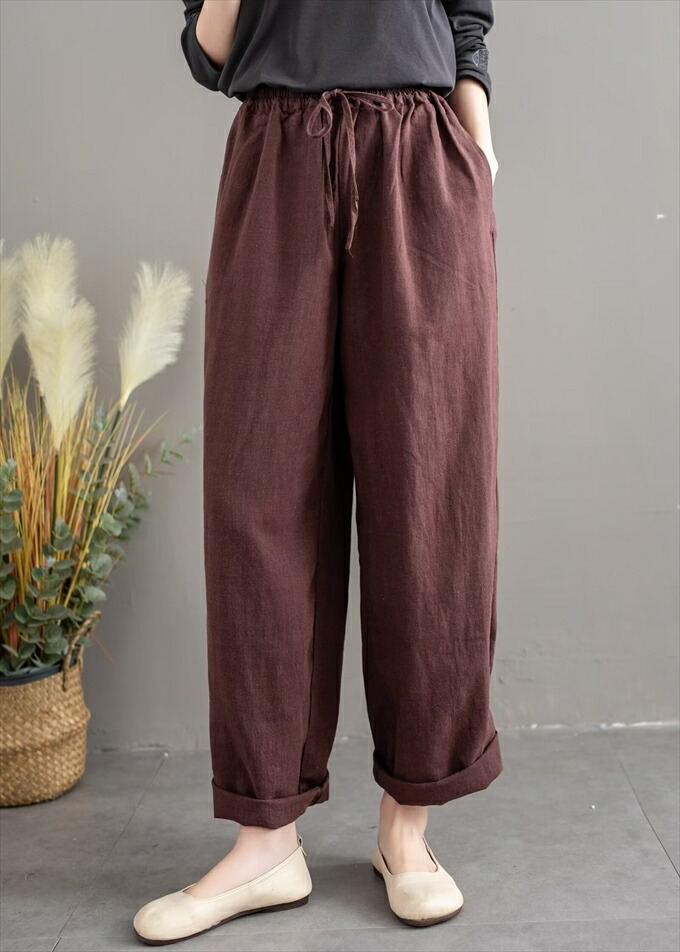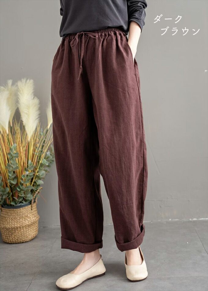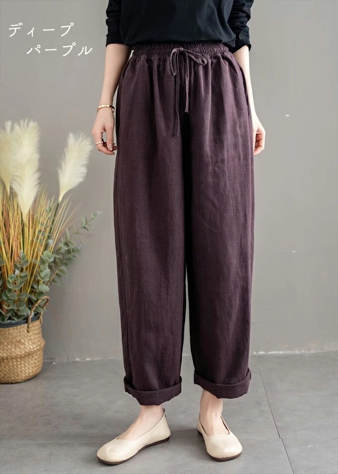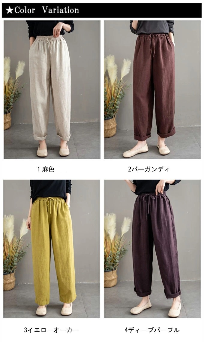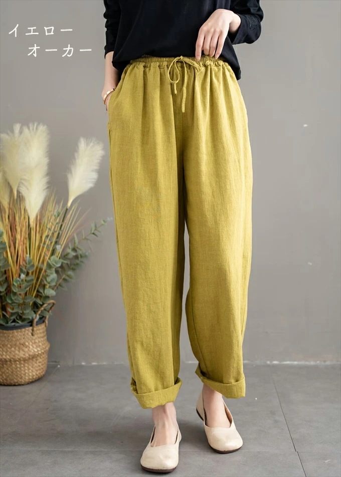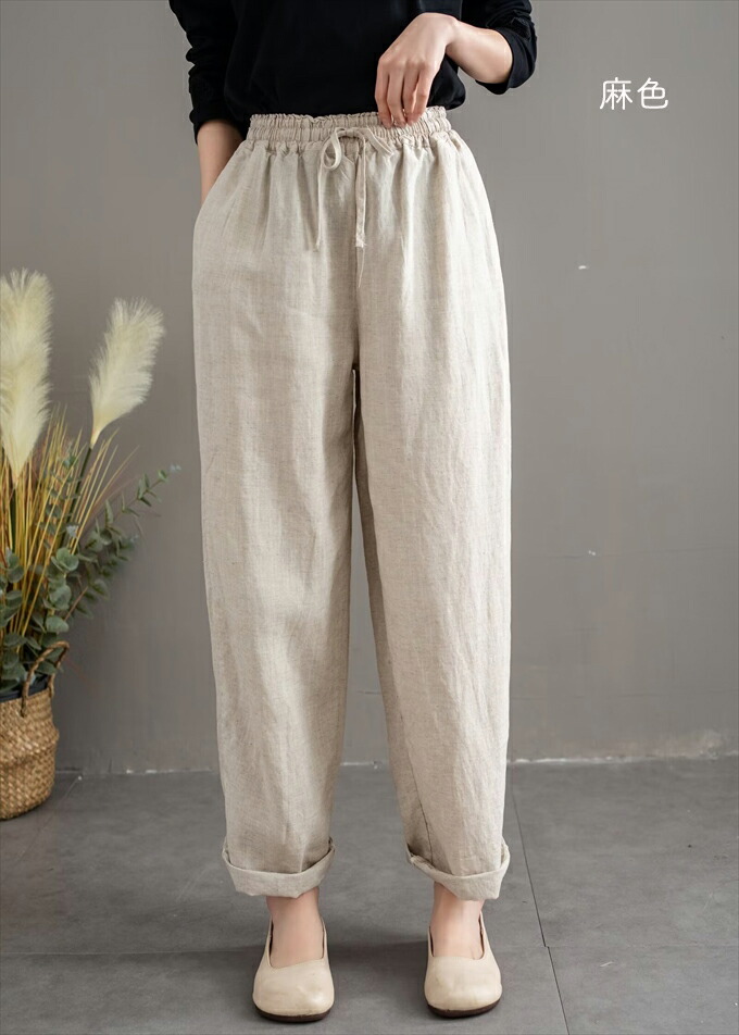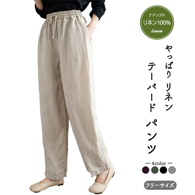 リネン100% リネンパンツ 麻パンツ レディース 春 夏 秋 涼感 テーパードパンツ 裏パイピング 春パンツ 秋パンツ 10分丈 シャリ感 ウエストゴム 4ポケット 麻色 エクリュ生成